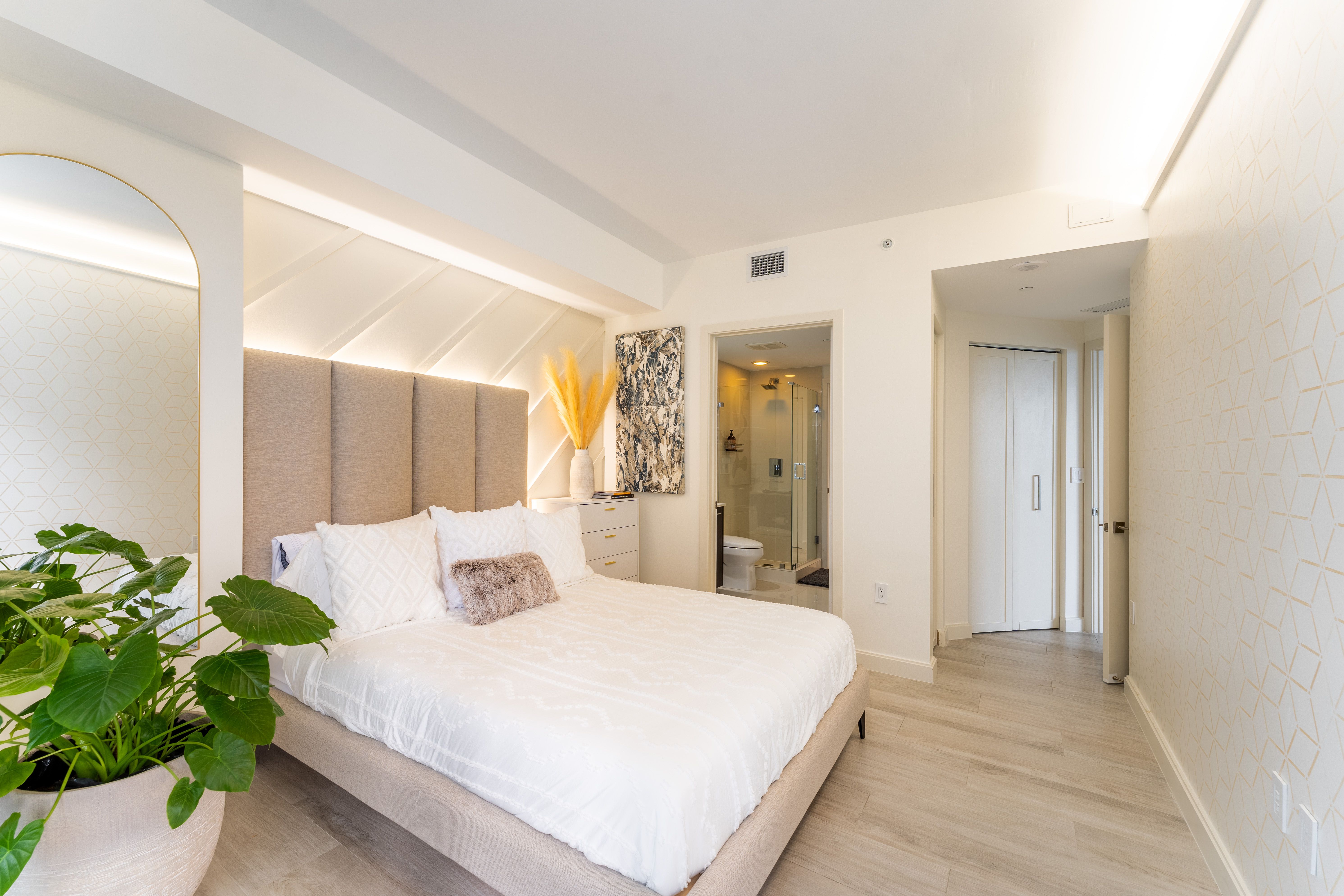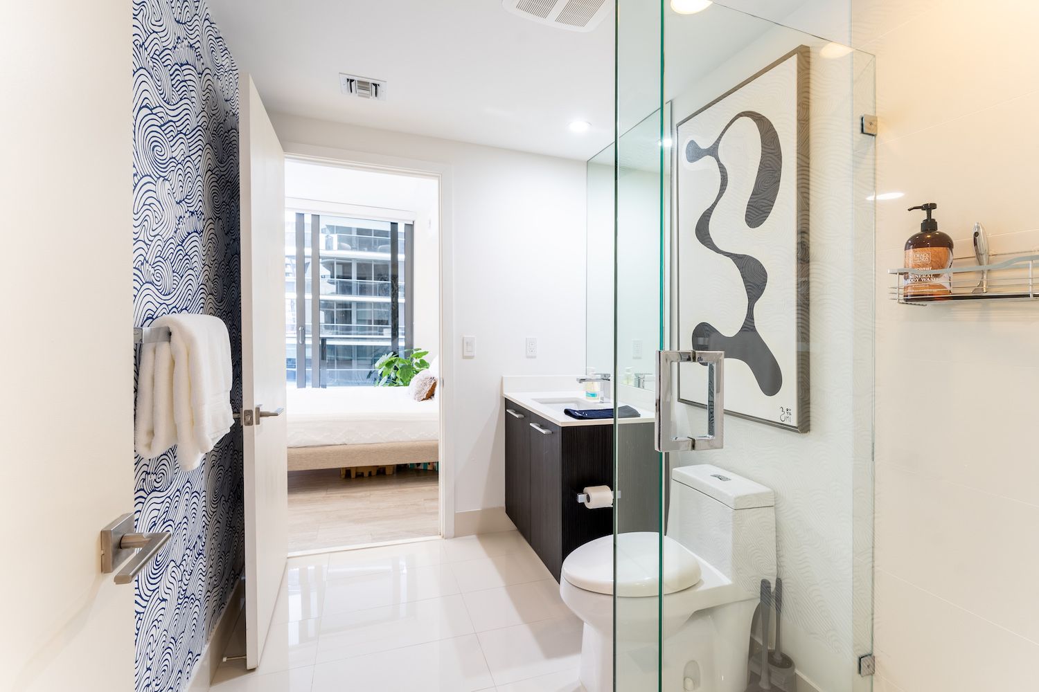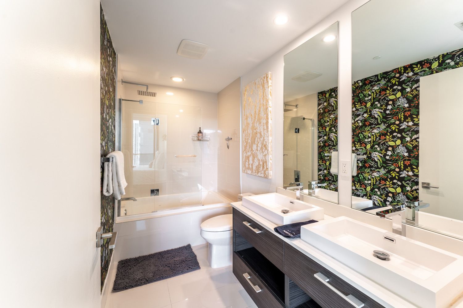 From its wrap-around glass walls, ultra-modern furnishings and marble backsplash kitchen, the space itself is perfect for a small group, couple or working professional looking for an all-in-one, family-size pad to call home for a while. Everything has been done with the sleekest of finishes, including the sumptuous bedrooms and ensuite bathrooms. Wake from your restful slumber, stagger over to the rainfall shower for a quick rinse before starting your day with morning coffee on the balcony.