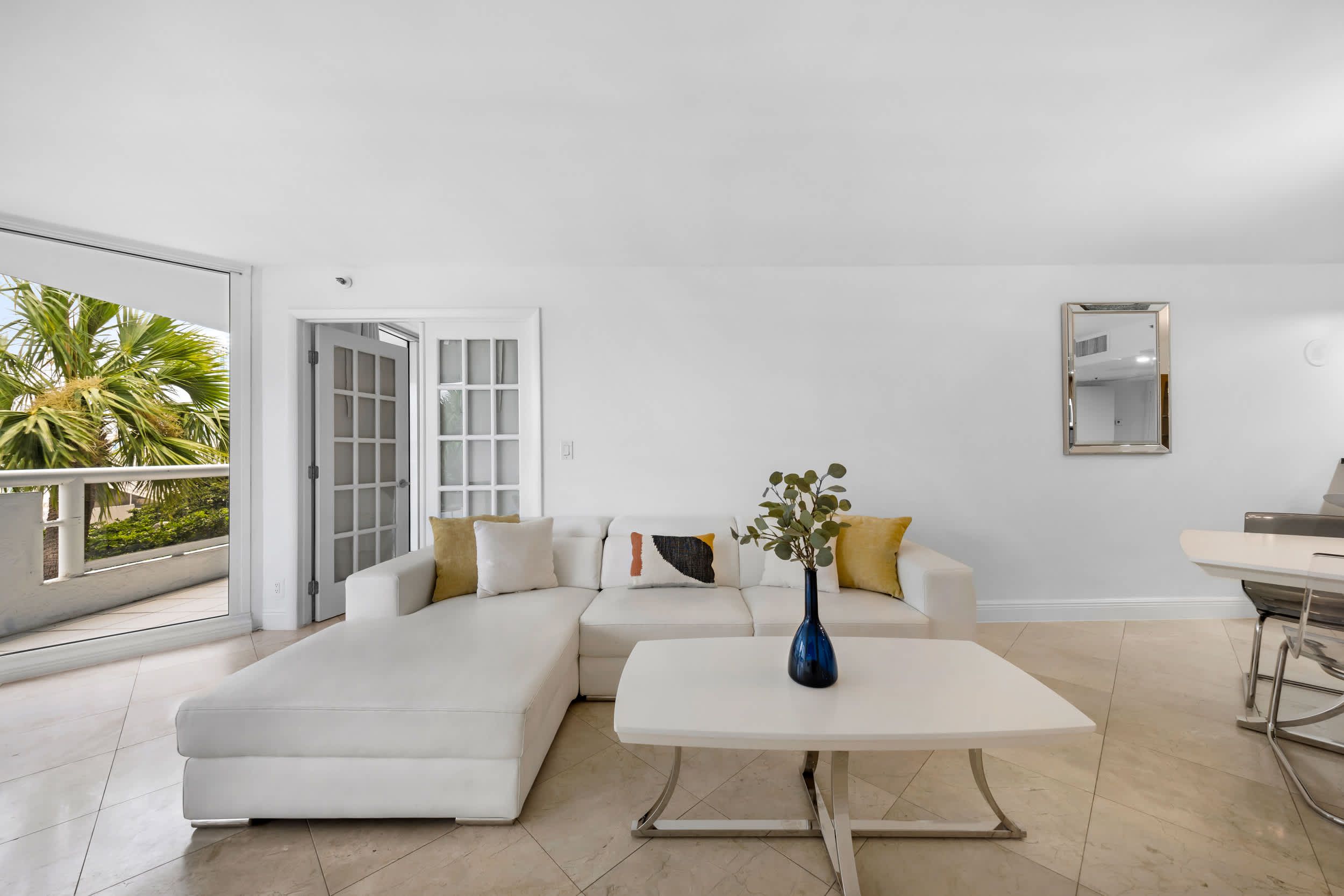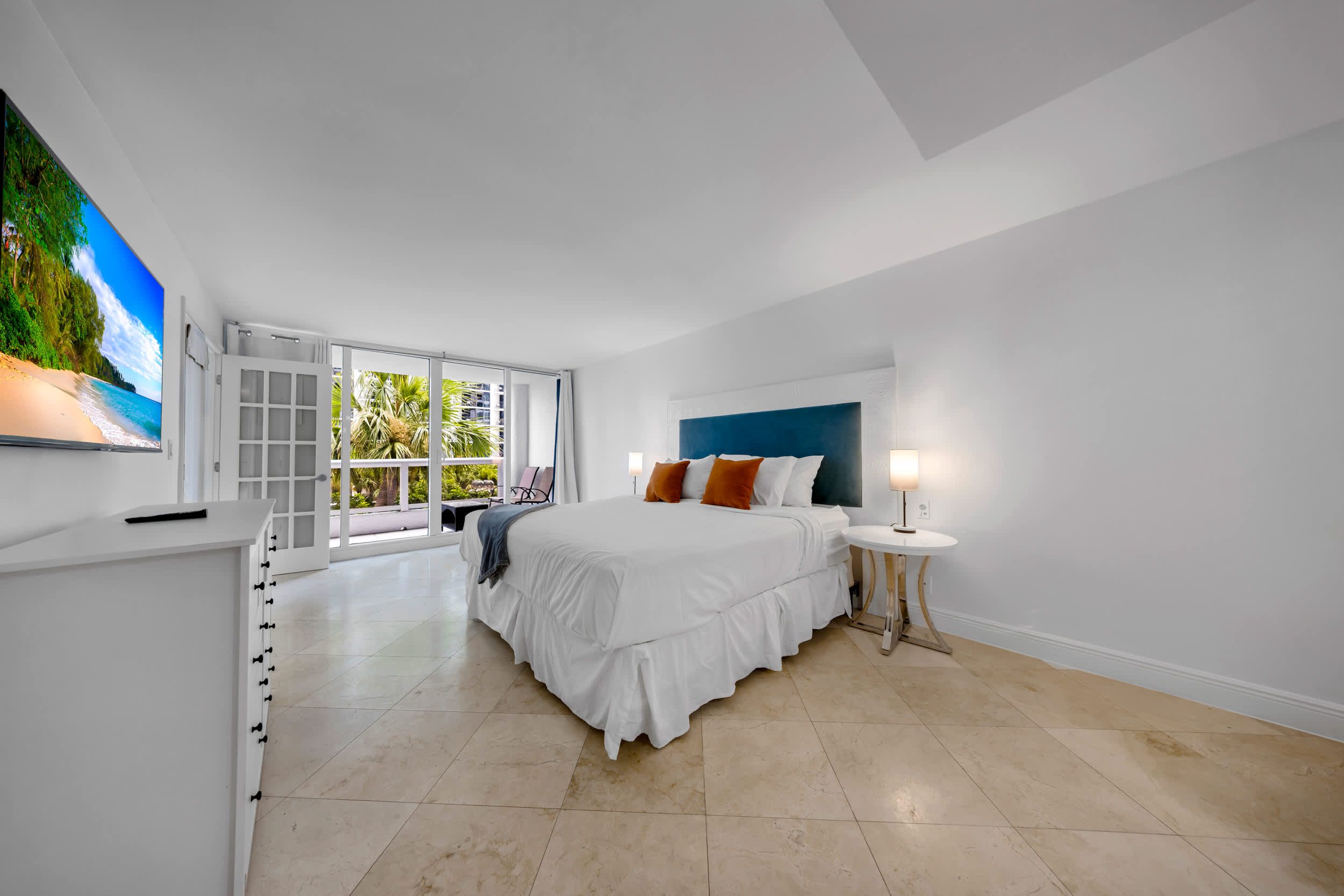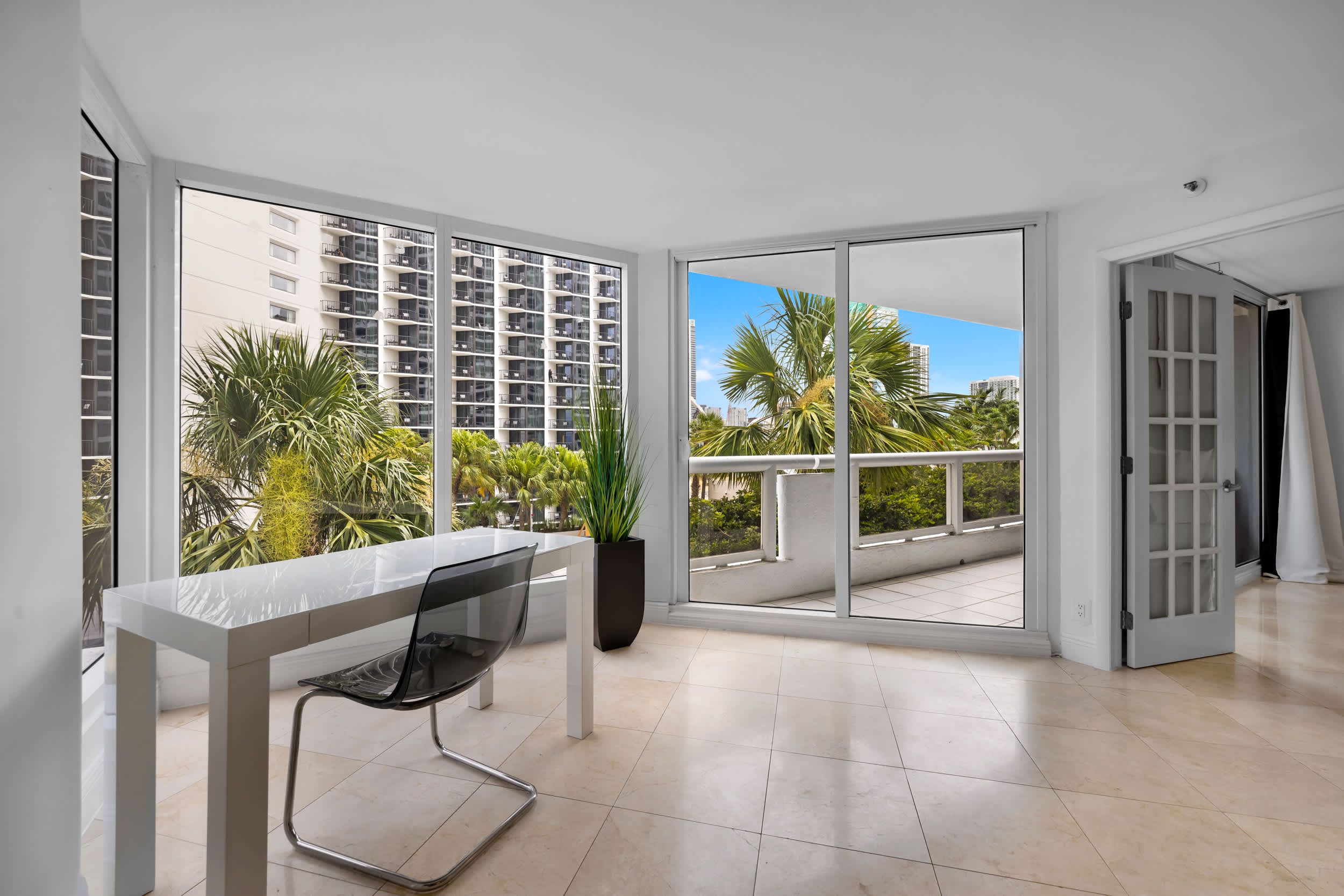 This Edgewater getaway offers modern comfort with a laid-back Miami feel. The open-plan living space is perfect for gathering, with a comfy sofa, dining table, and fully equipped kitchen with a sleek counter and bar stools. There’s even a dedicated desk for working from home. The highlight is the private balcony overlooking Biscayne Bay, where palm trees add a touch of privacy to the sweeping water views. Elsewhere, you'll be able to unwind in the shared hot tub, work out in the state-of-the-art gym, or enjoy gourmet dining – all without leaving the building. With Brickell, Miami Beach, and the Adrienne Arsht Centre just minutes away, the best of the city is at your doorstep.