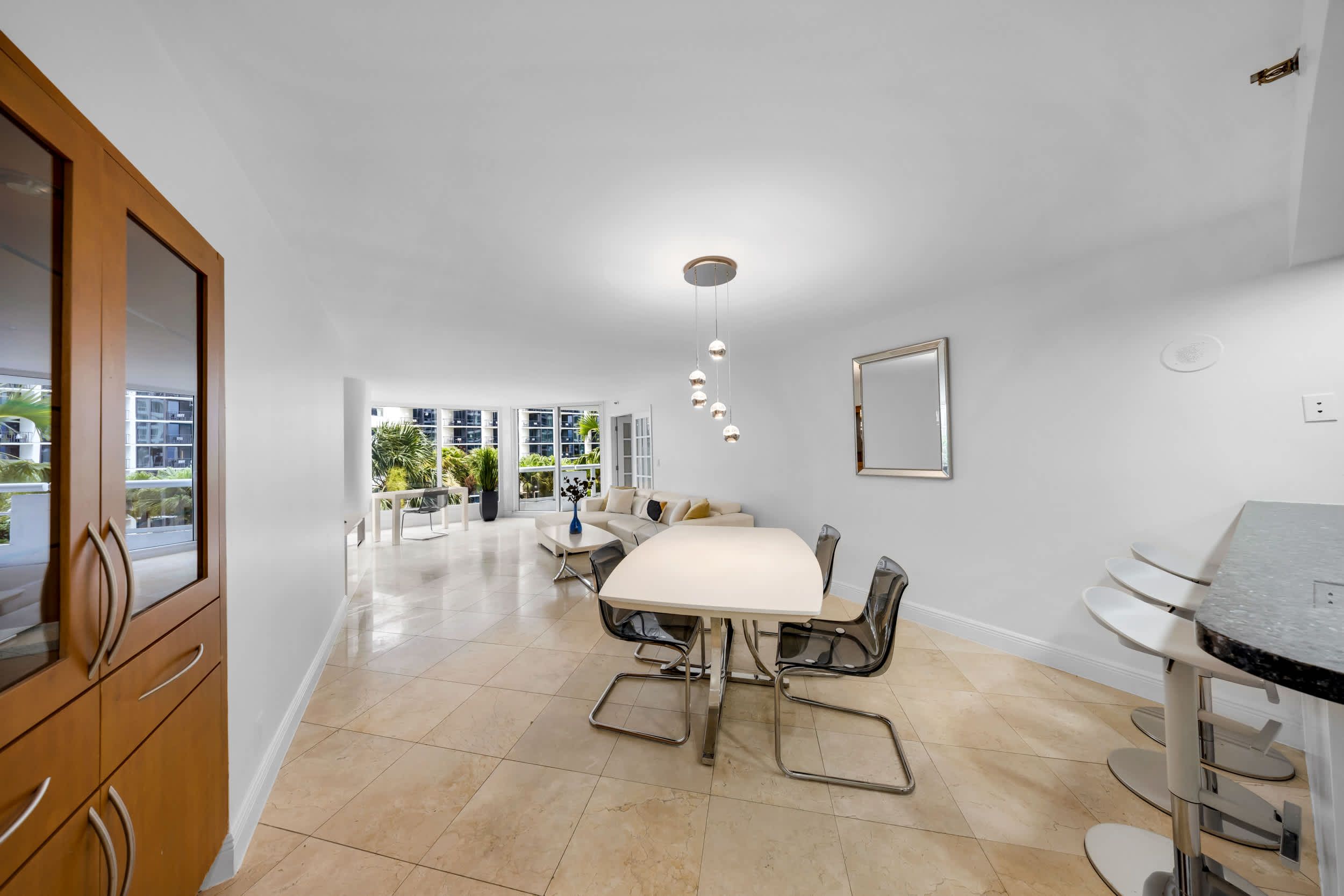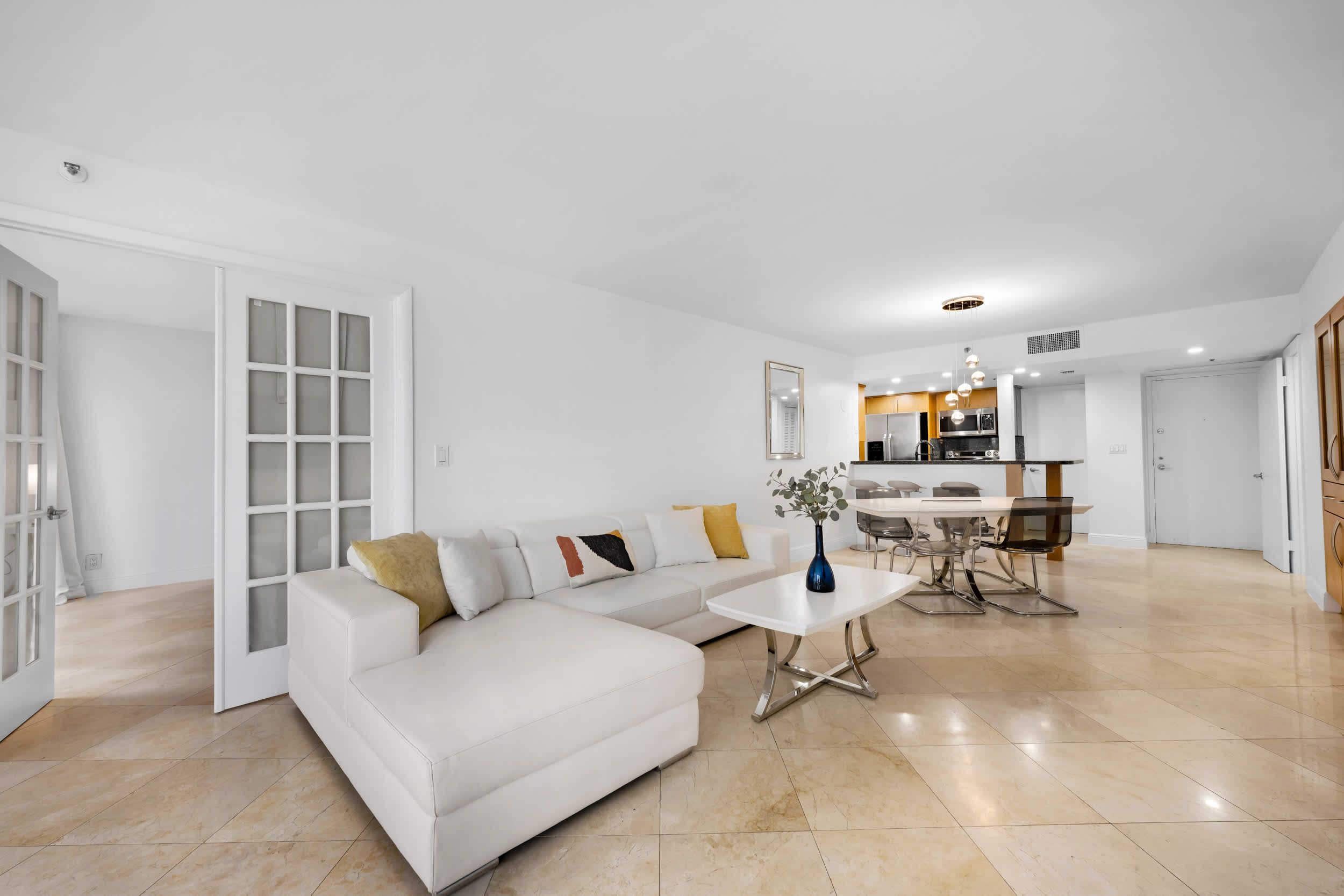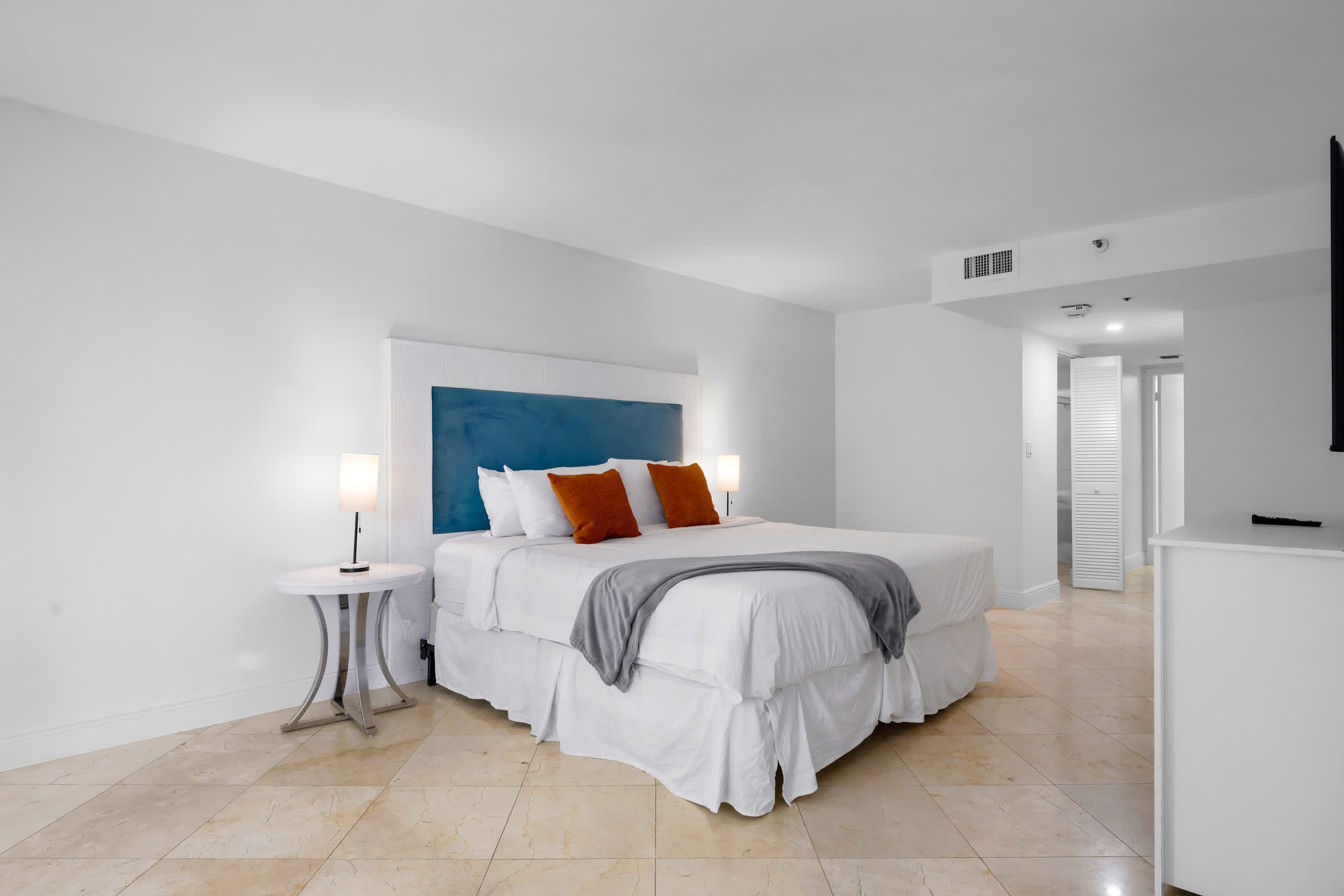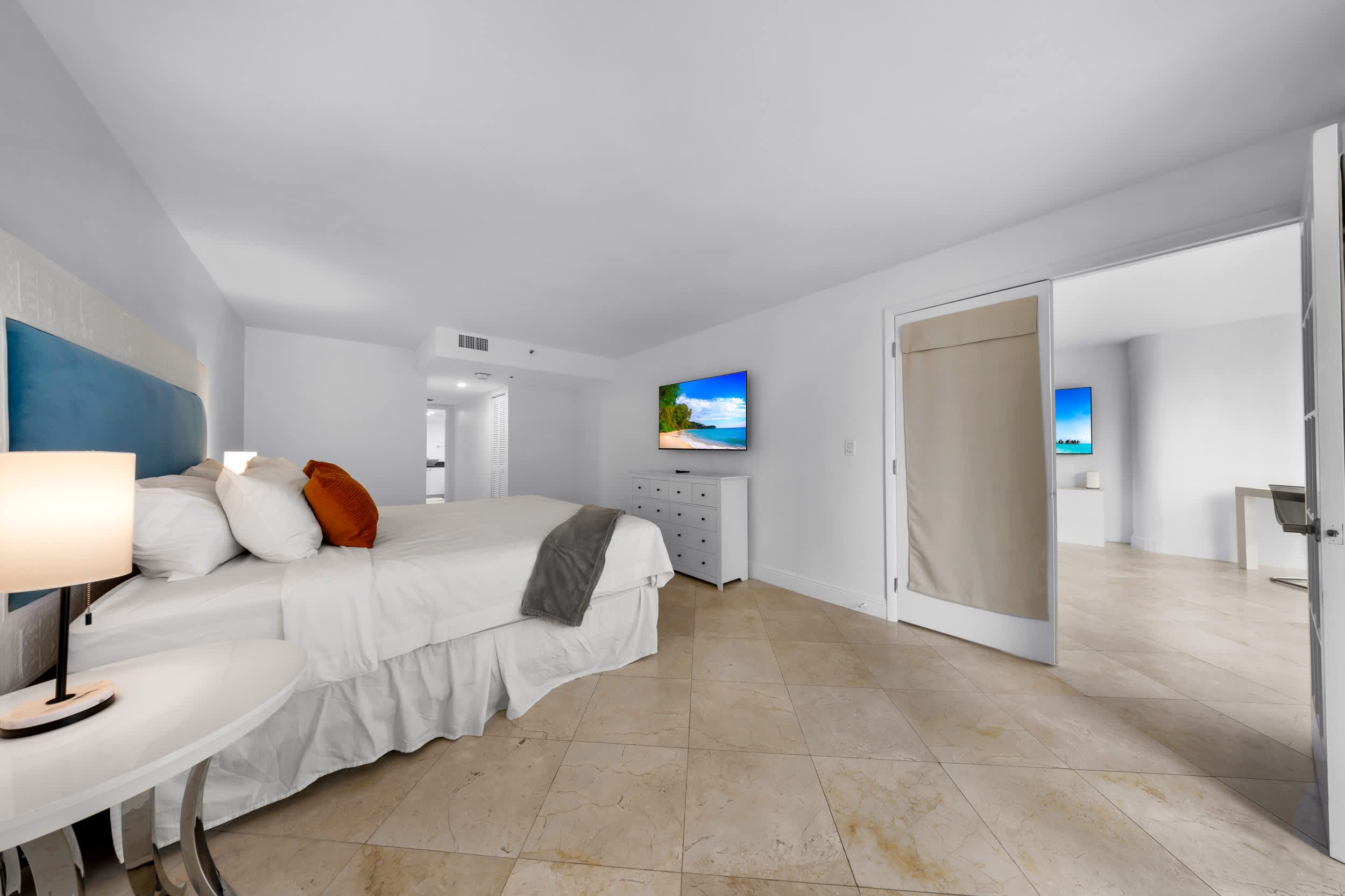 This Edgewater getaway offers modern comfort with a laid-back Miami feel. The open-plan living space is perfect for gathering, with a comfy sofa, dining table, and fully equipped kitchen with a sleek counter and bar stools. There’s even a dedicated desk for working from home. The highlight is the private balcony overlooking Biscayne Bay, where palm trees add a touch of privacy to the sweeping water views. Elsewhere, you'll be able to unwind in the shared hot tub, work out in the state-of-the-art gym, or enjoy gourmet dining – all without leaving the building. With Brickell, Miami Beach, and the Adrienne Arsht Centre just minutes away, the best of the city is at your doorstep.