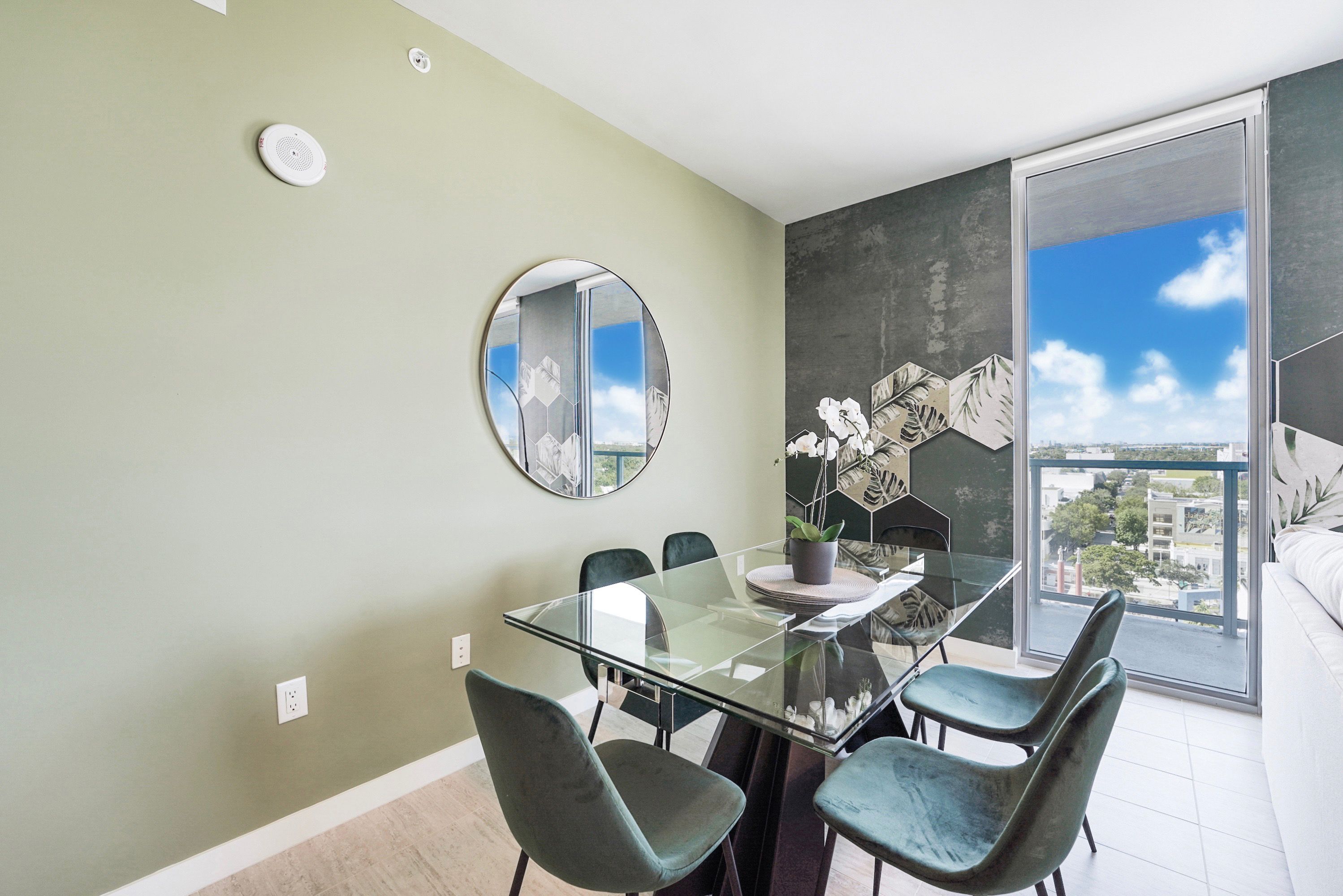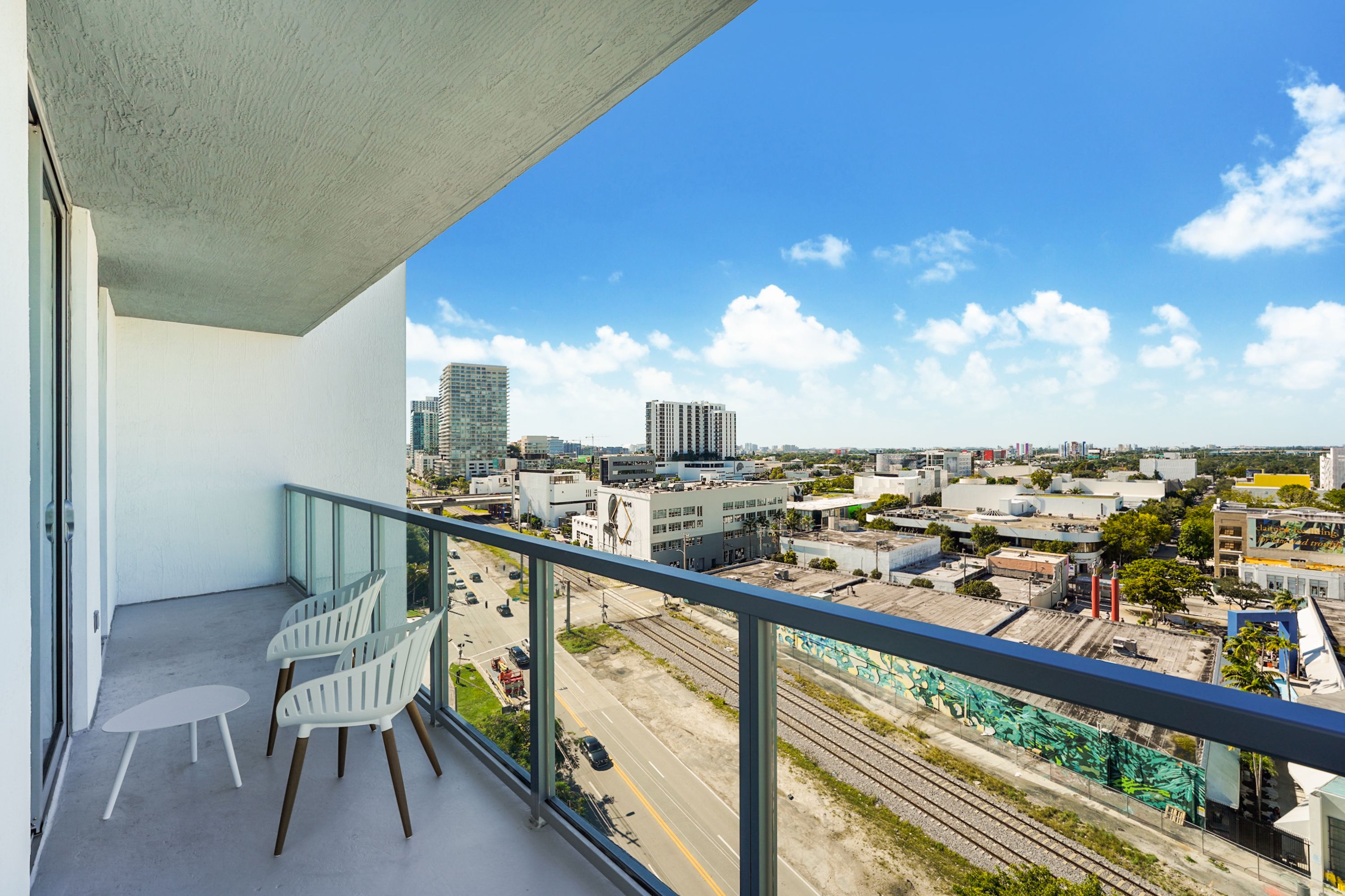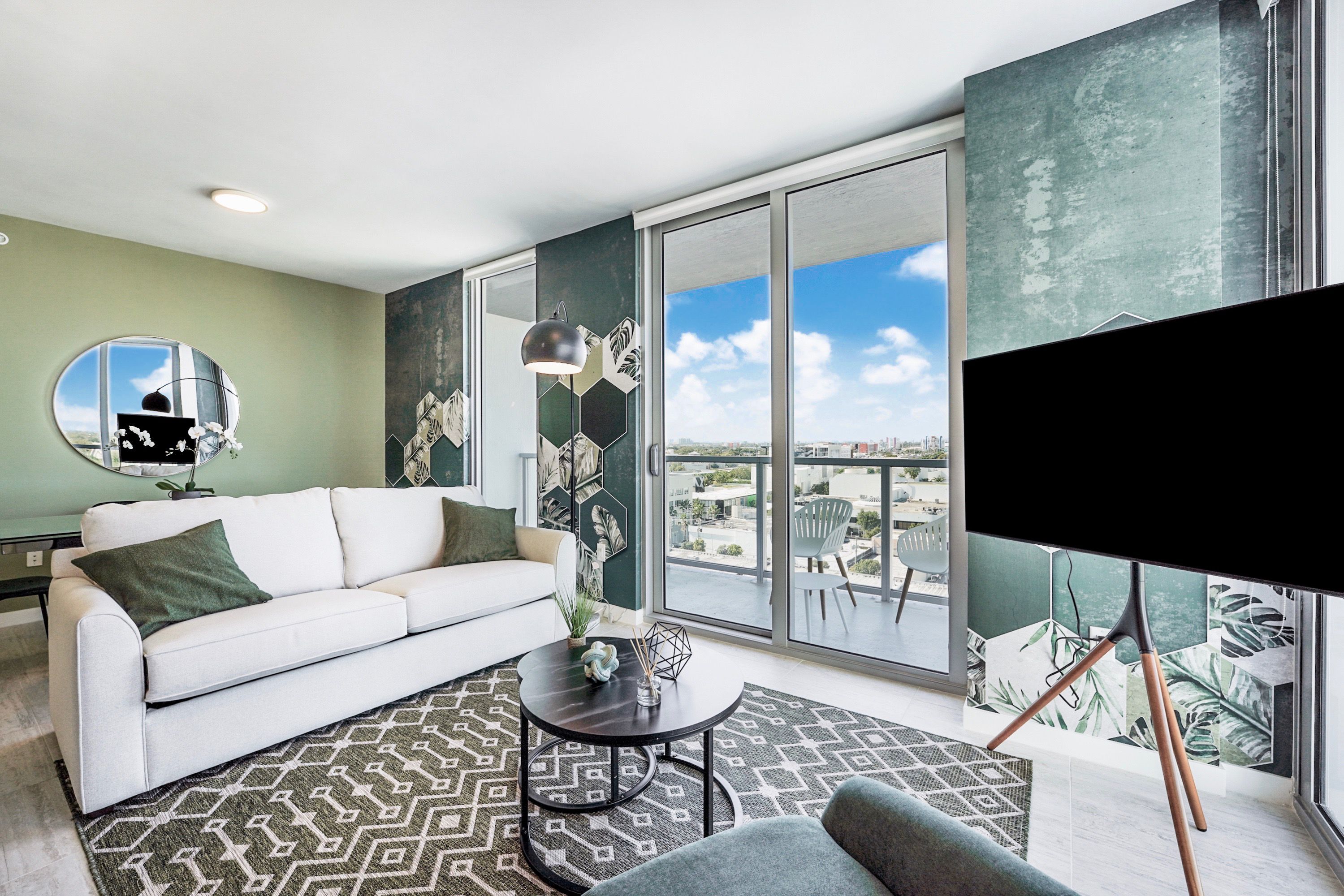 Discover this modern apartment just steps from the renowned Miami Design District, where you’ll find art galleries, shops and restaurants. With such a fantastic, well-connected location, you’ll experience a bit of noise here, mainly from the railway line nearby. We have to say, the building’s communal facilities are great. There’s a gym, a shared workspace, and a pool. Another bonus is that there’s a free parking space here. The apartment itself has a private balcony with views over the city – ideal for evening drinks. And the bright open-plan living space has a sofa bed for guests five and six. This home provides a comfortable and convenient base for exploring this vibrant city.