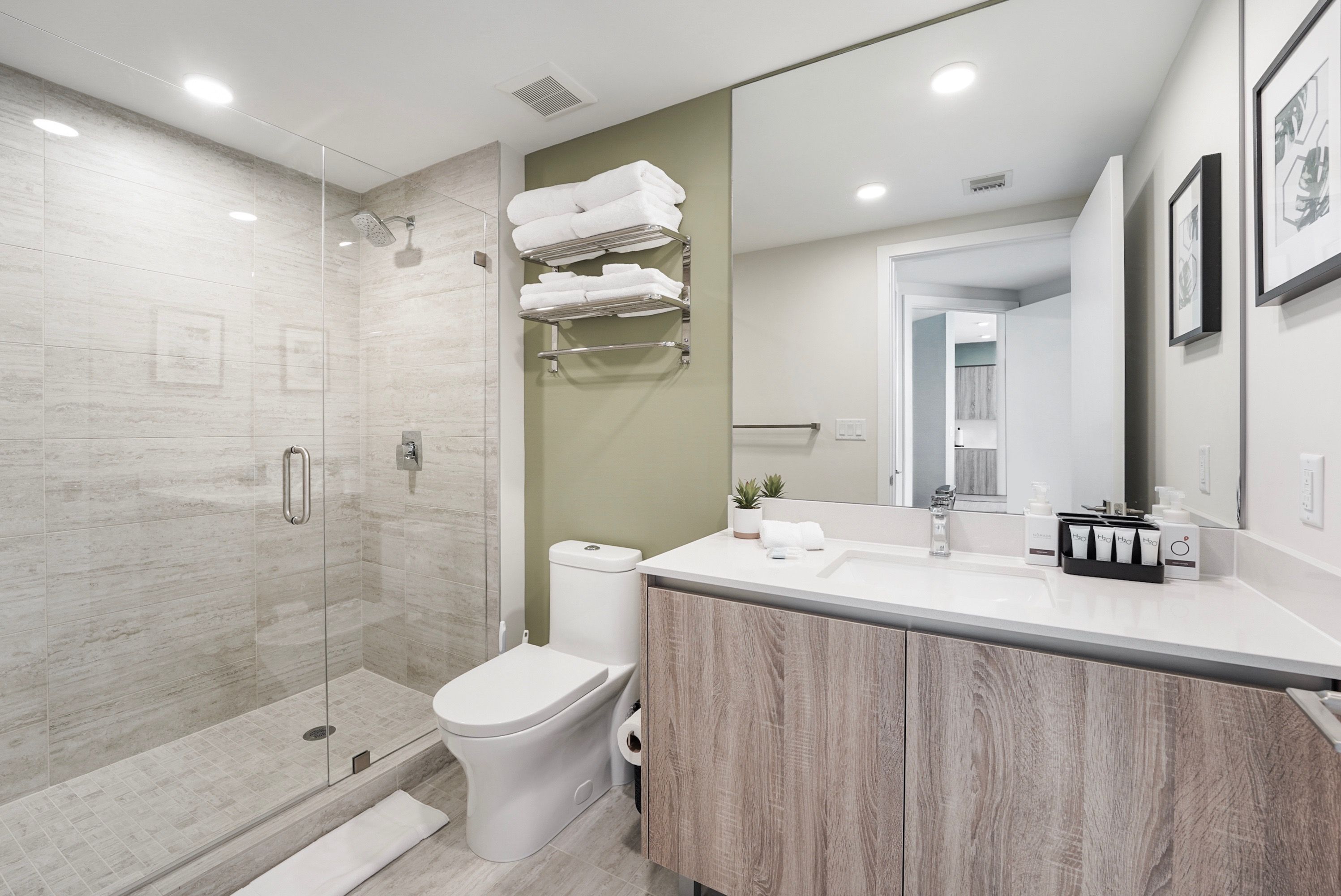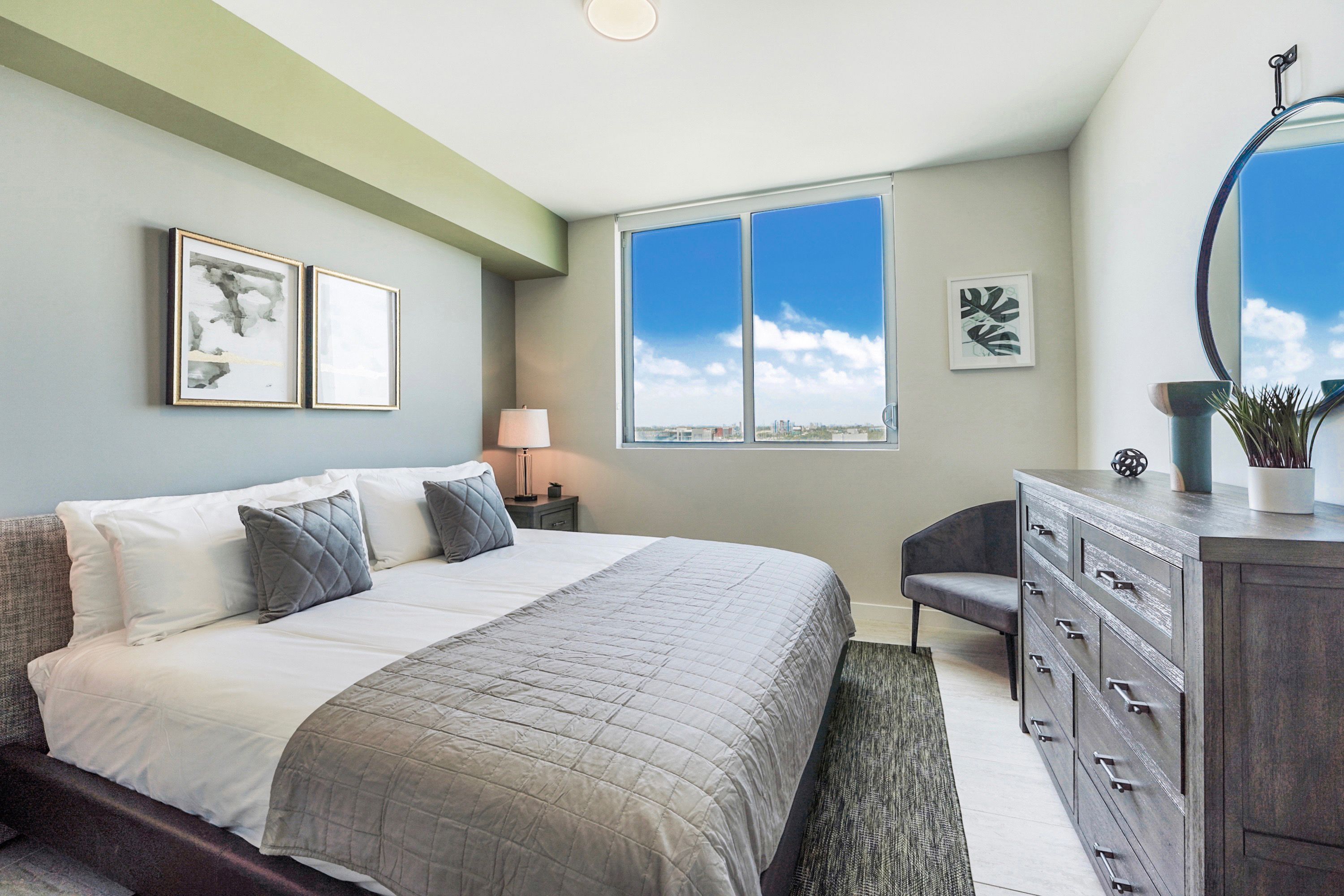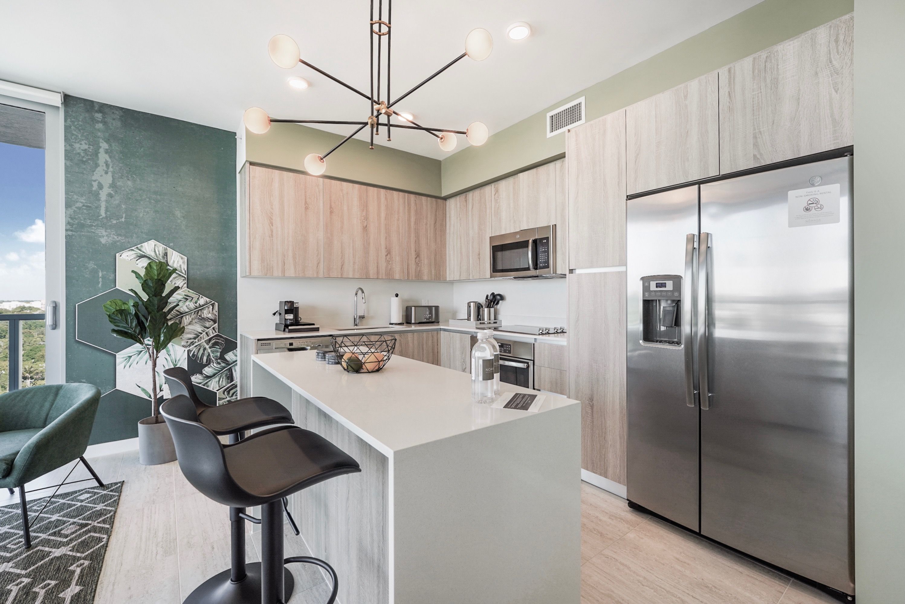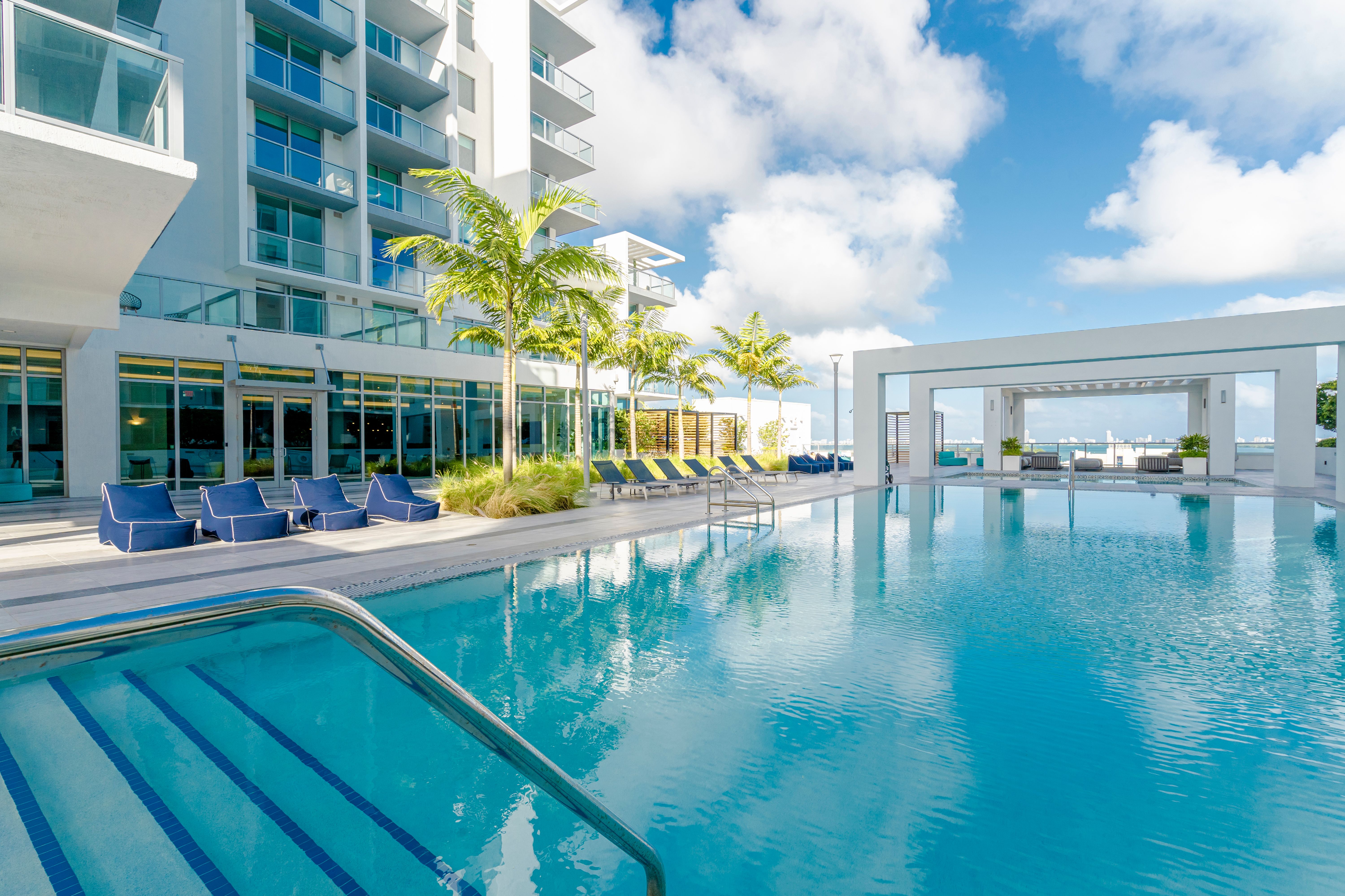 Discover this modern apartment just steps from the renowned Miami Design District, where you’ll find art galleries, shops and restaurants. With such a fantastic, well-connected location, you’ll experience a bit of noise here, mainly from the railway line nearby. We have to say, the building’s communal facilities are great. There’s a gym, a shared workspace, and a pool. Another bonus is that there’s a free parking space here. The apartment itself has a private balcony with views over the city – ideal for evening drinks. And the bright open-plan living space has a sofa bed for guests five and six. This home provides a comfortable and convenient base for exploring this vibrant city.