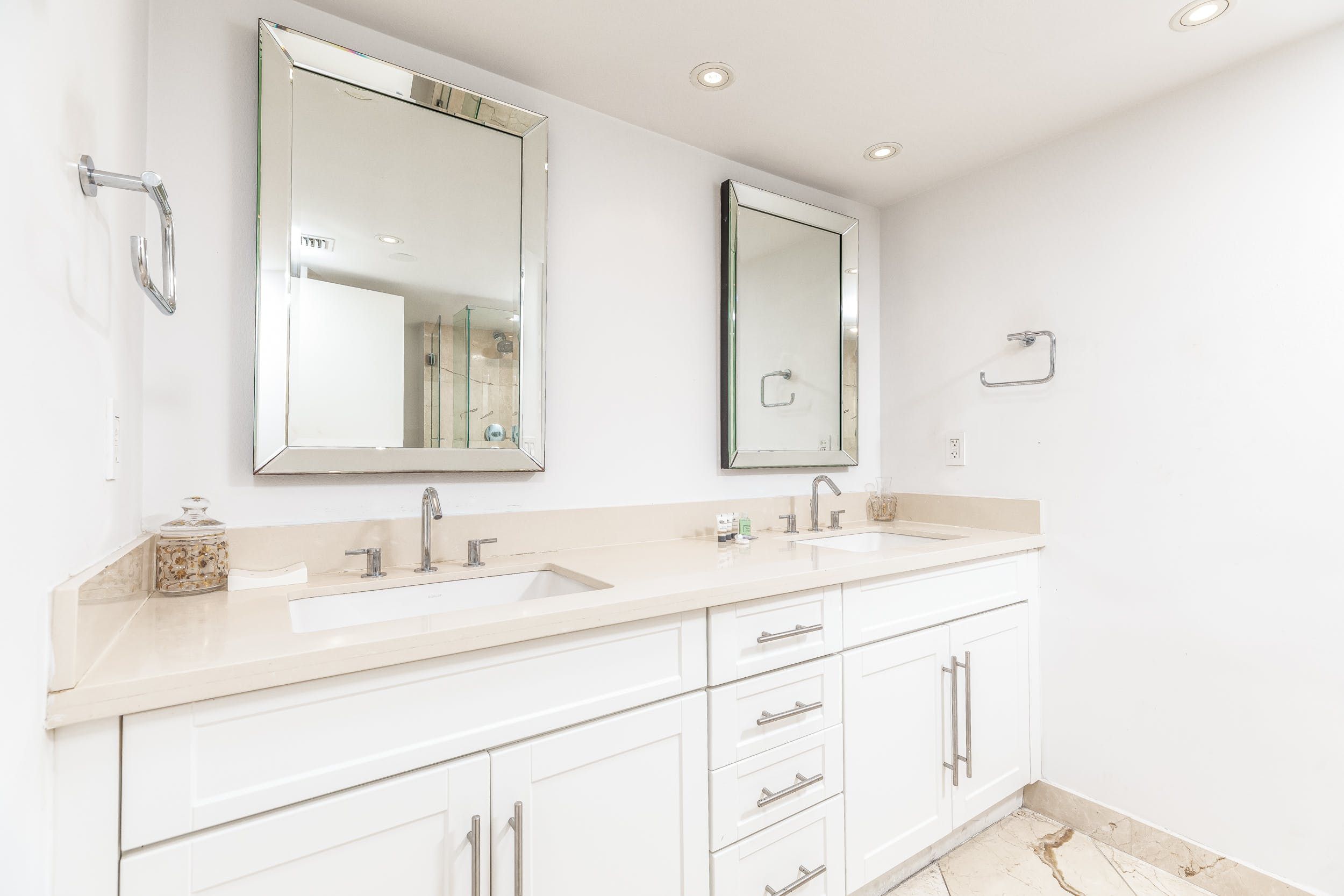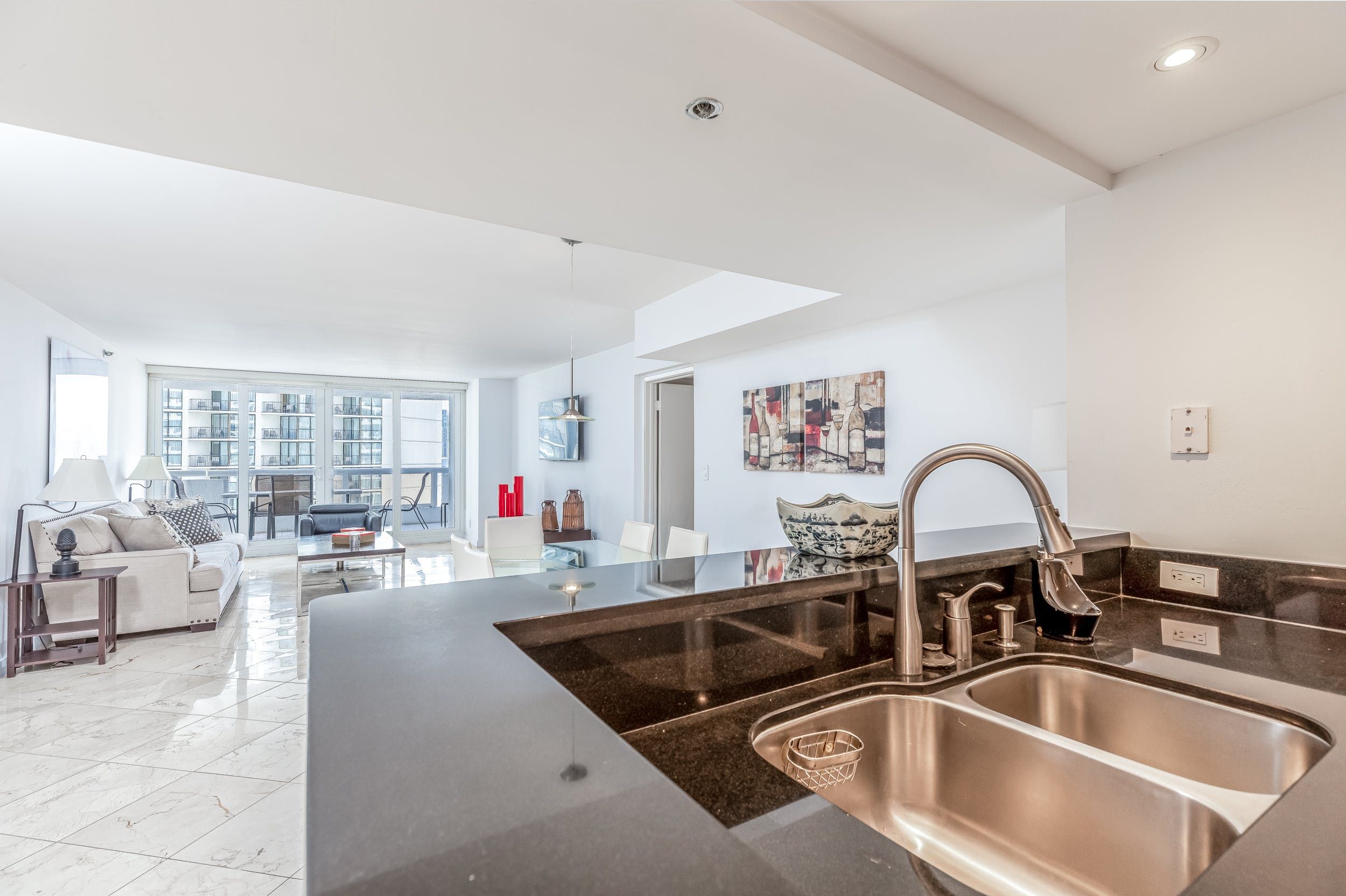 Behind the front door, you're first greeted by a contemporary open-concept interior compete with white walls, bold artwork and marble tiling, as well as a horseshoe-shaped kitchen complete with granite worktops. The bedrooms are minimalist in style and two of them have direct access to the balcony that looks out over Biscayne Bay.