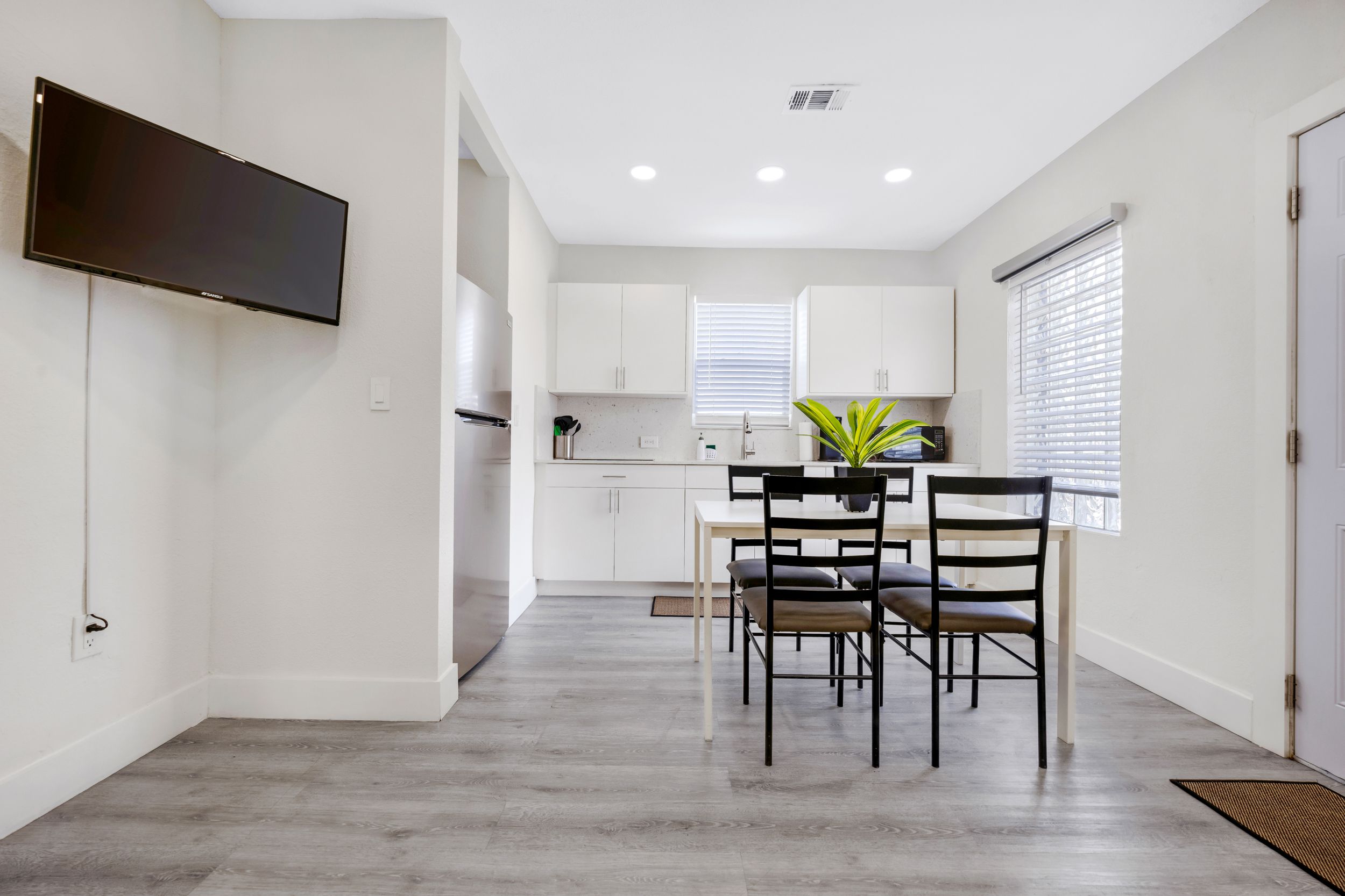 *The dining table has seating for four guests, but there are extra folding chairs if needed.