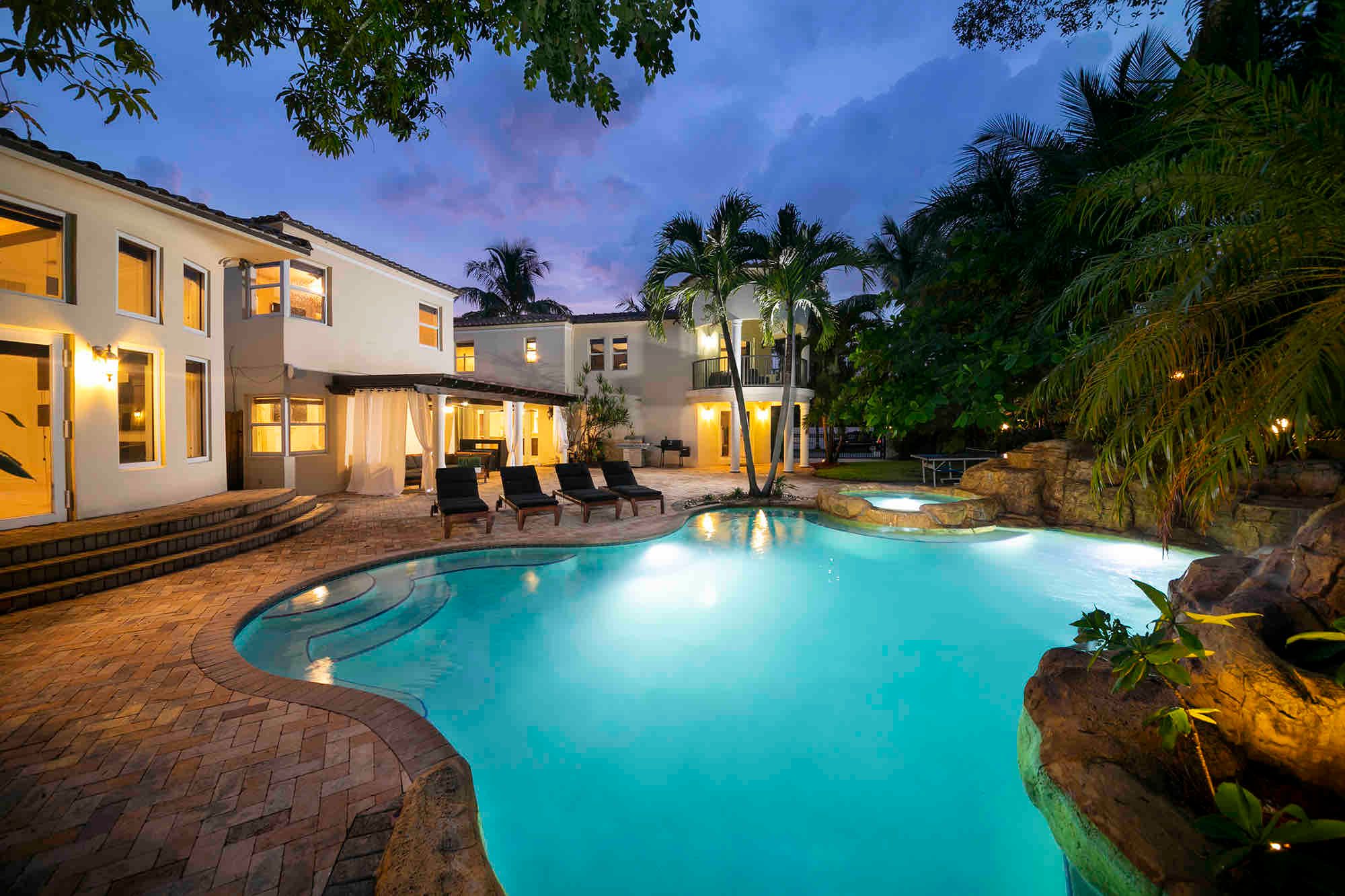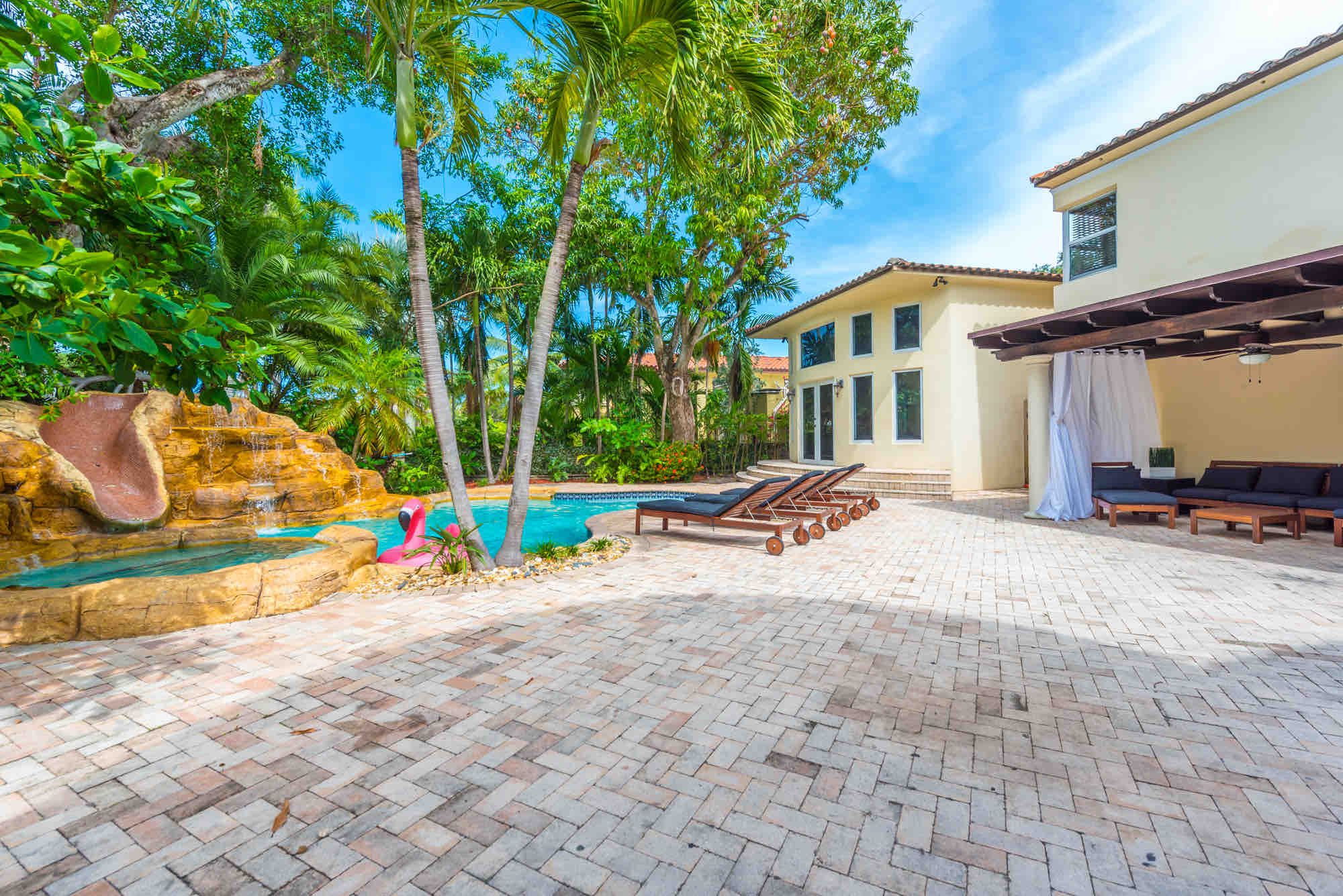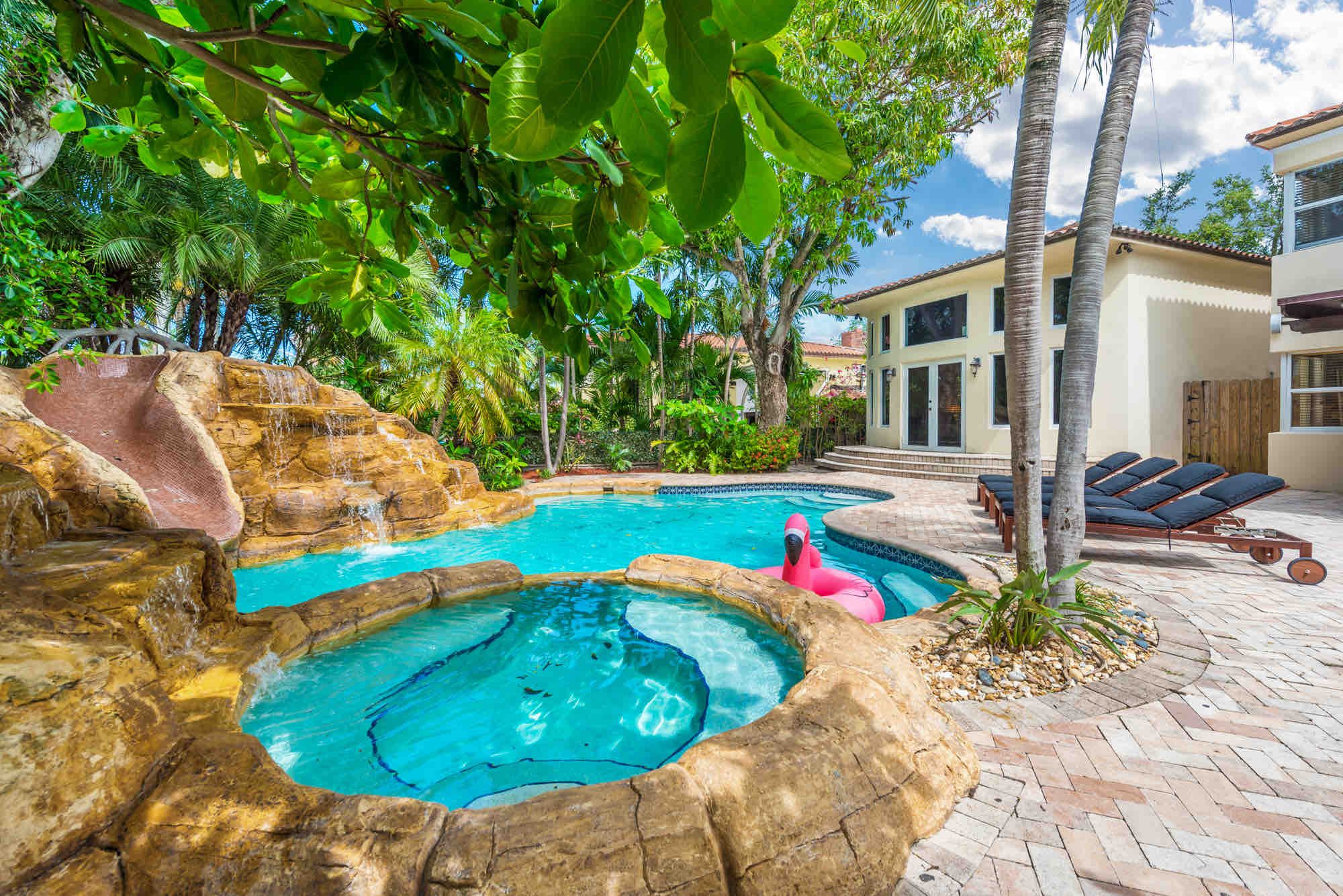 Surrounded by a mature garden rich in mango and palm trees, this Miami mansion is a playground for guests of all ages. The sprawling property offers a little something for everyone, including a home cinema, a private swimming pool complete with a waterfall and slide, a bar area, and a pool table for entertaining. With touches of Tudor architecture and Mediterranean Revival, and enough space to let the kids loose, it is really well-suited for large families, groups of friends, or co-workers on a business retreat.