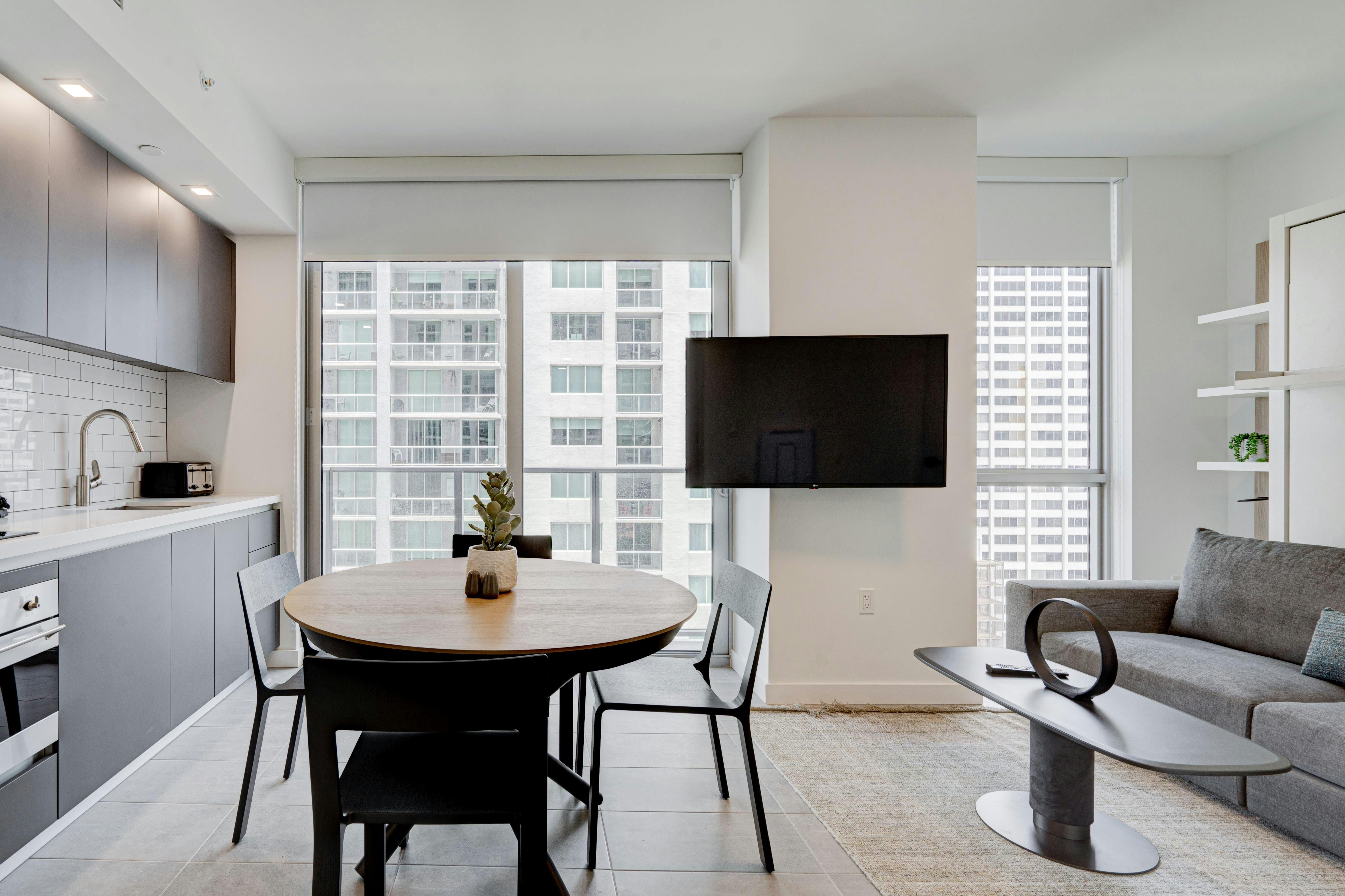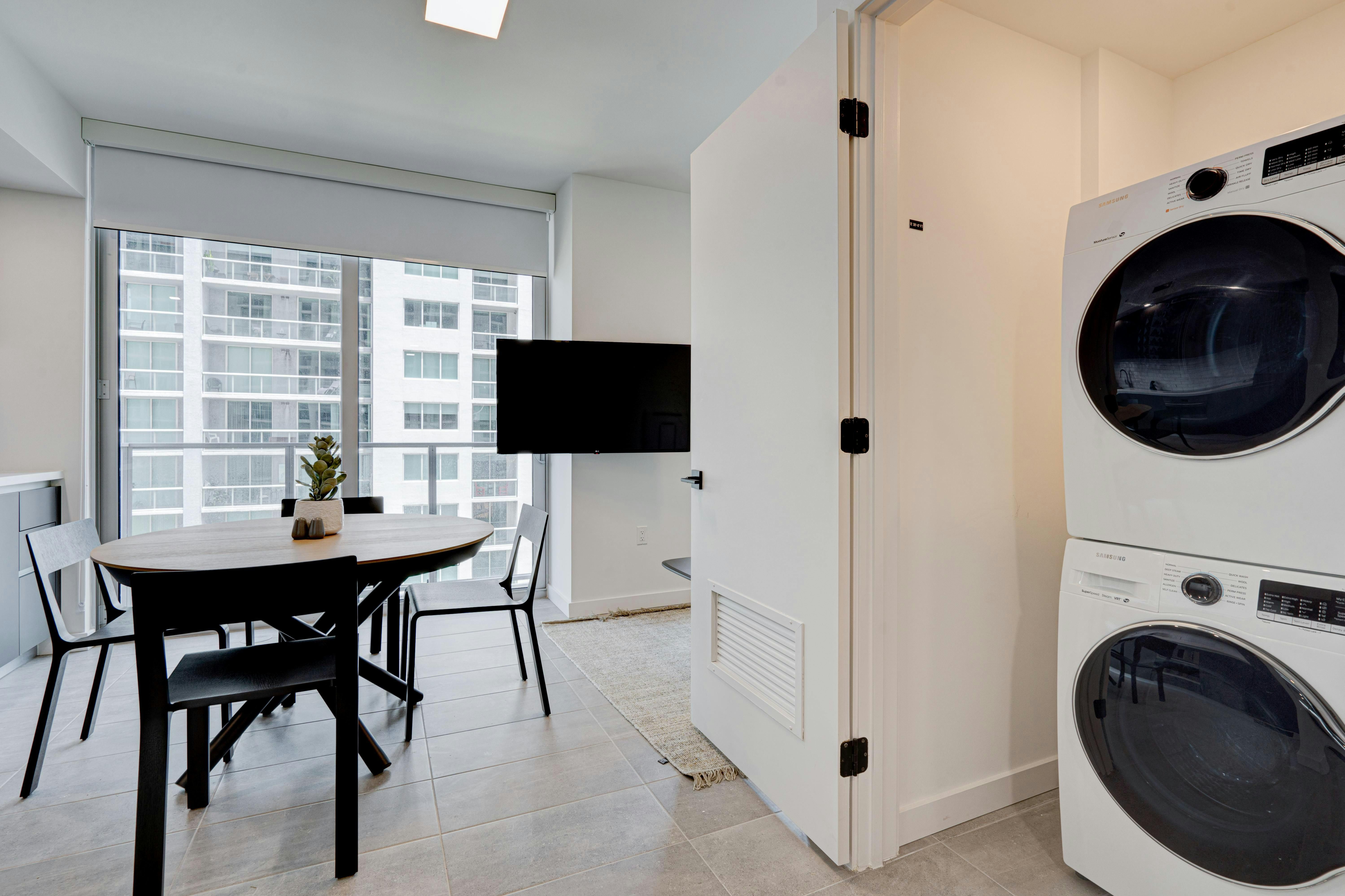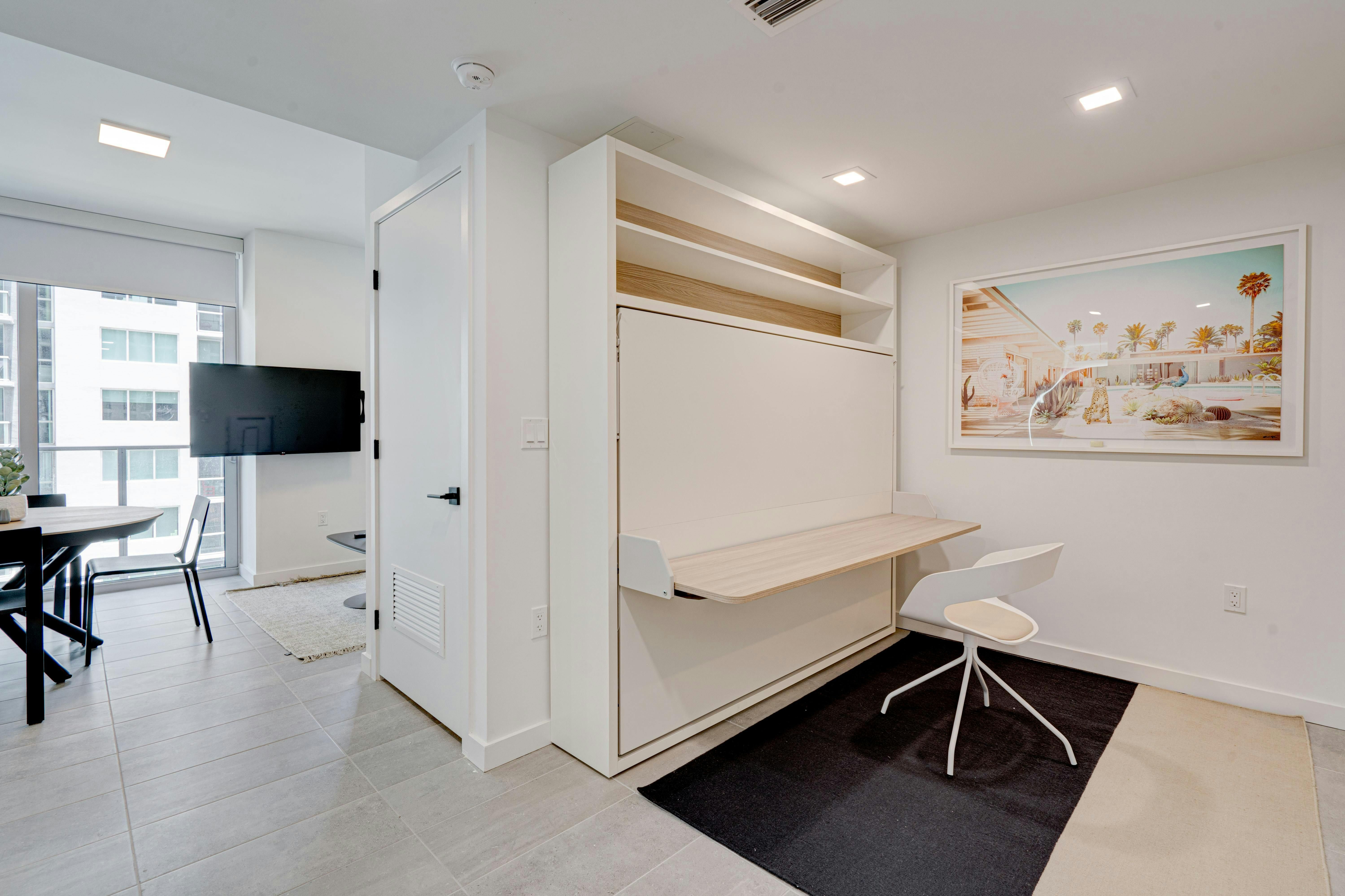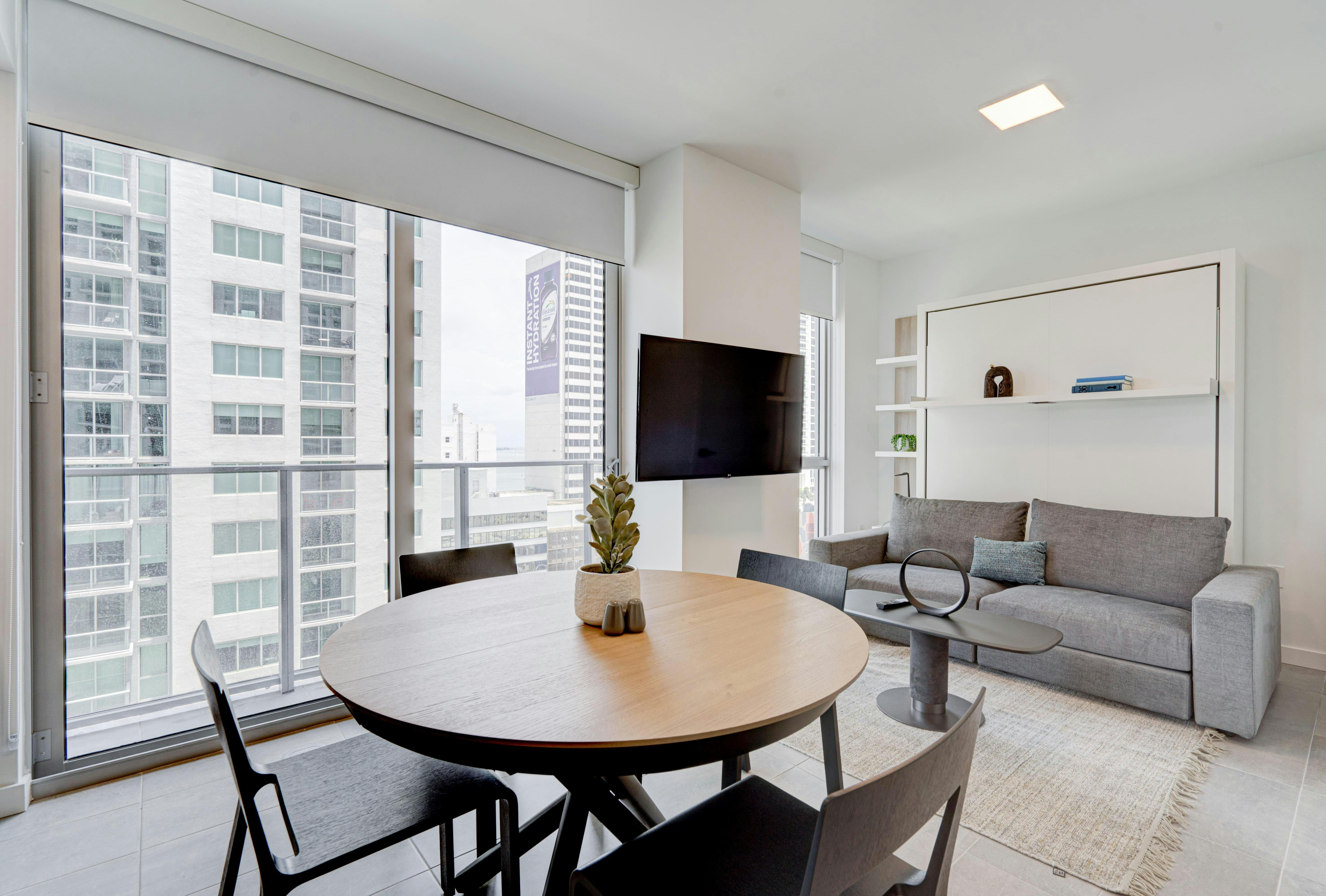 This brand new short-term rental condo in YotelPad offers stunning views of Biscayne Bay and downtown Miami. The cozy studio is fully equipped with one queen bed and a queen-sized sofa bed, making it perfect for groups of up to four guests. The building features great amenities, including a pool, gym, business center, lounge, and more. Guests can enjoy free Wi-Fi and cable, as well as walking-distance access to restaurants and nightlife. The property is conveniently located near beaches and the Miami International Airport. Additionally, free parking is available for guests.