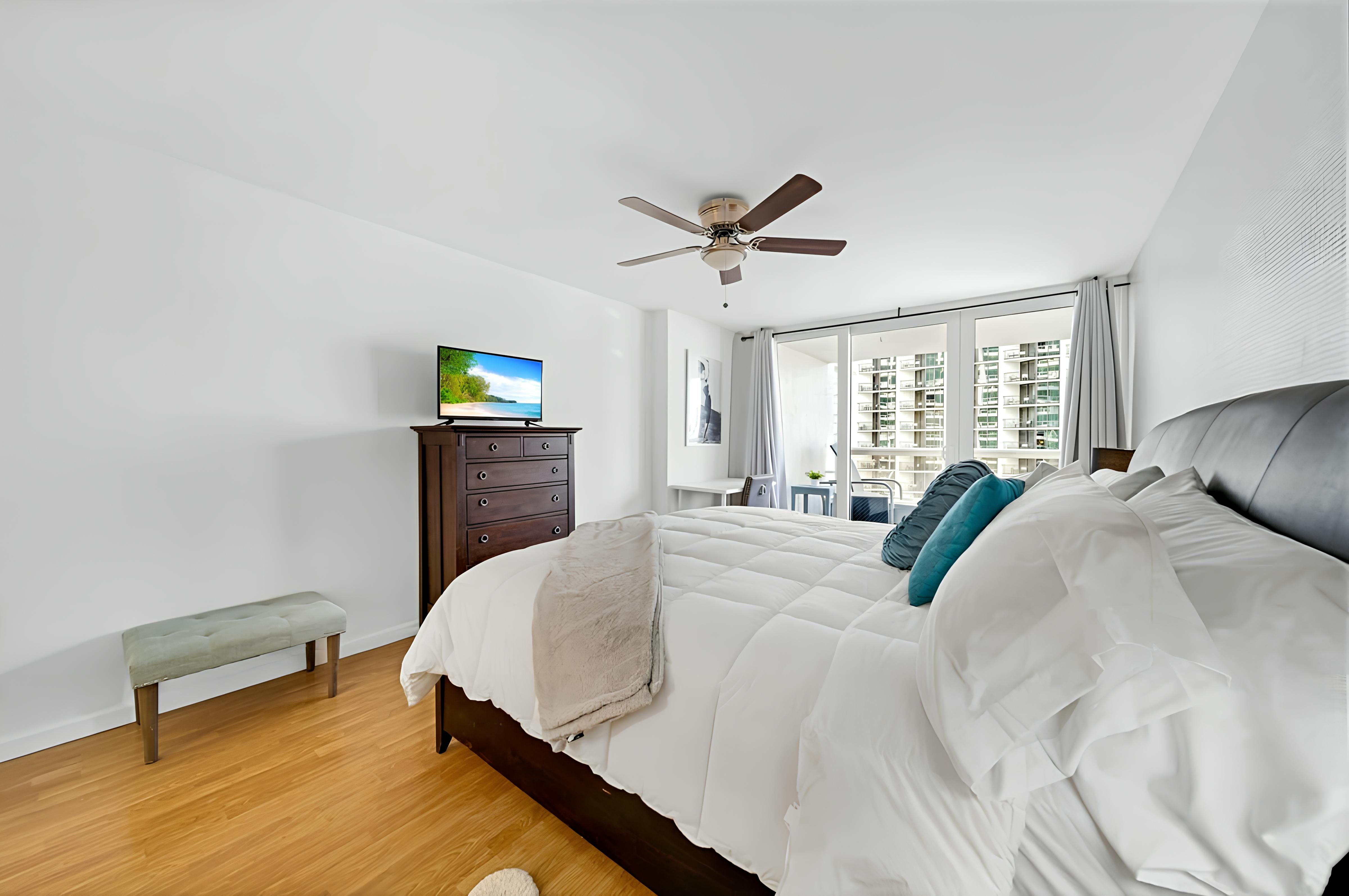 Experience the magic of Miami when you stay at this one-bedroom apartment. You’ll be in vibrant Edgewater, a short drive from South Beach with its Art Deco architecture, pristine white sand, and next-level nightlife. When you’re not busy sightseeing or sampling the city’s best bars and eateries, this home offers a relaxed retreat from the hustle and bustle, complete with a balcony and modern kitchen for relaxed meals. The building also has a communal gym and shared Olympic-sized swimming pool that’s open year-round – little perks that will help you feel right at home.