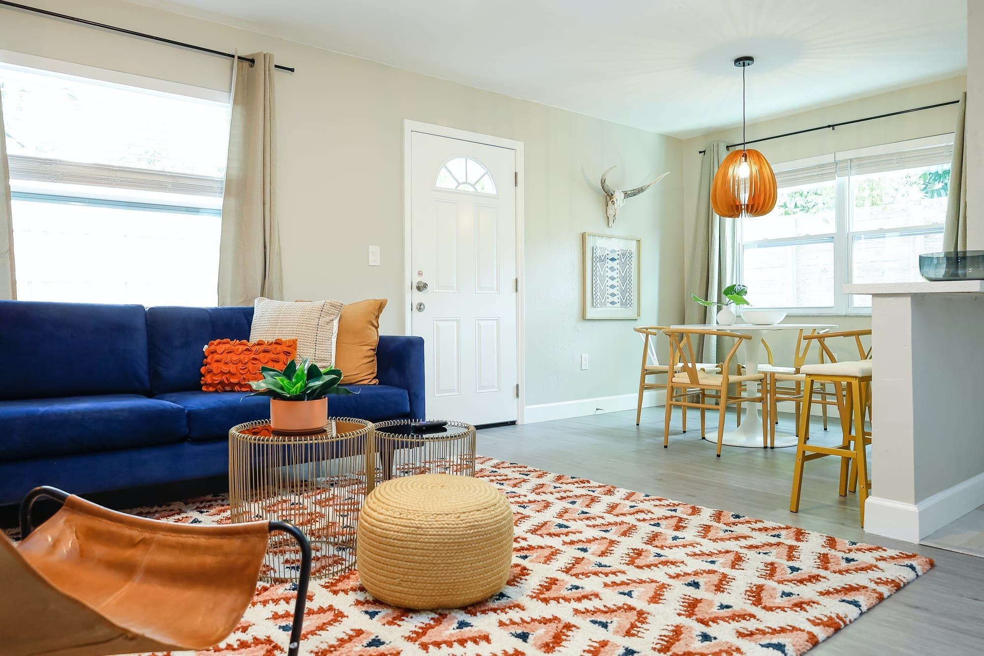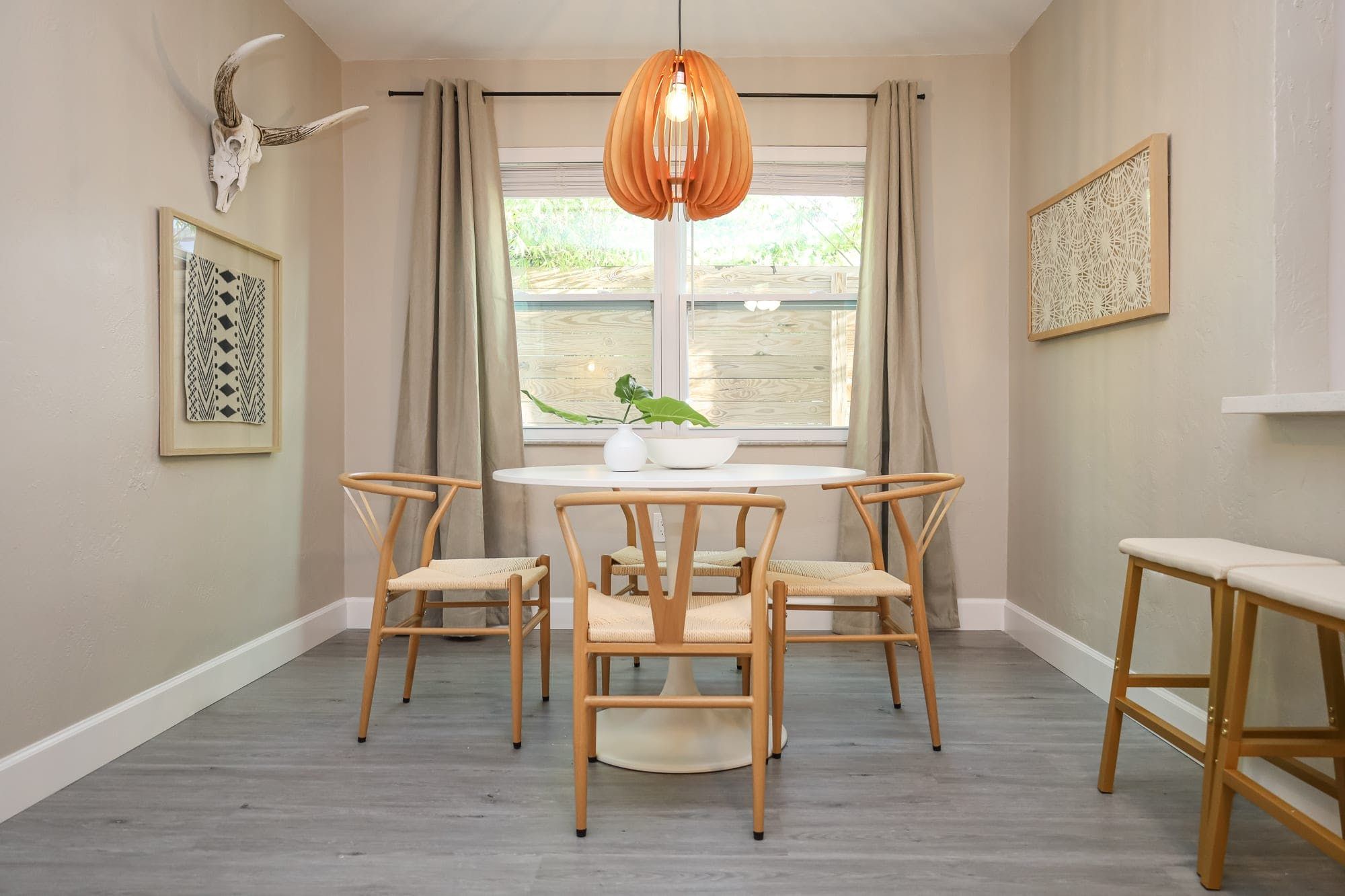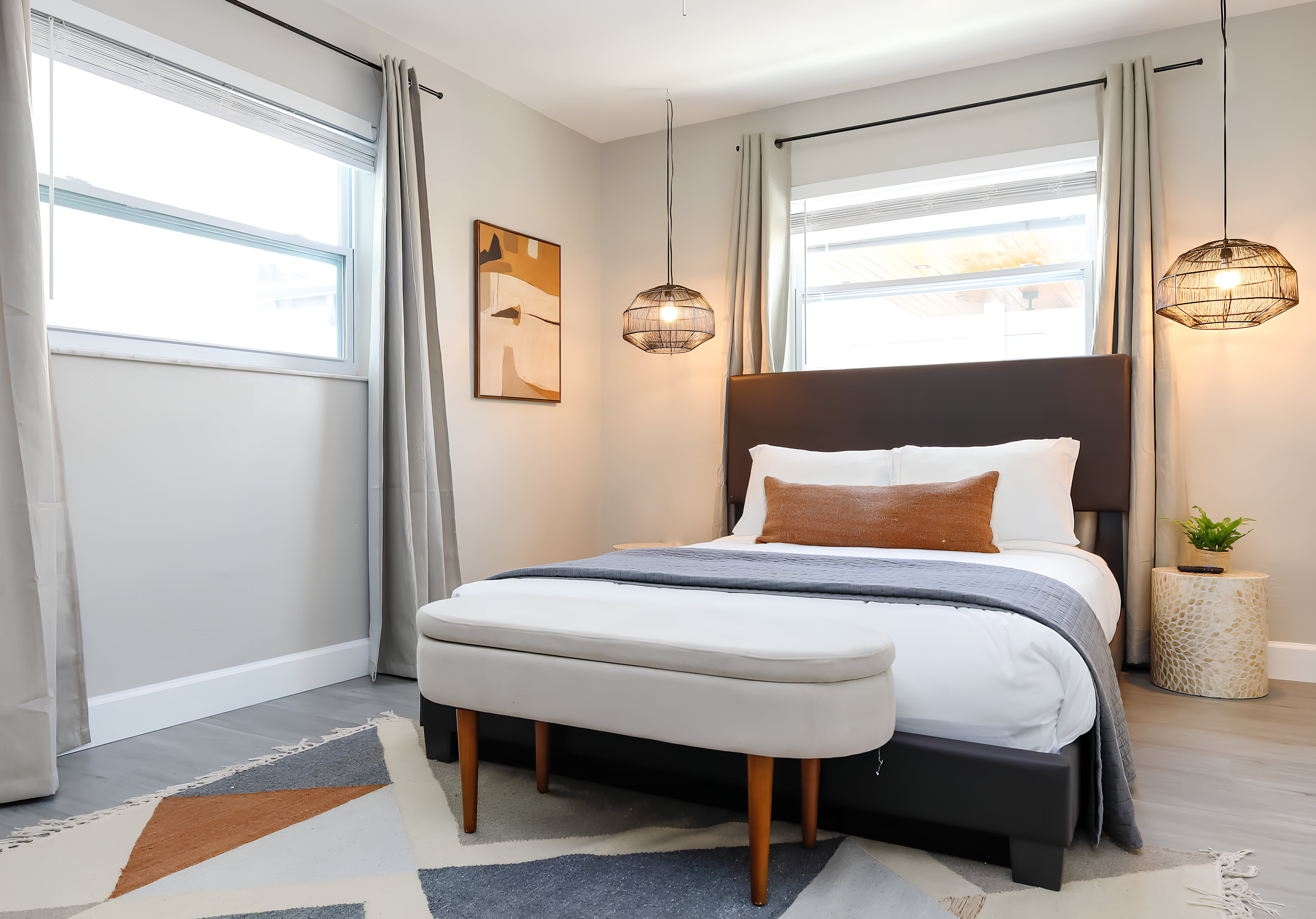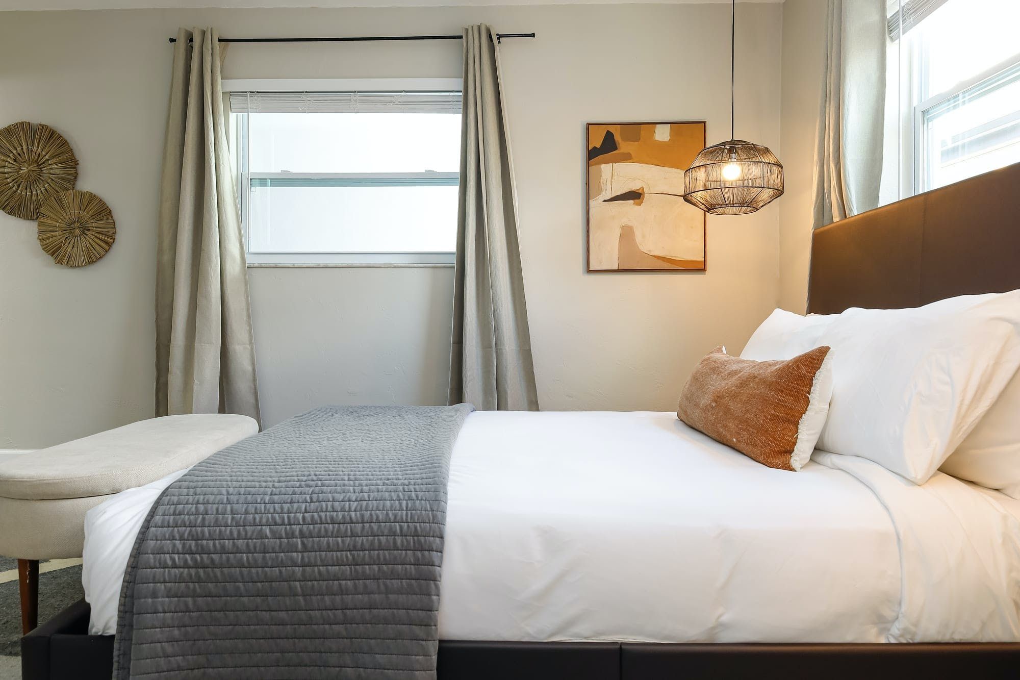 This newly remodeled bohemian apartment is centrally located in Coral Way, a scenic city neighbourhood that boasts peaceful residential areas, trendy shopping centres, intimate taverns and lively pubs. The cosy apartment has one queen bed and two double beds, providing ample space for families or friends traveling together. The unique boho design brings a touch of home to your vacation experience. This prime location puts you within walking distance of the city's top attractions, restaurants, and shops. The apartment features a spacious living room with Smart TV, fully equipped kitchen, master bedroom with en-suite bathroom and Smart TV, second bedroom with two full-size beds, and an outdoor seating area with ping pong table. Amenities include iron and ironing board, washer/dryer, free WiFi (100+ Mbps), Smart TVs for streaming apps like Netflix, toiletries, linens and towels. Parking for one car is available in designated area on the right-side driveway. This is a pet-friendly property with a $150 per pet fee.