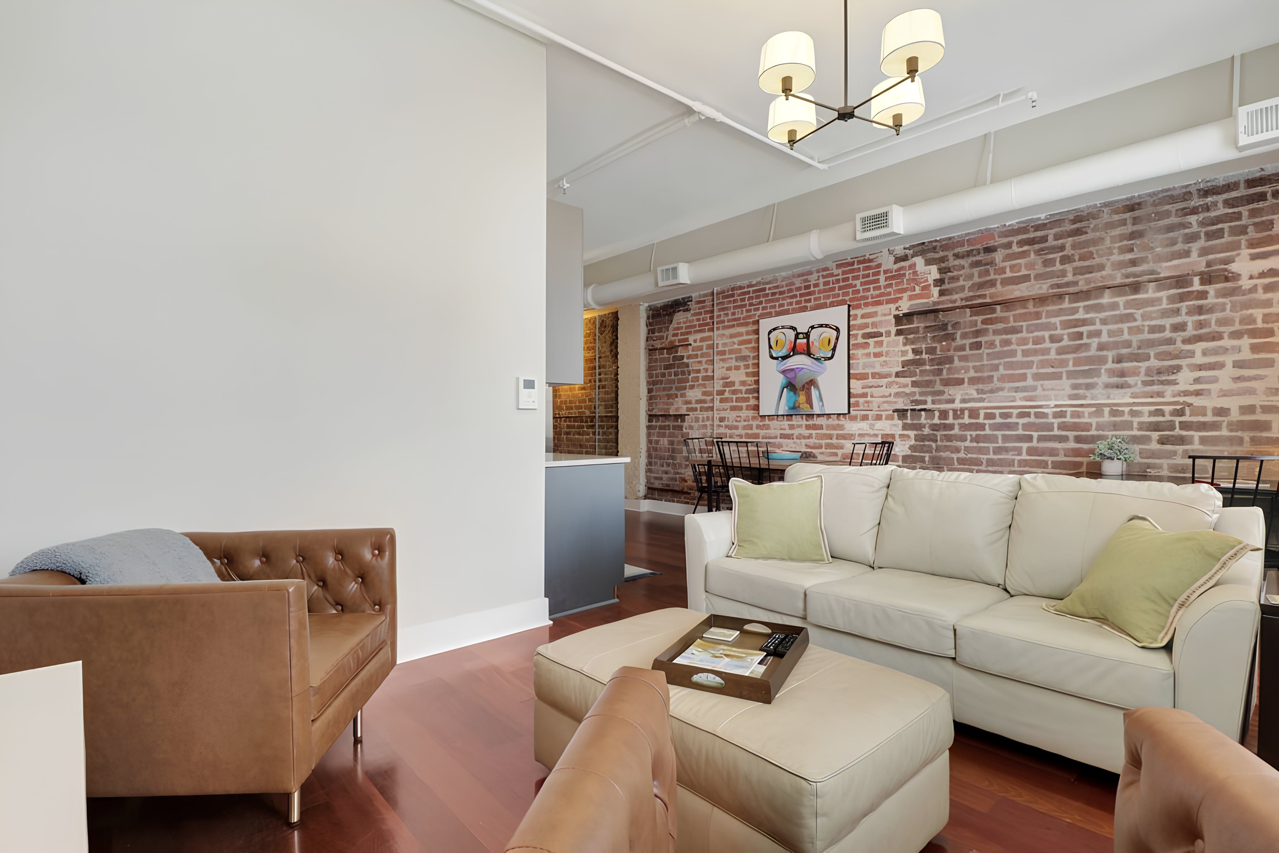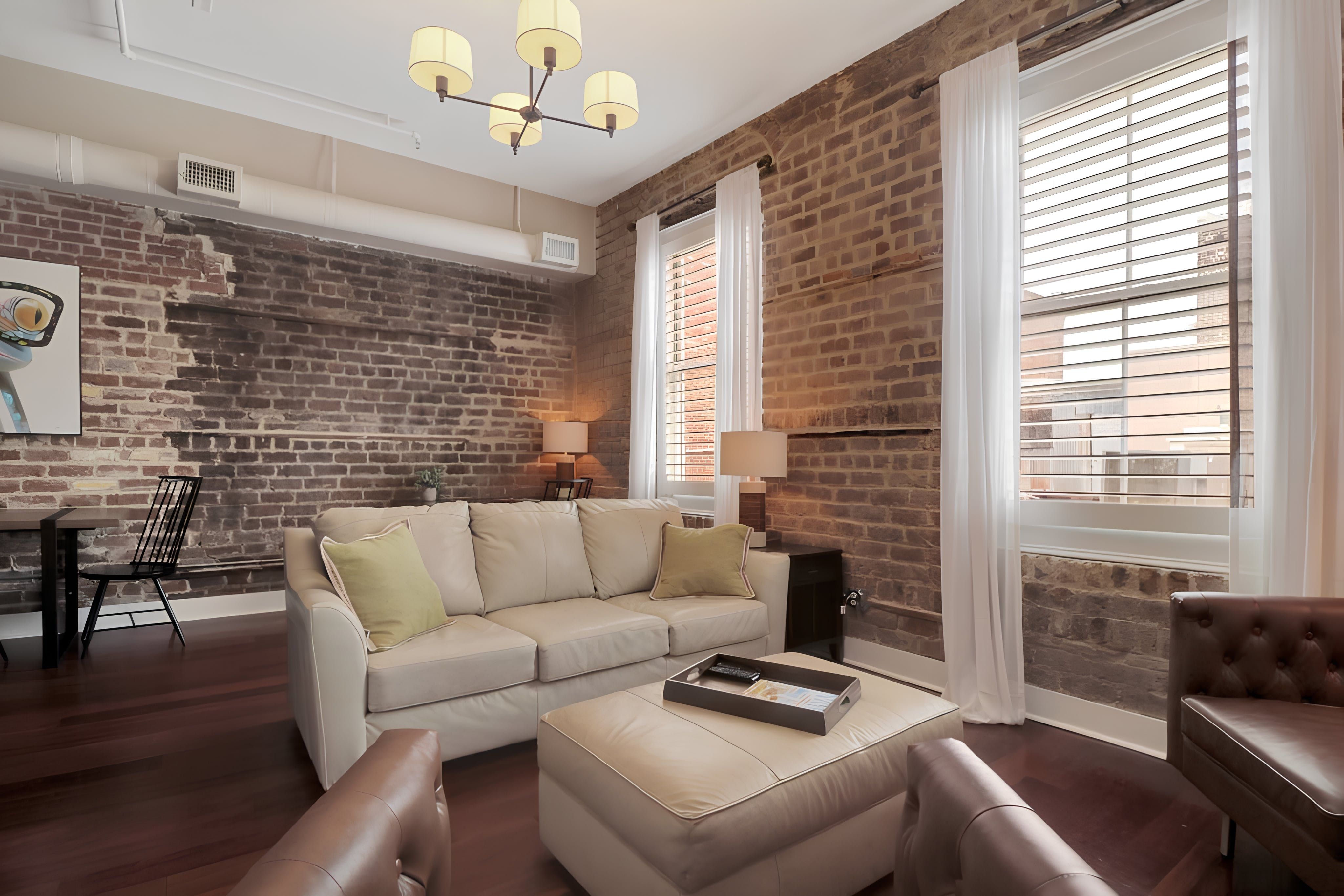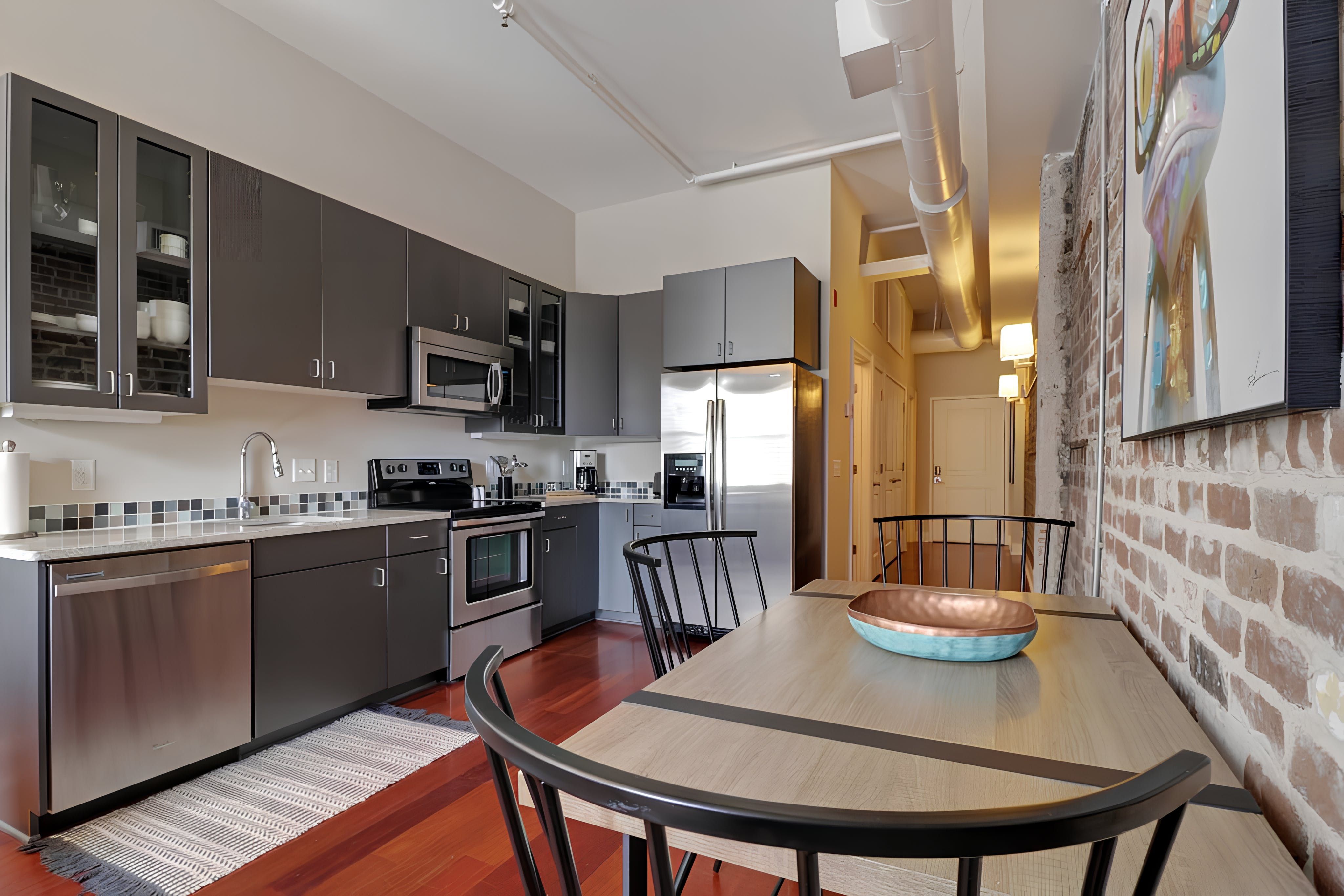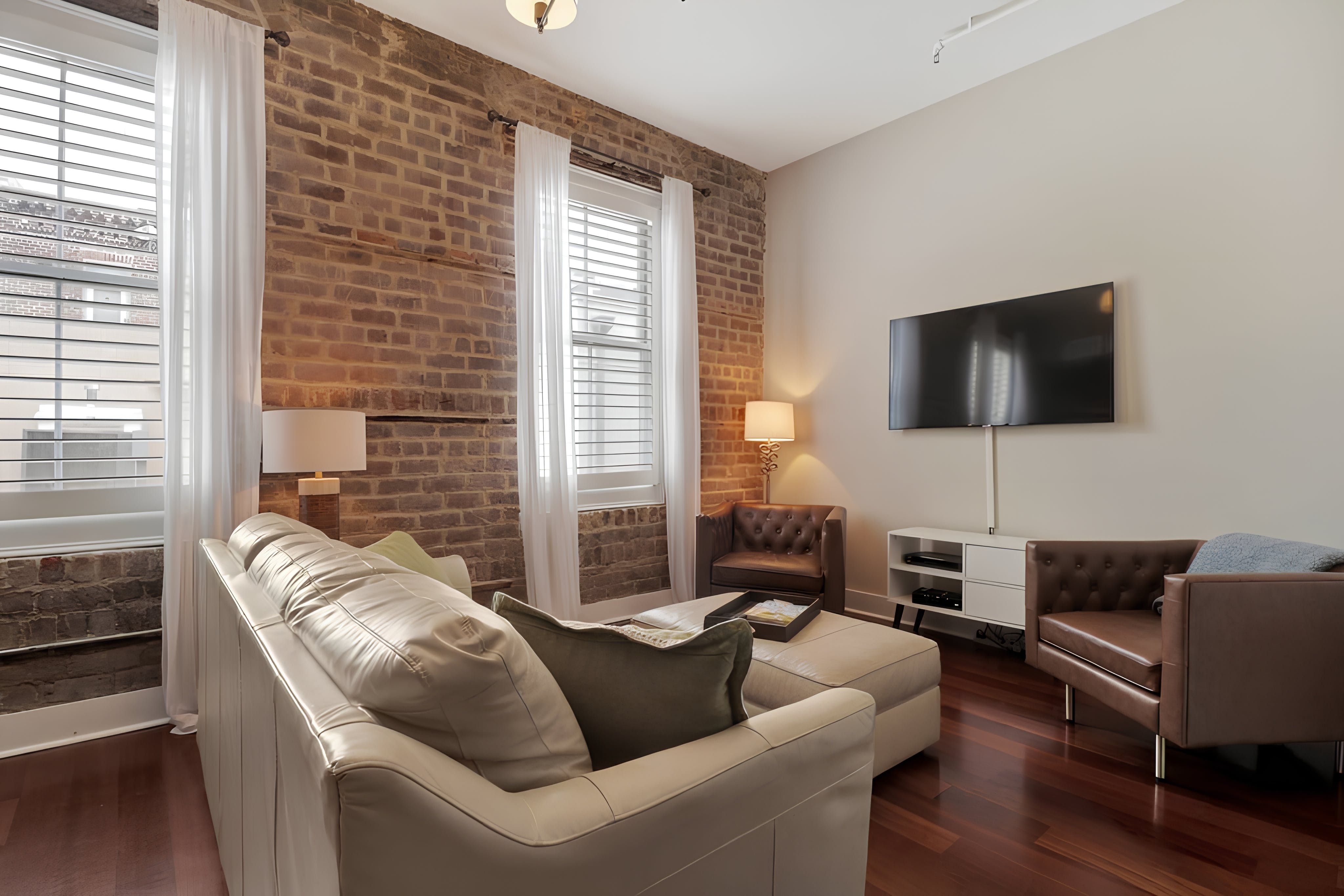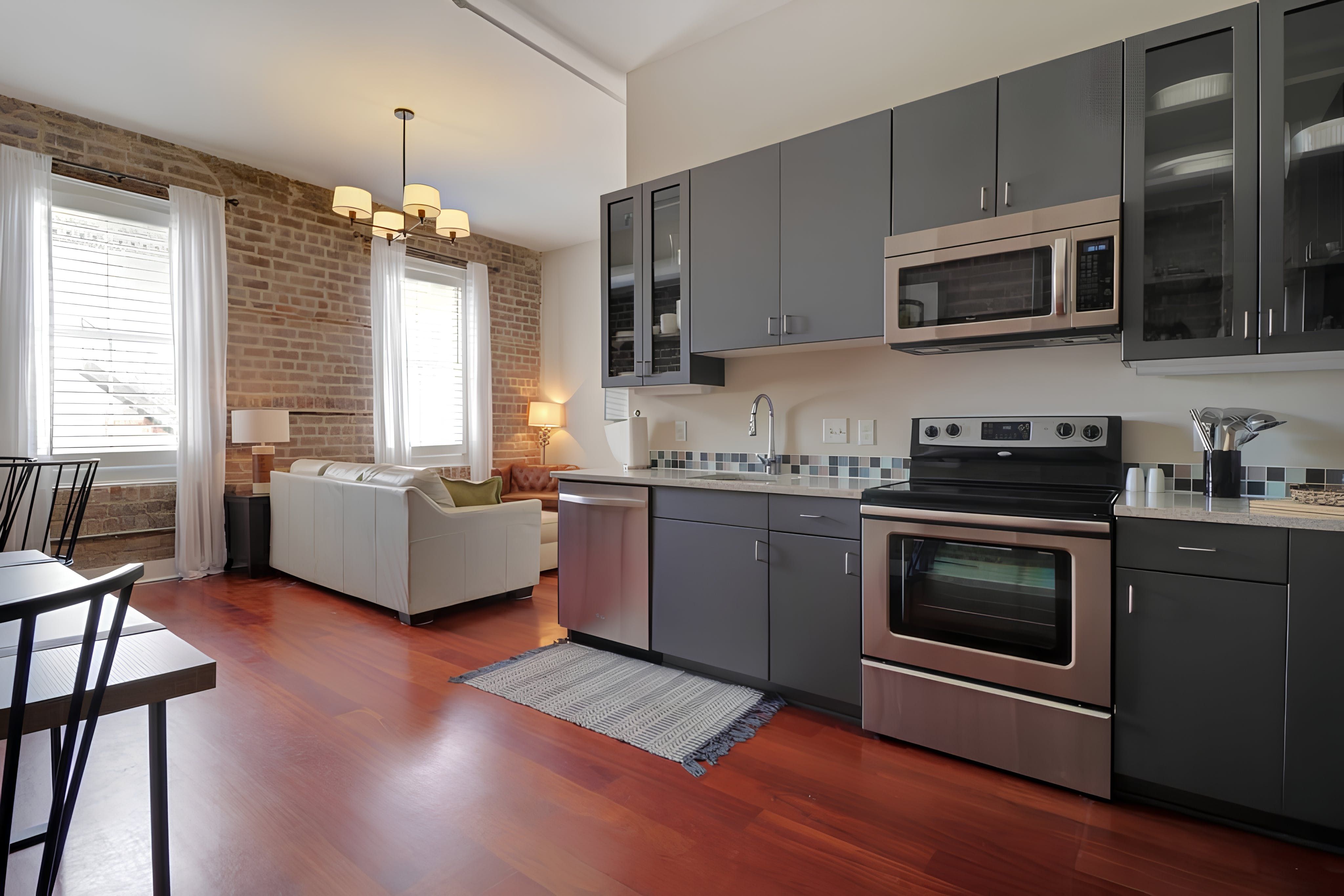 Right in the heart of Savannah, with its restaurants, cobblestone streets and moss-covered trees, this one-bedroom apartment is all about location – but its interior is still a highlight too. Walk inside and feel the rustic, loft-like energy immediately – the exposed brick walls and high ceilings are cosy and inviting, and the spacious living area gives you plenty of room to stretch out. When you’re ready to see the sights, bustling River Street is just five minutes away by foot, where restaurant and shopping opportunities abound.