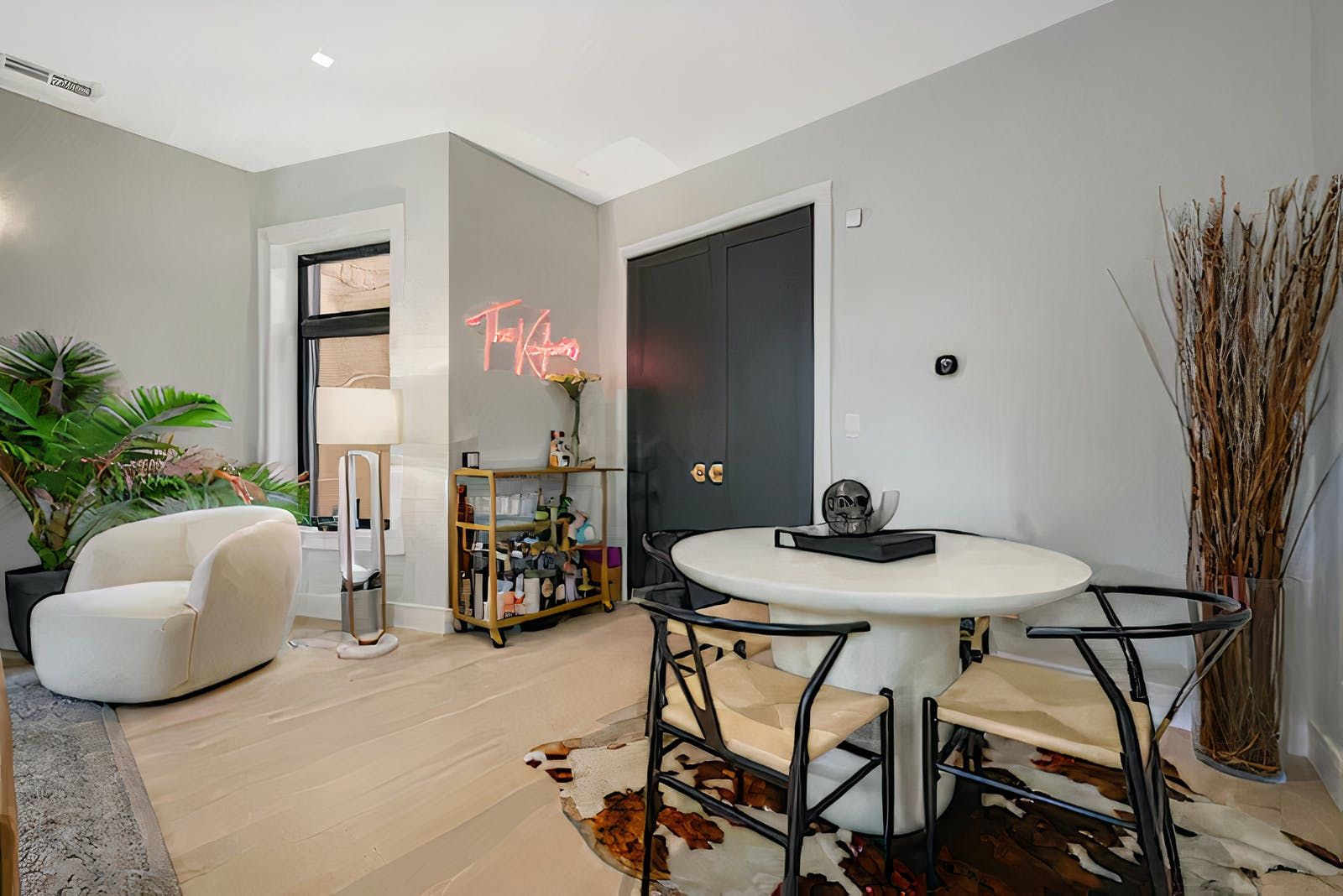 This apartment in Chicago's Hyde Park is positively flush with luxury touches. We love the trendy, timeless design, which merges mid-century pieces with a modern flair. Take, for instance, the custom-made neon sign that hangs by the door – as soon as you step inside, your eyes will be drawn to the pinkish glow.