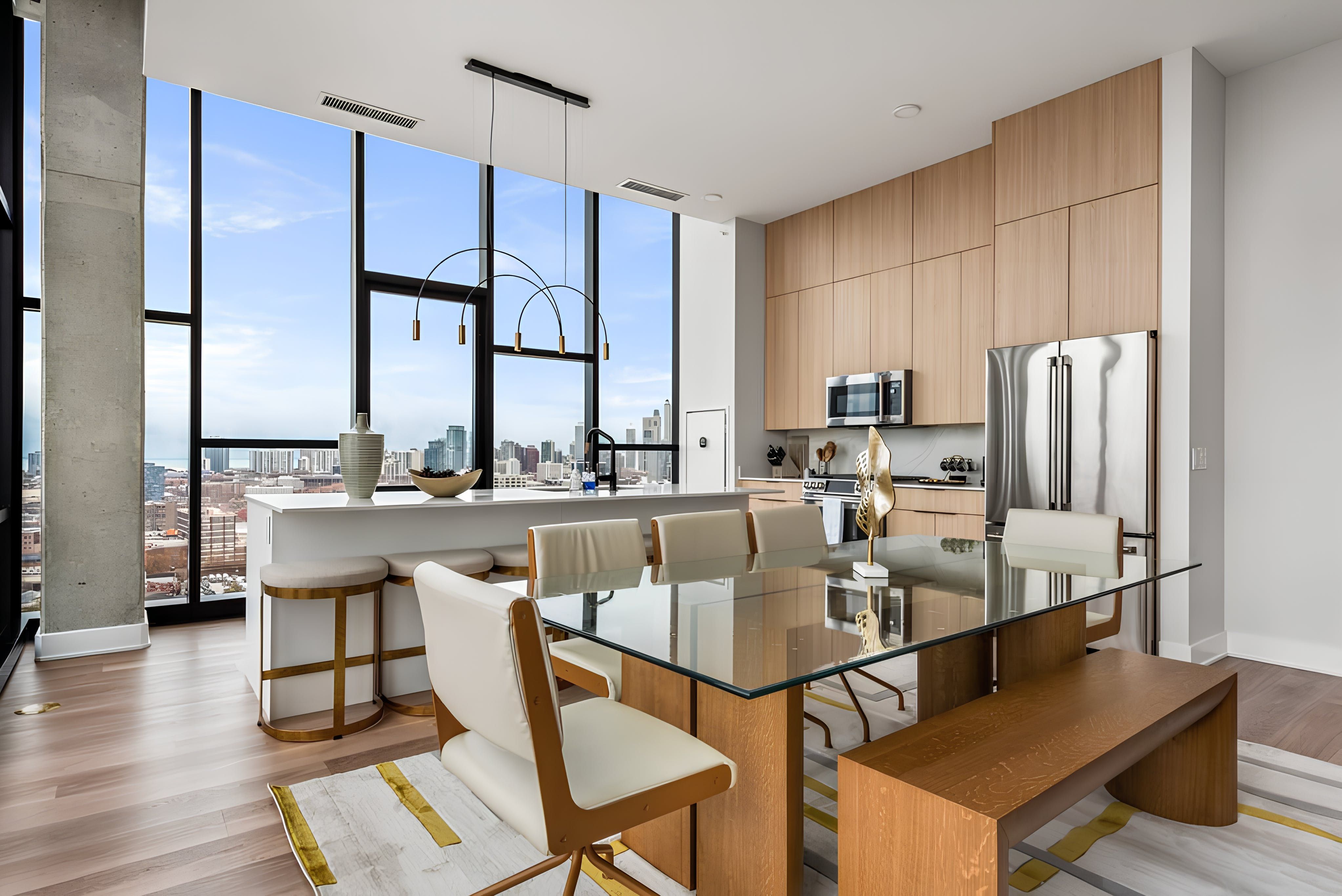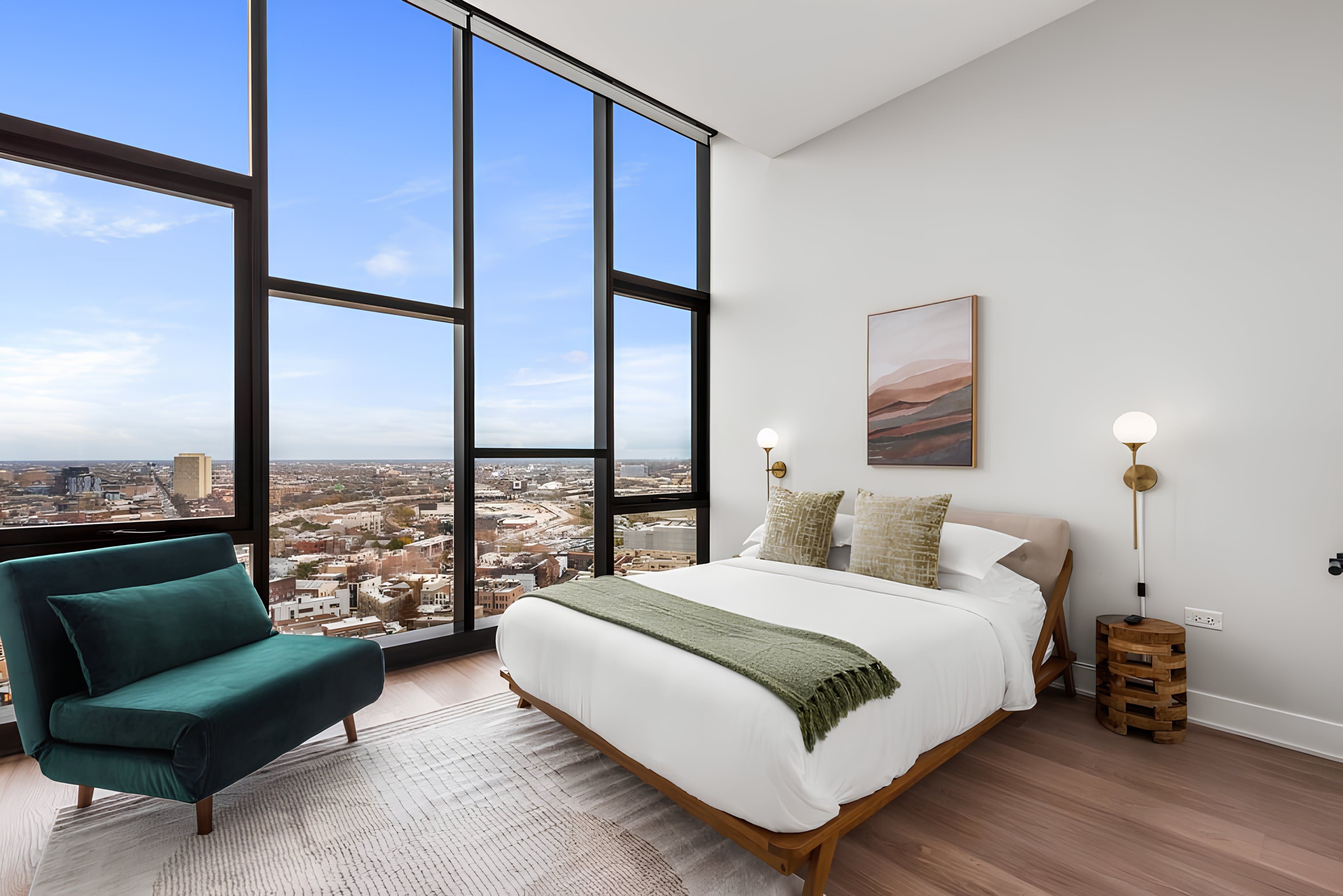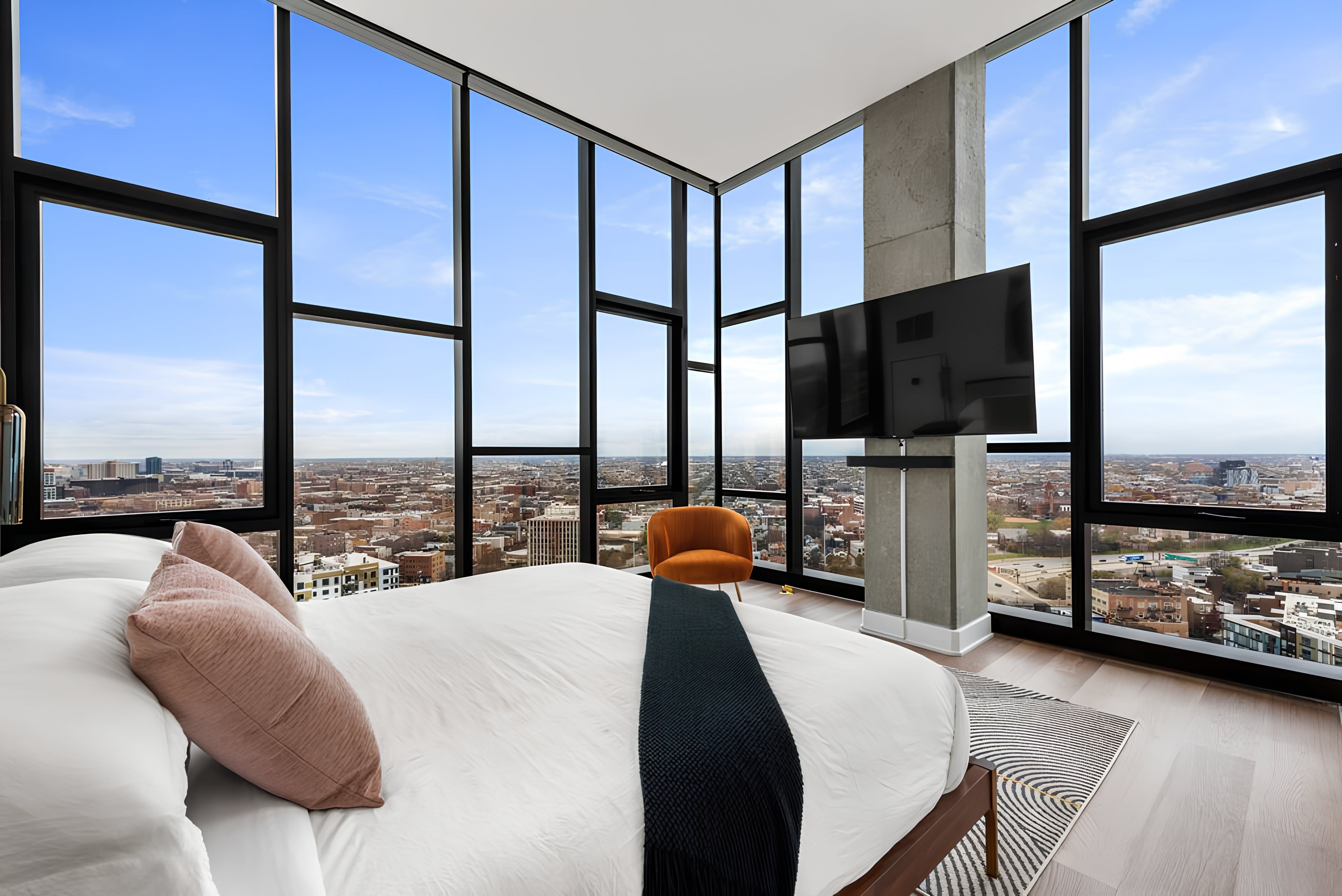 These two modern penthouses with cityscape views are perfect for families or groups visiting Chicago – especially if you like a little more privacy. Each penthouse has three bedrooms, bathrooms, a living space and a kitchen. You'll have access to the building's shared amenities here, including a gym and yoga studio, swimming pool, grilling stations, and a coworking space for catching up on emails. Centrally located, it's a short walk from bars and restaurants, and a quick drive or bus ride from Chicago hotspots like the Old Town, Logan Square, and Fulton Market.