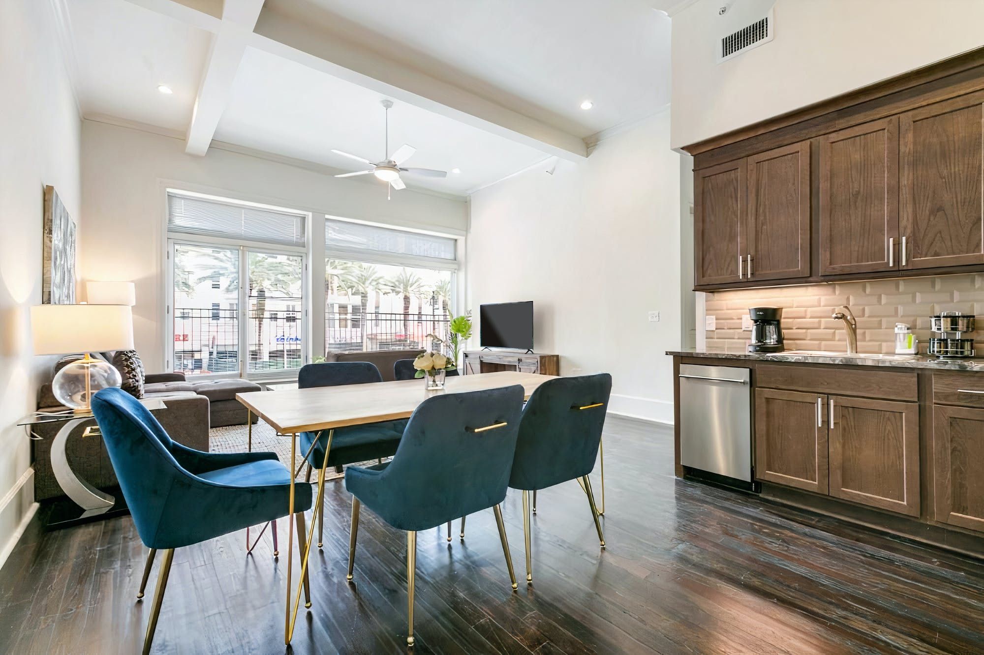 Inside, high ceilings and hardwood floors make an instantly charming impression with stylish contemporary furnishings adding to the chic welcome. We love how much natural light pours in through the living area’s floor-to-ceiling windows and the dining area’s chic table that beckons homemade Southern feasts when you’re not out sampling the local food scene.