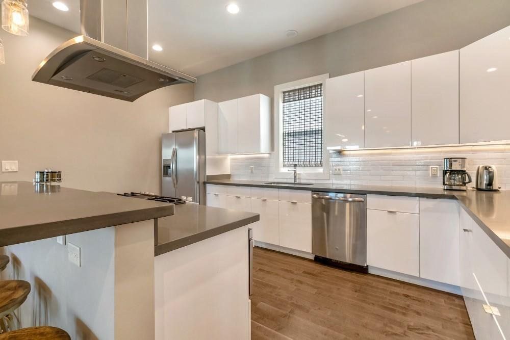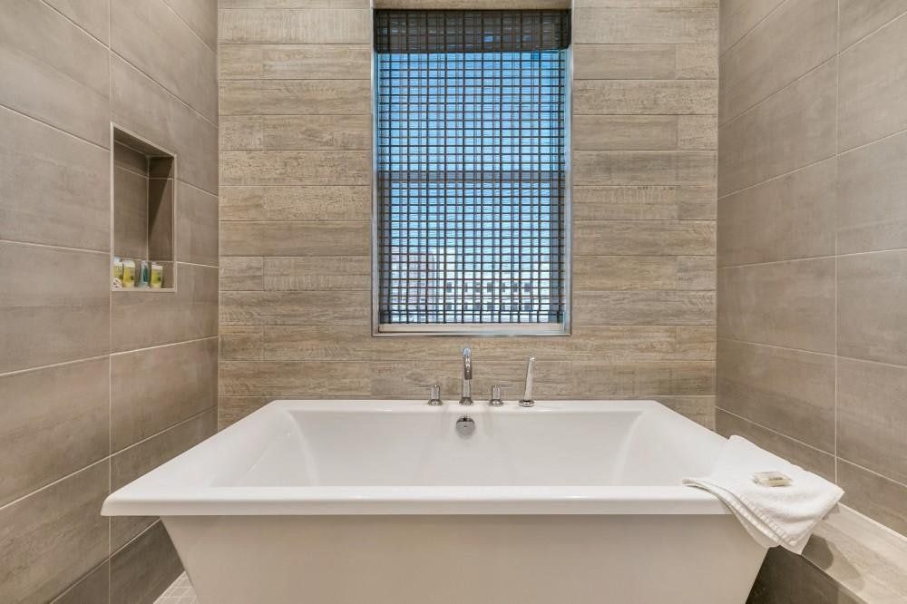 Families or groups of friends that enjoy socialising will appreciate the large, open living area. Striking velvet blue sofas sit against the lightwood floor and crisp white walls, drawing the eye as you enter. Choose to plot the day’s adventures at the sleek breakfast bar or the dining table and admire New Orleans themed artwork on the wall to get you in the mood to visit the French Quarter. The big range-style cooker in the kitchen will keep chefs of the group happy, while plush beds with tufted velvet headboards offer respite for those that like sound sleep.