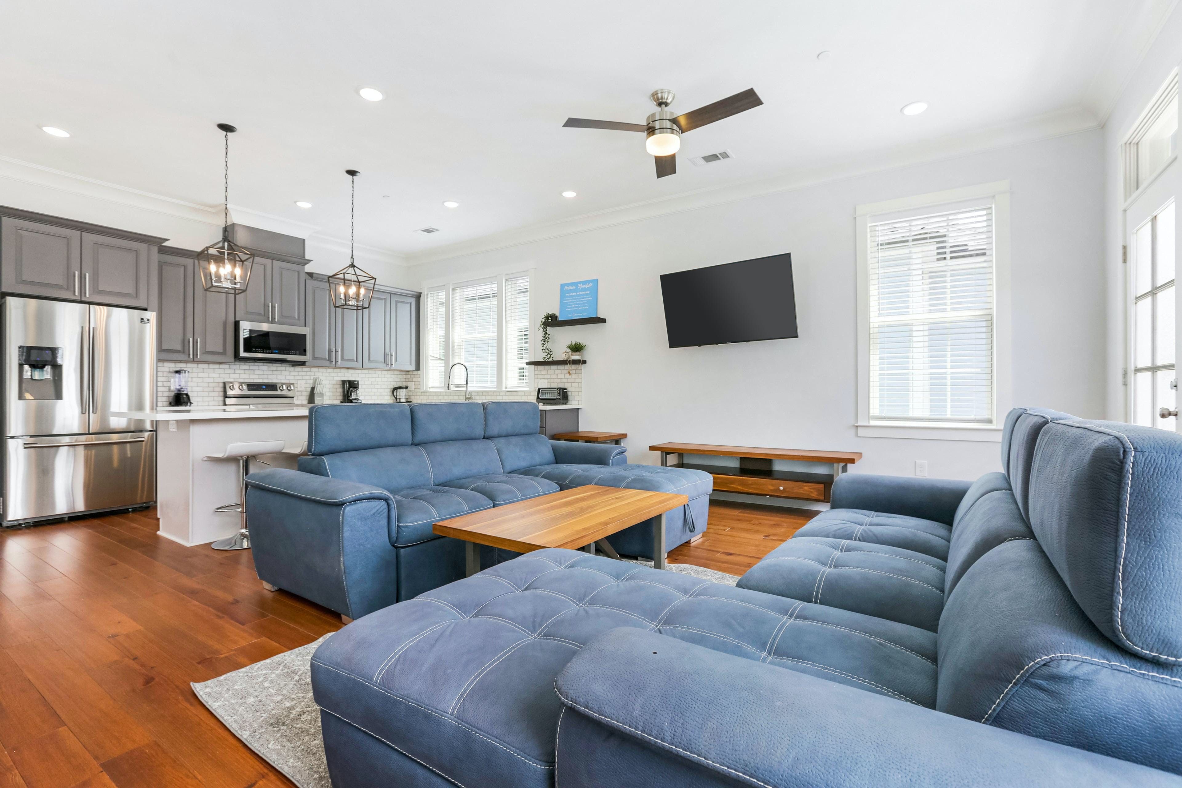 The living space is a great place to hang out between your adventures, with huge sofas and plenty of natural light. You can start each morning with a coffee at the breakfast bar, and the kitchen is well-equipped for you to whip up your favourite Cajun dishes. On sunny Louisiana days, head out to the shared swimming pool for a refreshing dip, before kicking back on a sun lounger with a good book. And, if you're feeling competitive, you can always challenge your guests to a game of giant chess outside in the courtyard.