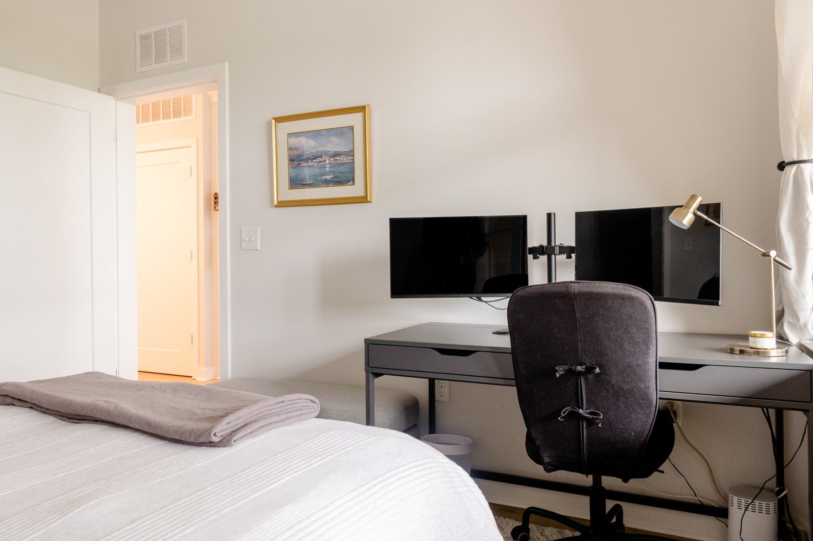 Combining chic, laid-back living with an air of sophistication, this apartment in the heart of West Street, Annapolis, is a stylish base from which to discover the local Arts District. A bright open space finished with elegant furnishings and accessories throughout presents the perfect place to balance work with play and a spot of relaxation too. Each of the bedrooms features large desk areas, ideal for setting up a laptop should you need to work from home during your stay. With walk-in closets, there's ample space for unpacking and getting ready here too. Meanwhile, the kitchen and living area create a sociable space for everyone to come together after a day out in Annapolis. The covered balcony allows for a peaceful indoor-outdoor entertaining space that is idyllic for a restful afternoon or an alfresco dinner under the fairy lights. We love the pleasant views and refreshing greenary that surrounds the home as it offers calming views from the balcony and windows. When you're feeling relaxed and restored, head out to explore the city – with most destinations within walking distance, you'll be in easy reach of local coffee shops, restaurants, galleries, boutiques and music venues. It's a creative's dream come true. Source some inspiration from the local sights on foot, or take advantage of the Annapolis' public transportation system (the Circulator), which allows you to get around the city during daytime hours for absolutely free. Not to mention you'll also be just a fifty-minute drive away from America's capital city, Washington DC.