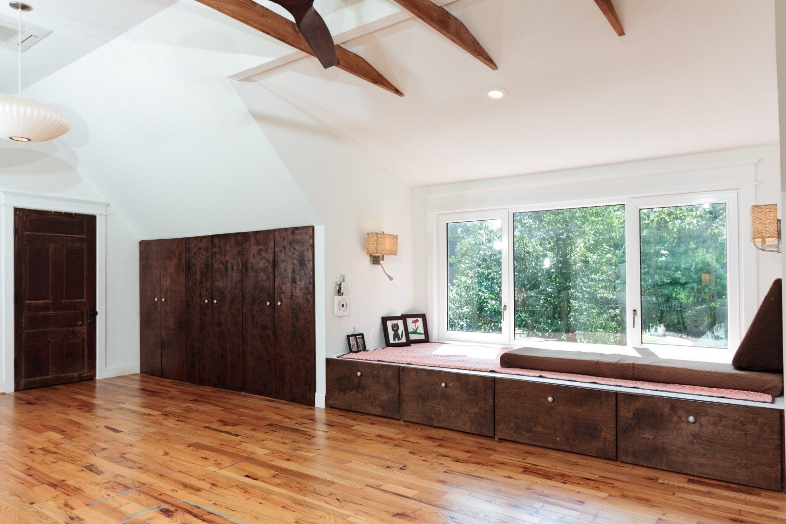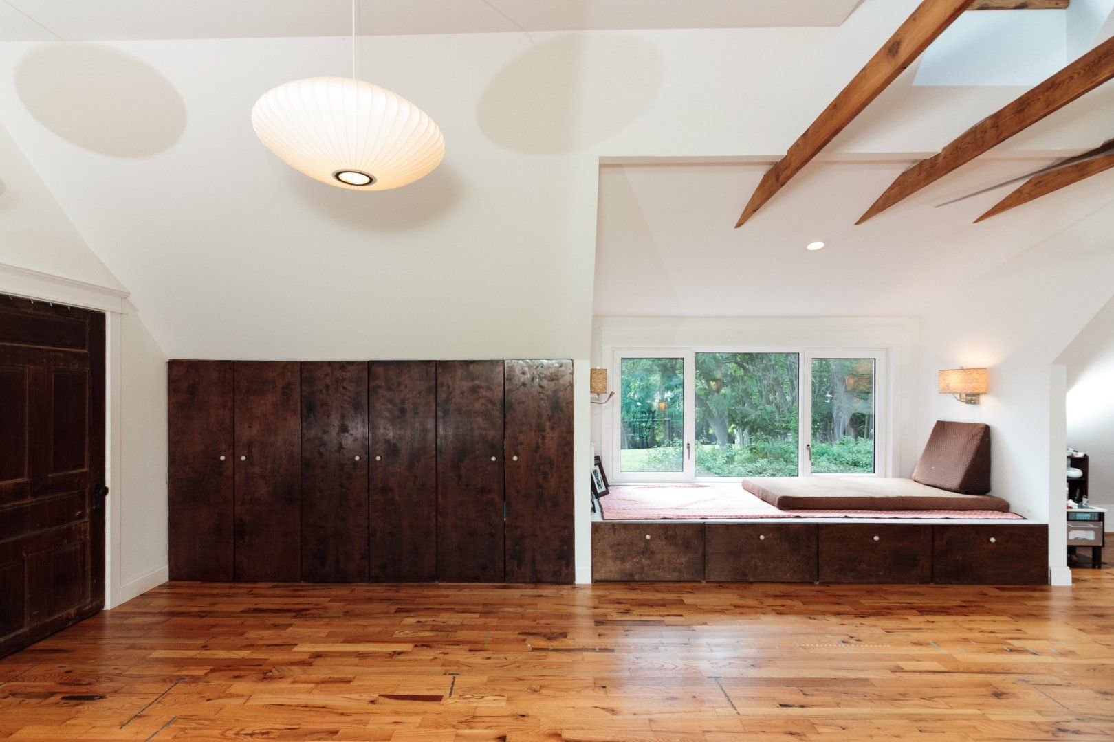 The home's structure dates back to the mid-1800s and retains original oak beam ceilings and a stunning fireplace at the heart of the living room. We particularly love how the bookshelves of the living room and bedrooms inject a pop of colour and emphasise the space's homely character with heaps of charm. Picture yourselves drifting off in the peaceful bedrooms with a book selected from the library in hand. During the daytime, you can also find a reading corner at the window seat in the large play space/ yoga room located in the converted hayloft.