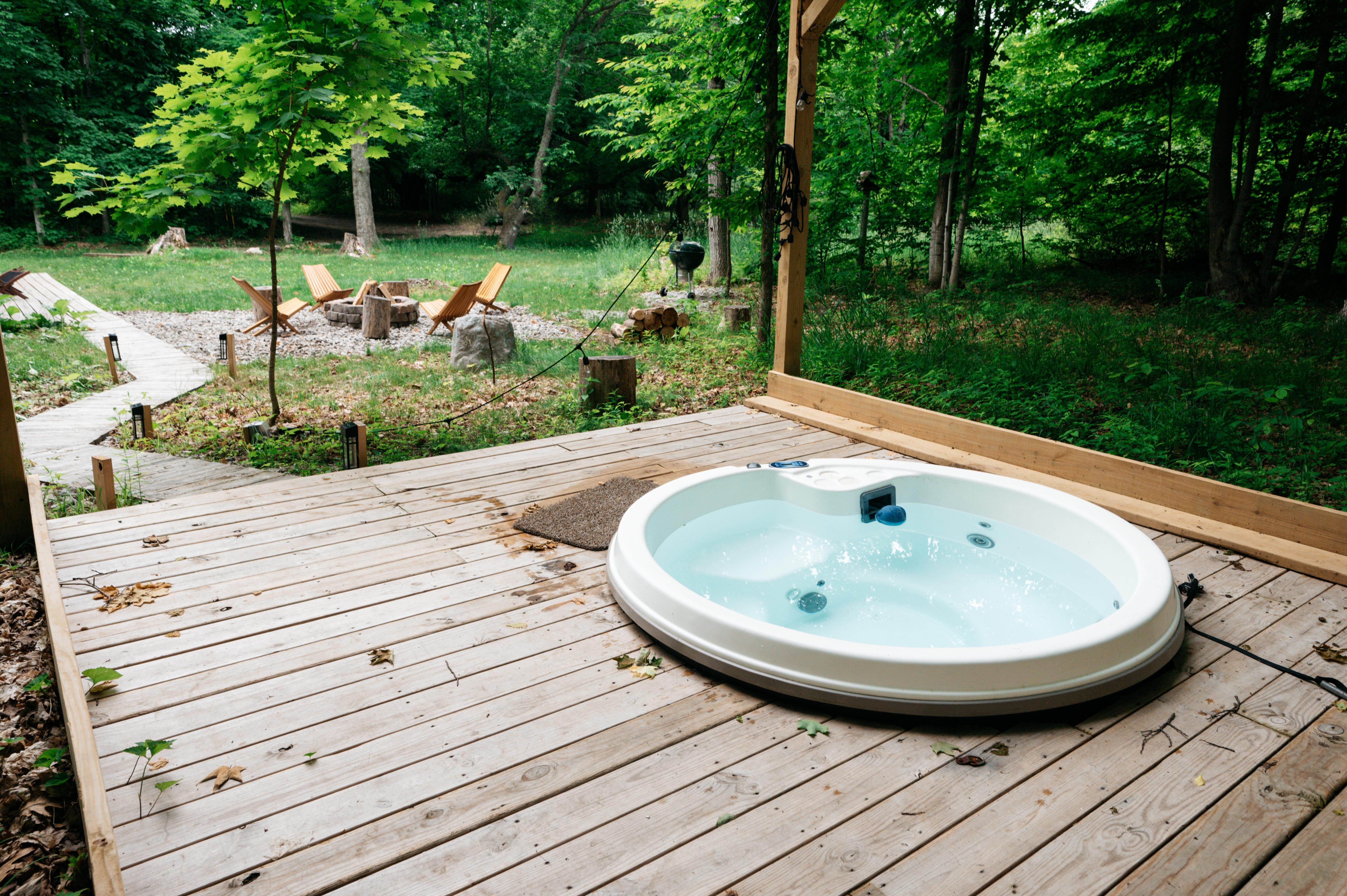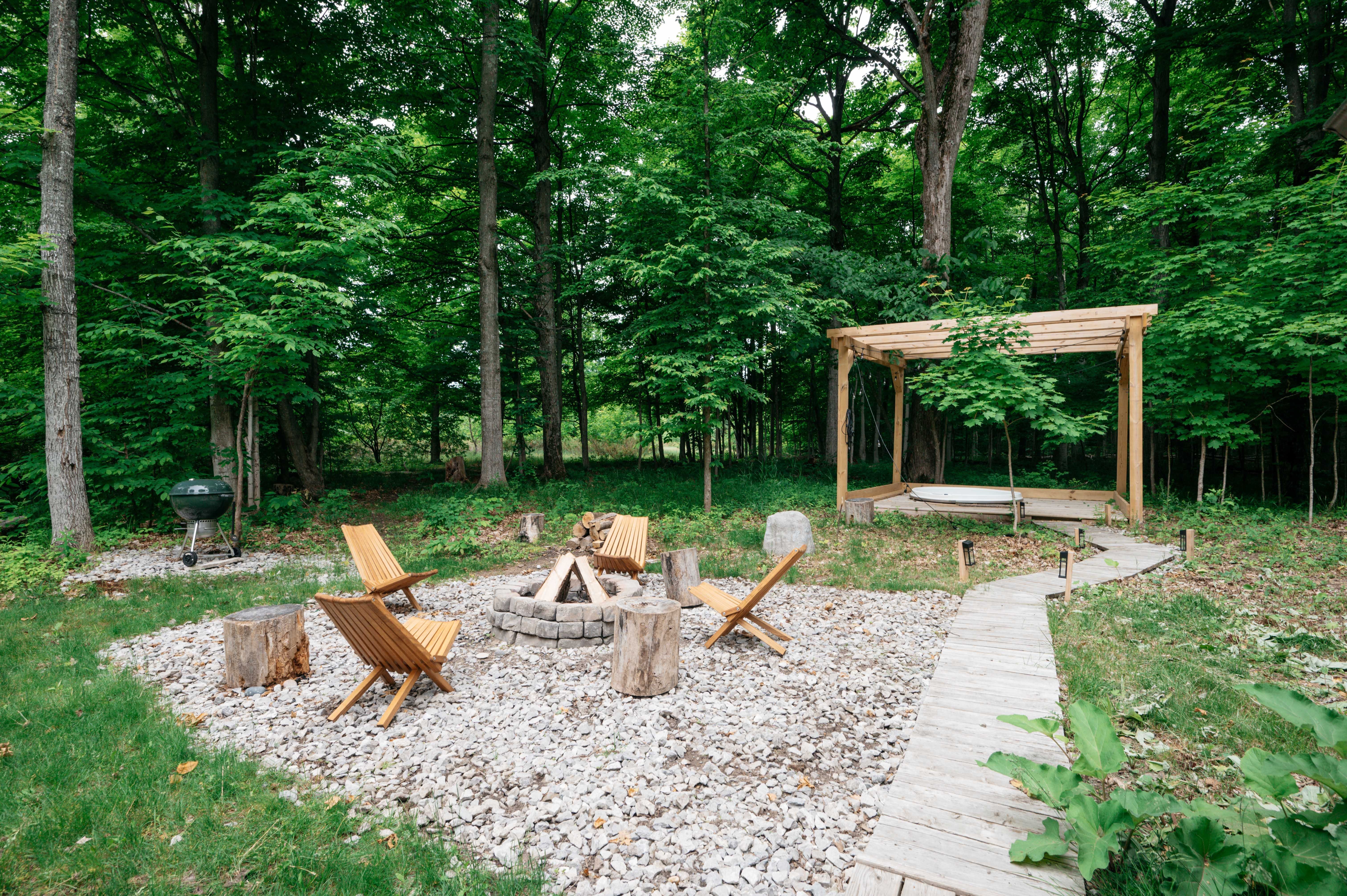 Outside, you'll find a beautiful unfenced garden area that extends into the surrounding forest. Gather around the fire pit for cosy evenings spent stargazing or roasting s'mores before having a dip in the jacuzzi hot tub amidst nature's fresh air.
