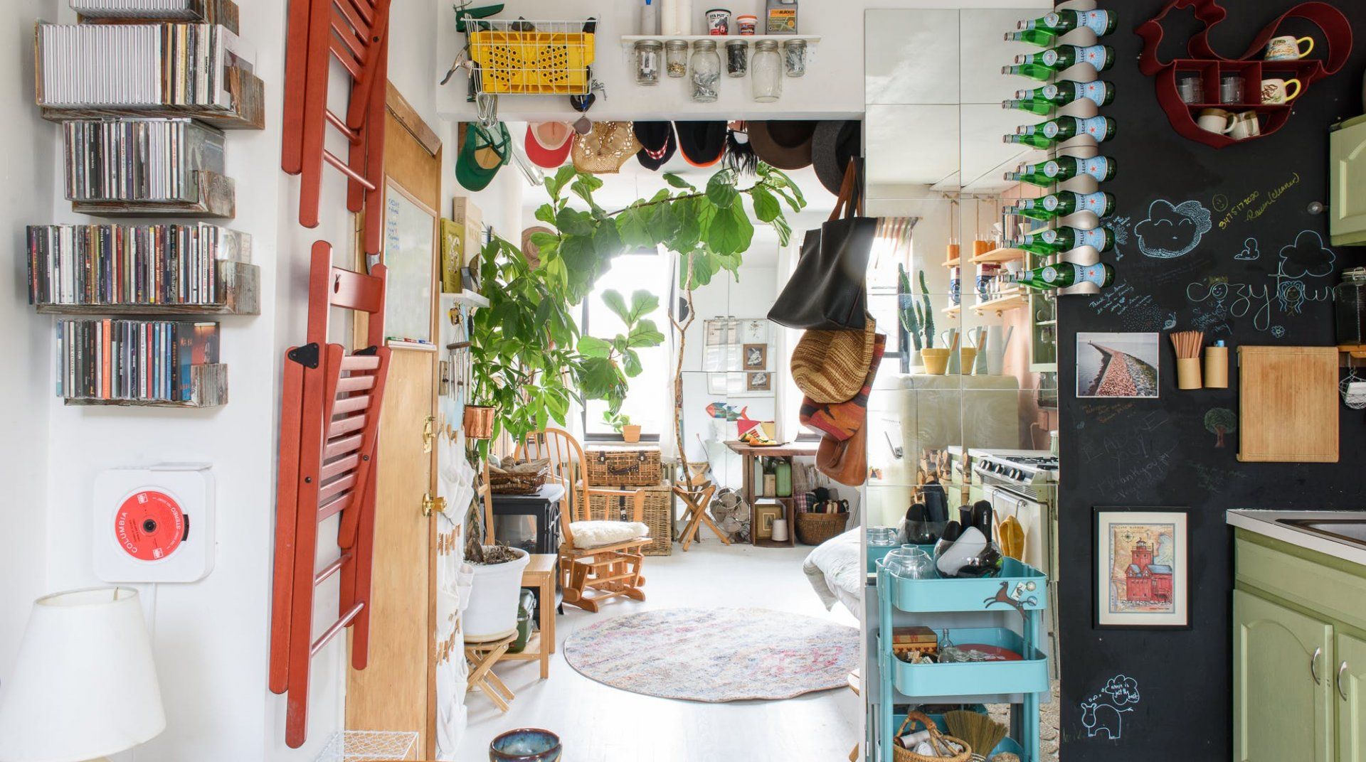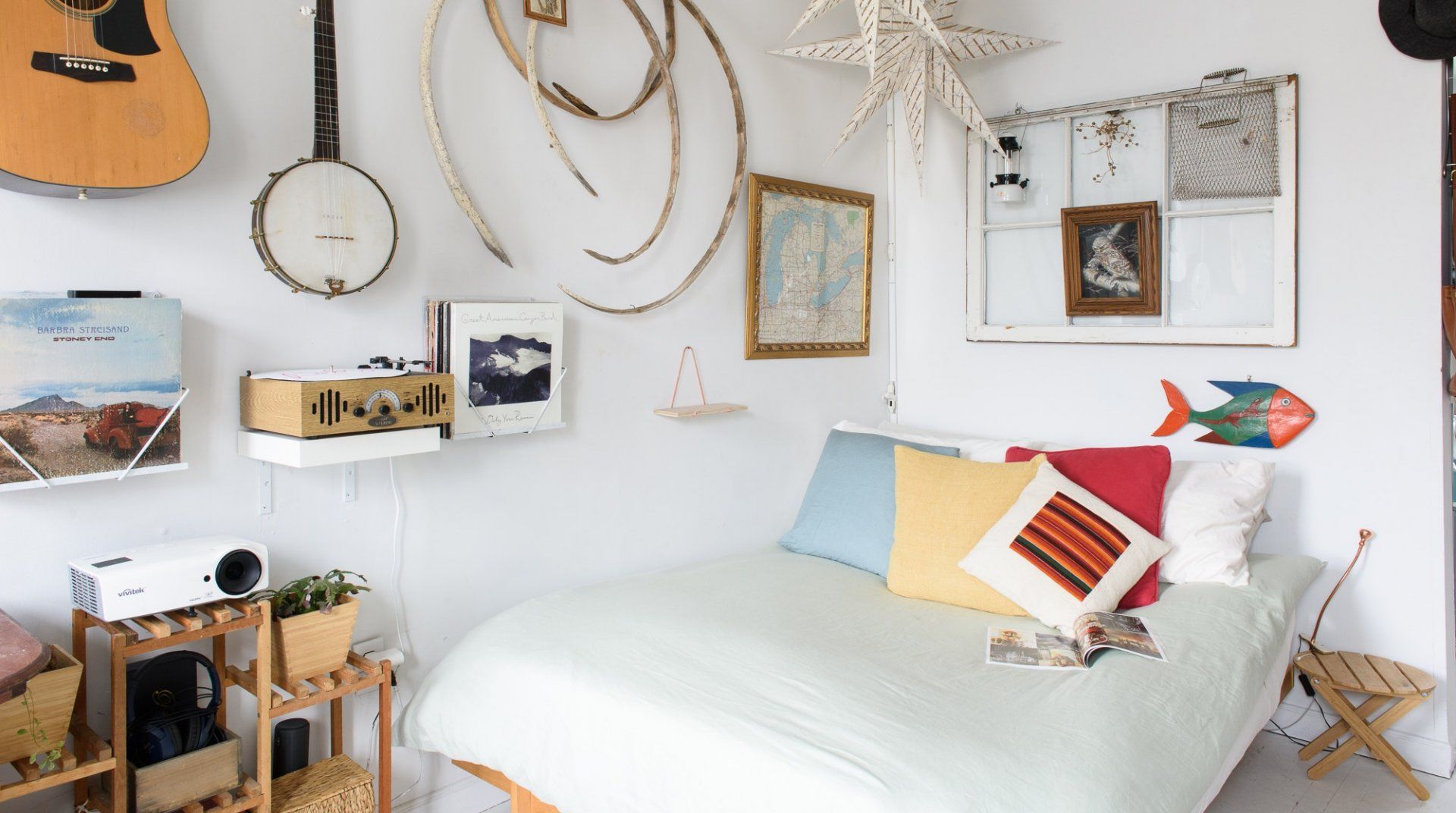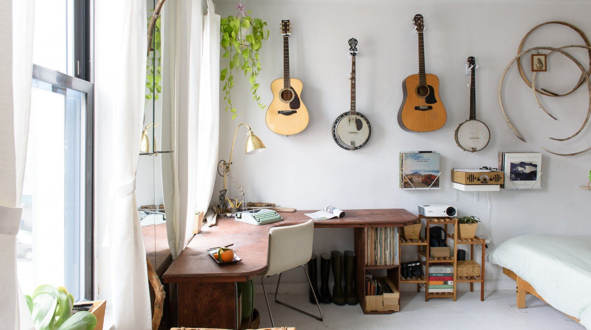 True to some conceptions of a Brooklynite, this home reveals an inside look at the life of a travelling musician. Hung on the walls are several string instruments and bookshelves are filled with records – passions that will undoubtedly inspire any passer-by. Select a soundtrack and set it to play on the record player, while you pour yourself a glass of wine. It's relaxing moments like these, that offer respite from the buzz of New York City living.