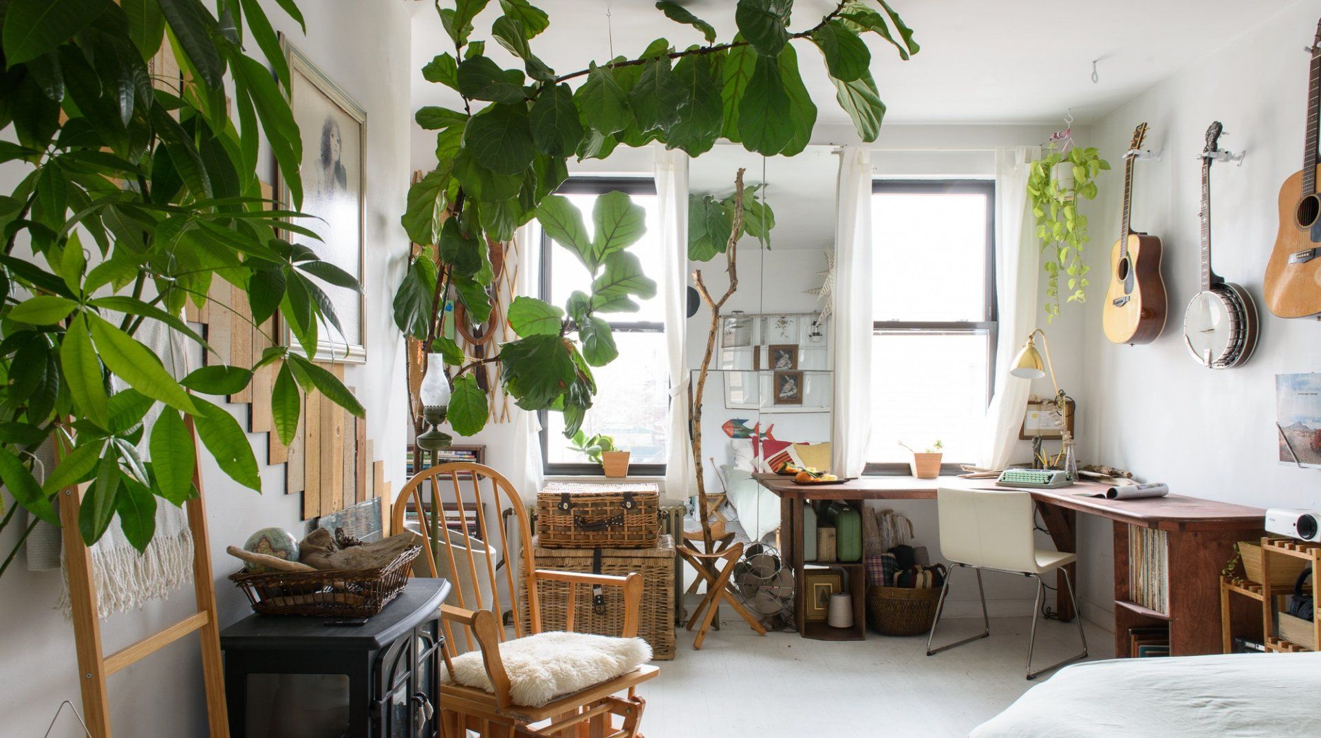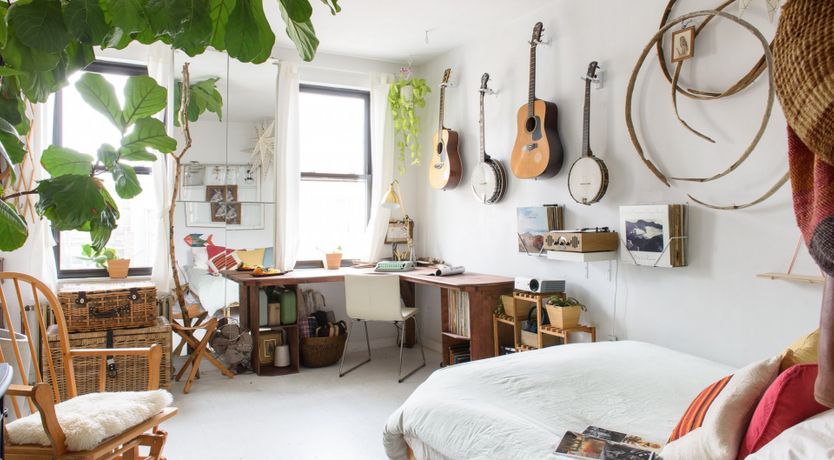 Soak in the bright ambience of the bedroom boasting leafy plants and relaxing, earthy hues. The home's fabulous, bohemian styling can be credited to actress Annie McCain Engman who designed the space to accentuate its classic NYC style aesthetic in a creative and laid-back manner.