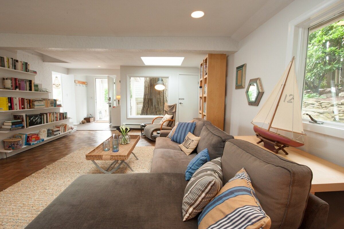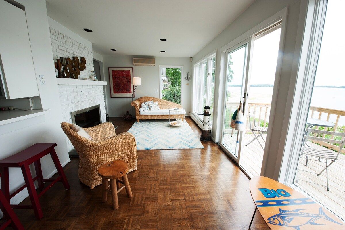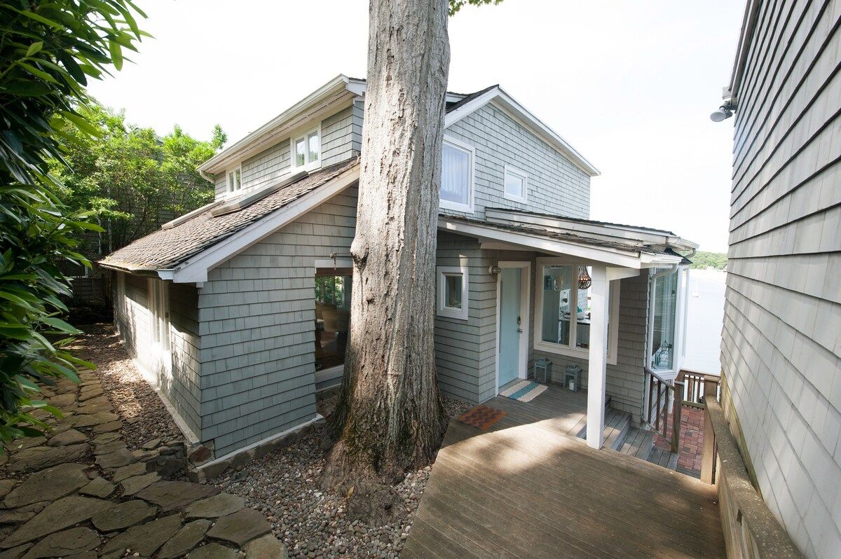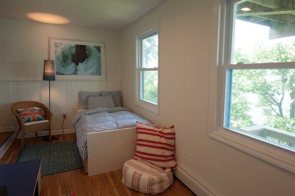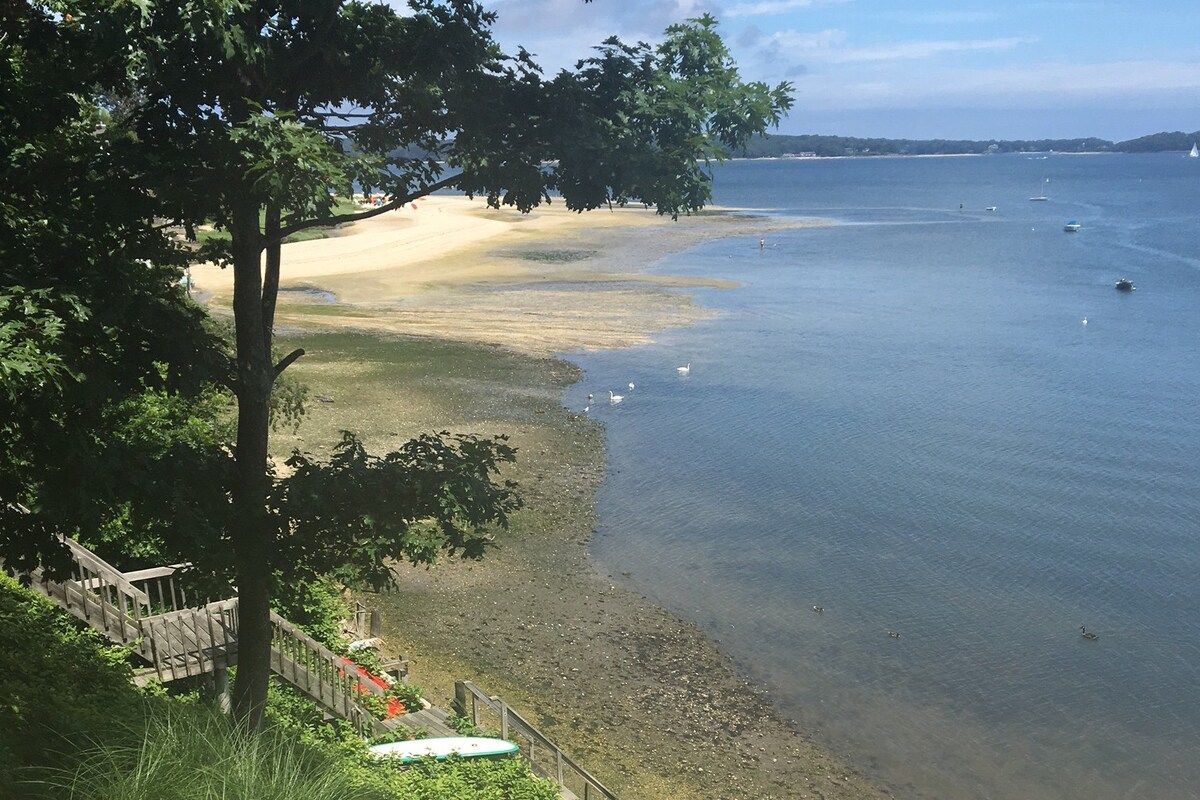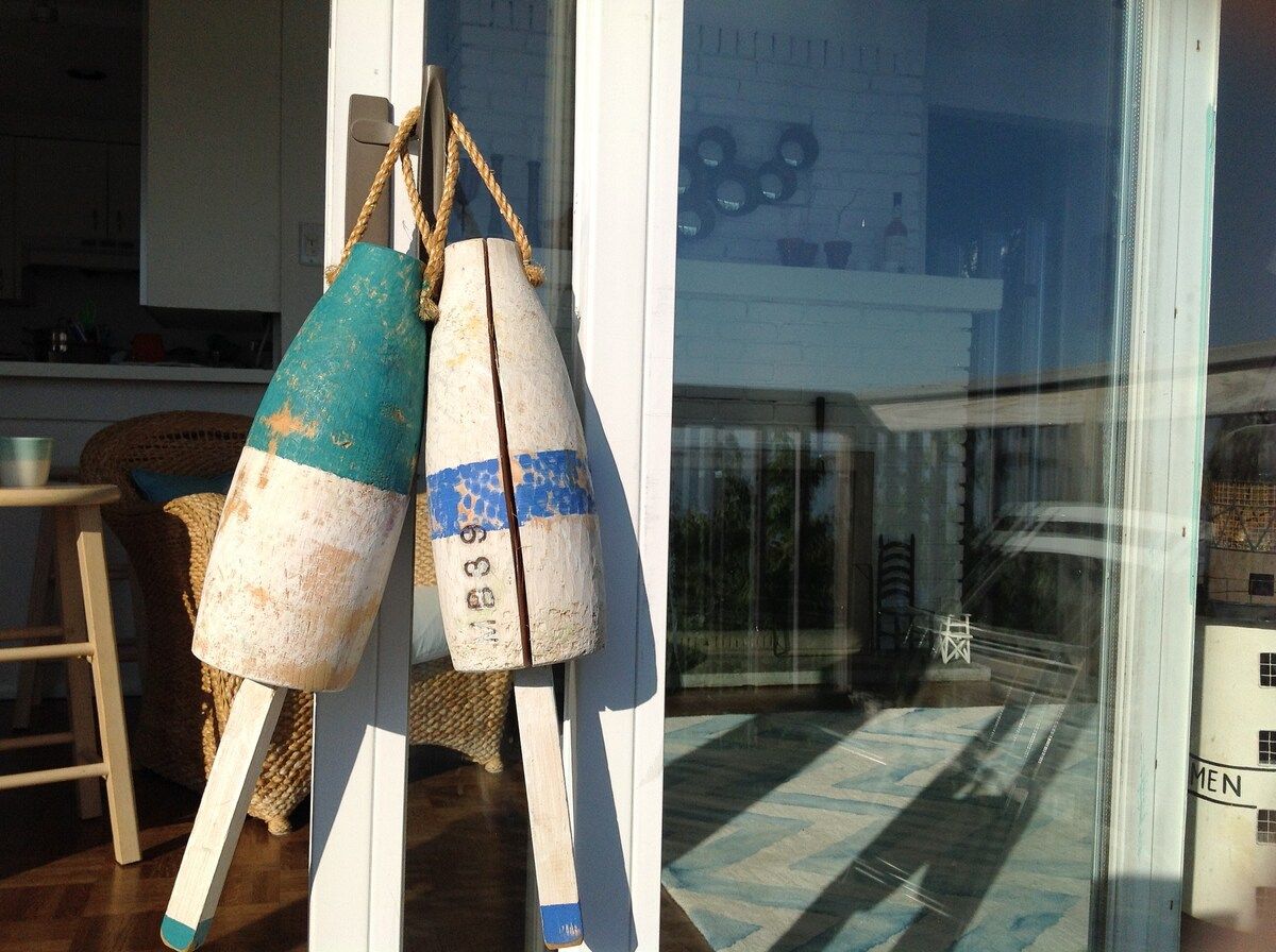 This characterful beach house is located in a quiet neighbourhood of Centerport, perfectly placed for you to explore Long Island. Perched on the headland, it boasts spectacular bay views. Stairs lead directly down to the beach where you can enjoy a morning swim or amble across the sands. We love this house for its serene feeling – even inside you feel close to nature, with large windows letting in lots of natural light and offering spectacular views of an ancient oak tree. The interior design enjoys a characterful nautical theme, delivering a blue palette, sailing boats, wicker chairs and panelled finishings. There are several areas for lounging, so you can snuggle up with a film or a book beside the fire, or simply head out onto the decking with a glass of wine and enjoy the sea air. This home offers the perfect city escape, and just one hour from Brooklyn and New York City.