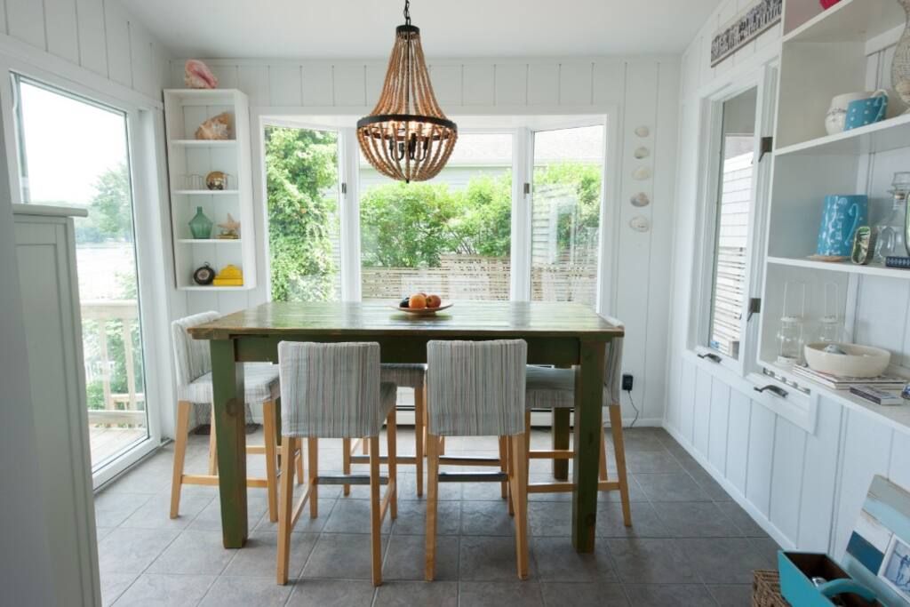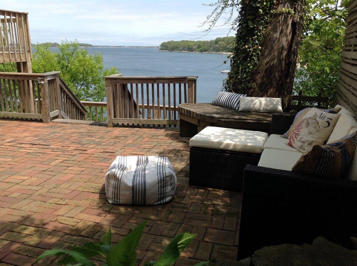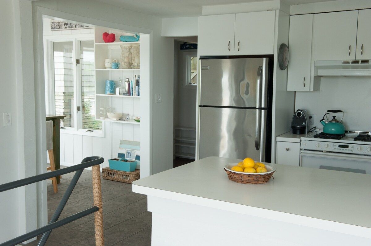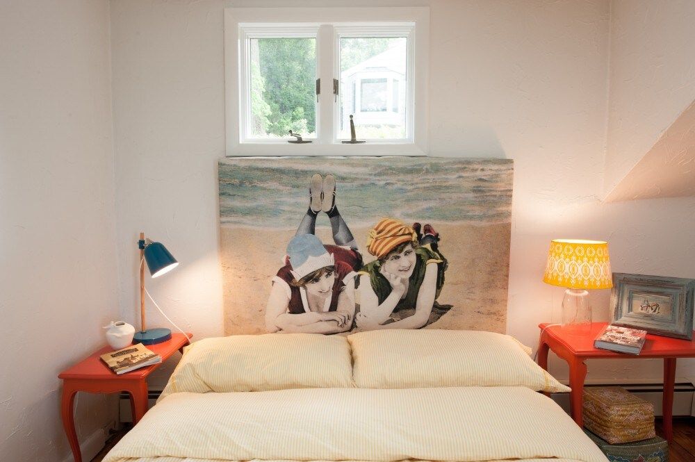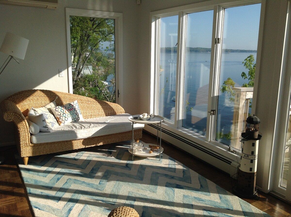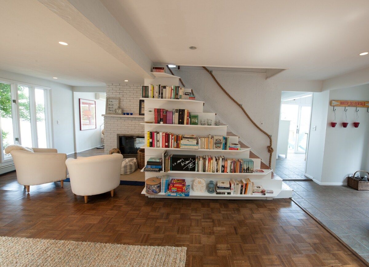 This characterful beach house is located in a quiet neighbourhood of Centerport, perfectly placed for you to explore Long Island. Perched on the headland, it boasts spectacular bay views. Stairs lead directly down to the beach where you can enjoy a morning swim or amble across the sands. We love this house for its serene feeling – even inside you feel close to nature, with large windows letting in lots of natural light and offering spectacular views of an ancient oak tree. The interior design enjoys a characterful nautical theme, delivering a blue palette, sailing boats, wicker chairs and panelled finishings. There are several areas for lounging, so you can snuggle up with a film or a book beside the fire, or simply head out onto the decking with a glass of wine and enjoy the sea air. This home offers the perfect city escape, and just one hour from Brooklyn and New York City.