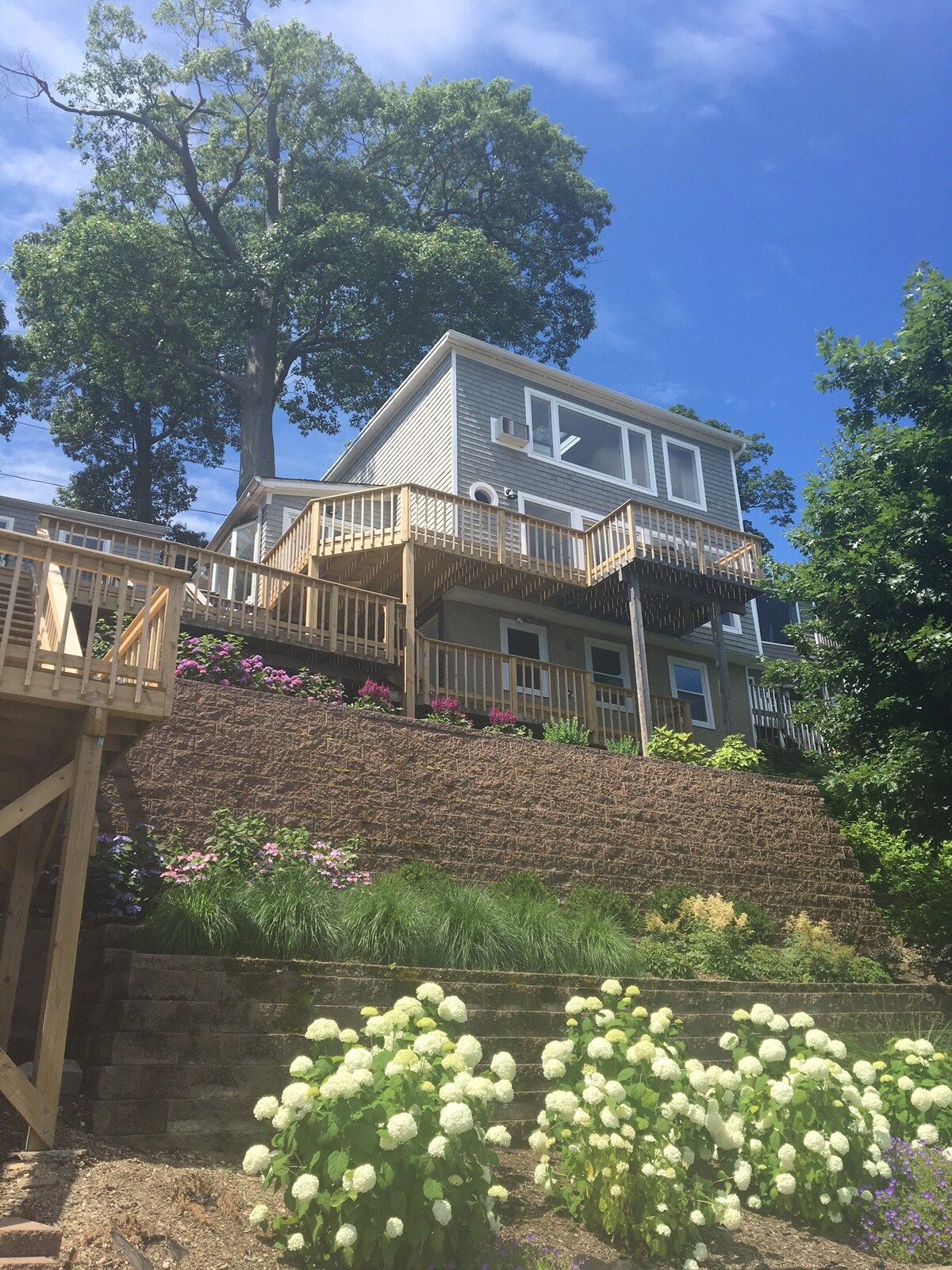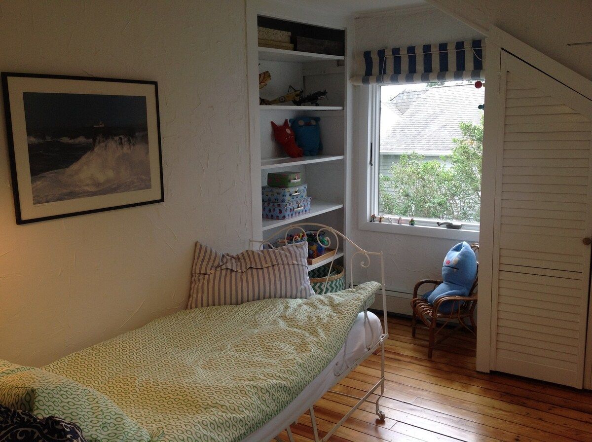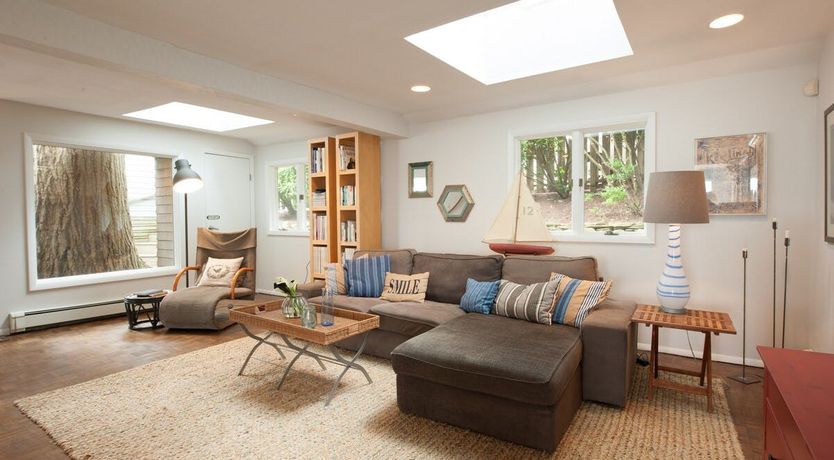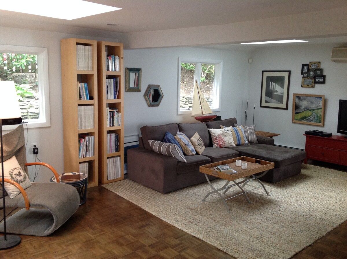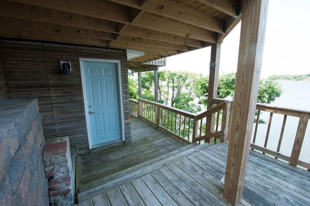 This characterful beach house is located in a quiet neighbourhood of Centerport, perfectly placed for you to explore Long Island. Perched on the headland, it boasts spectacular bay views. Stairs lead directly down to the beach where you can enjoy a morning swim or amble across the sands. We love this house for its serene feeling – even inside you feel close to nature, with large windows letting in lots of natural light and offering spectacular views of an ancient oak tree. The interior design enjoys a characterful nautical theme, delivering a blue palette, sailing boats, wicker chairs and panelled finishings. There are several areas for lounging, so you can snuggle up with a film or a book beside the fire, or simply head out onto the decking with a glass of wine and enjoy the sea air. This home offers the perfect city escape, and just one hour from Brooklyn and New York City.