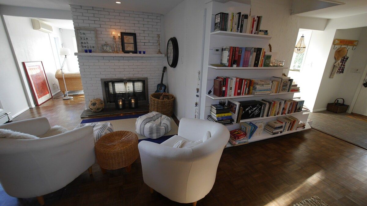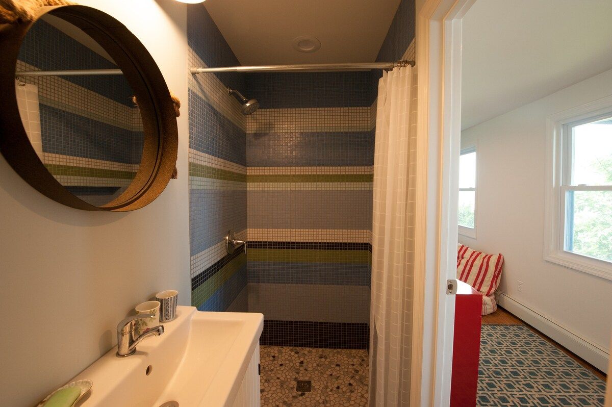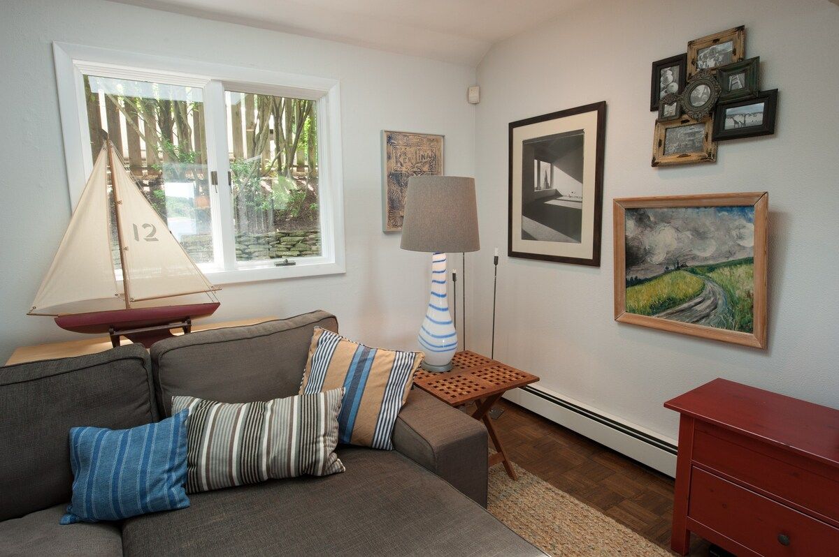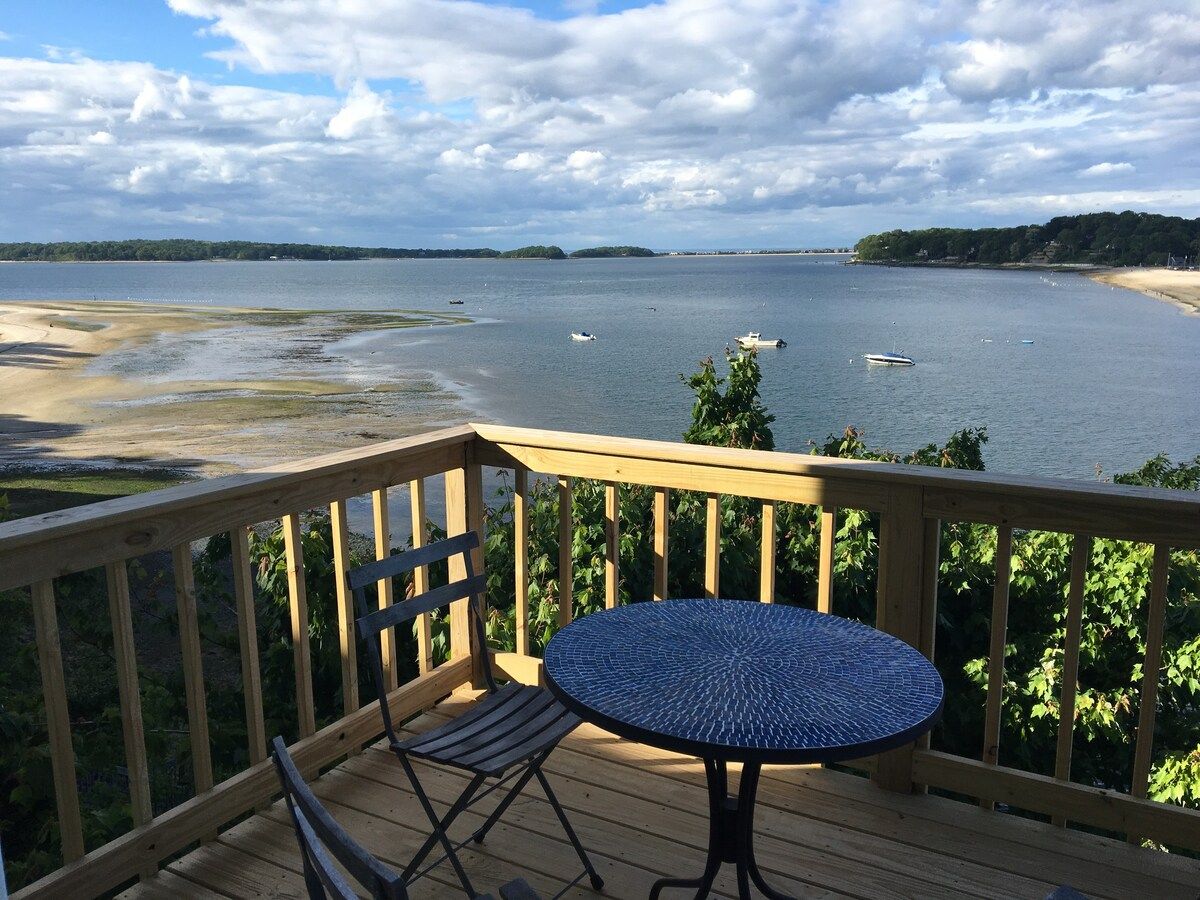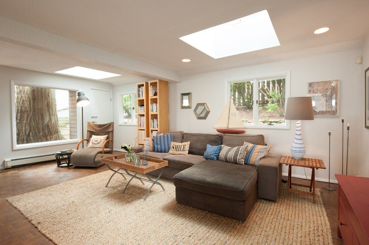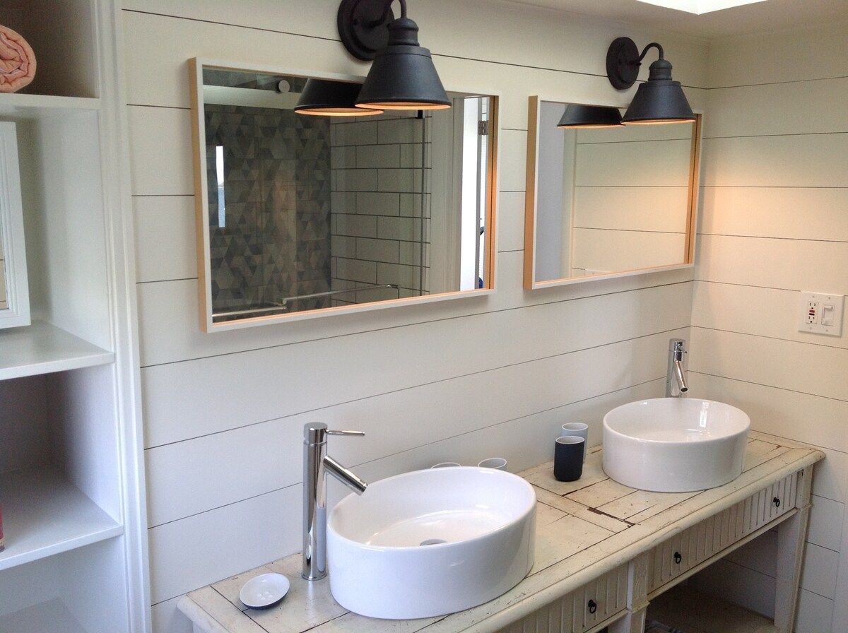 This characterful beach house is located in a quiet neighbourhood of Centerport, perfectly placed for you to explore Long Island. Perched on the headland, it boasts spectacular bay views. Stairs lead directly down to the beach where you can enjoy a morning swim or amble across the sands. We love this house for its serene feeling – even inside you feel close to nature, with large windows letting in lots of natural light and offering spectacular views of an ancient oak tree. The interior design enjoys a characterful nautical theme, delivering a blue palette, sailing boats, wicker chairs and panelled finishings. There are several areas for lounging, so you can snuggle up with a film or a book beside the fire, or simply head out onto the decking with a glass of wine and enjoy the sea air. This home offers the perfect city escape, and just one hour from Brooklyn and New York City.