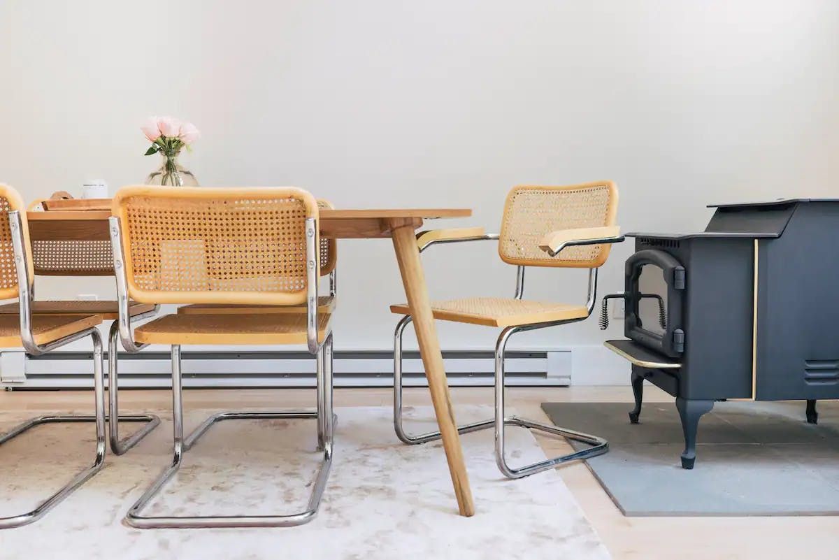 Inside, a towering vaulted ceiling and huge windows make this place feel bright and breezy whatever the time of year. All-white walls and Scandinavian styling are anything but rustic and the comfy modular sofa is the perfect place to snuggle in front of the pellet-burning stove on chilly evenings. One bedroom on the ground floor and another loft room make it suitable for a family or a couple of friends, and the pretty kitchen is surprisingly well equipped for cooking at home.