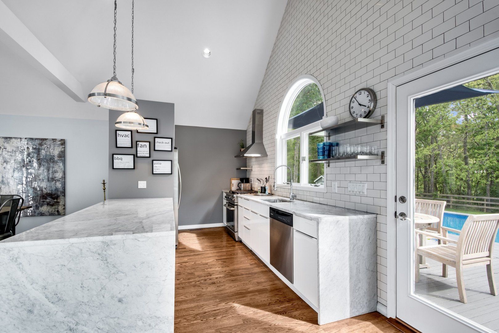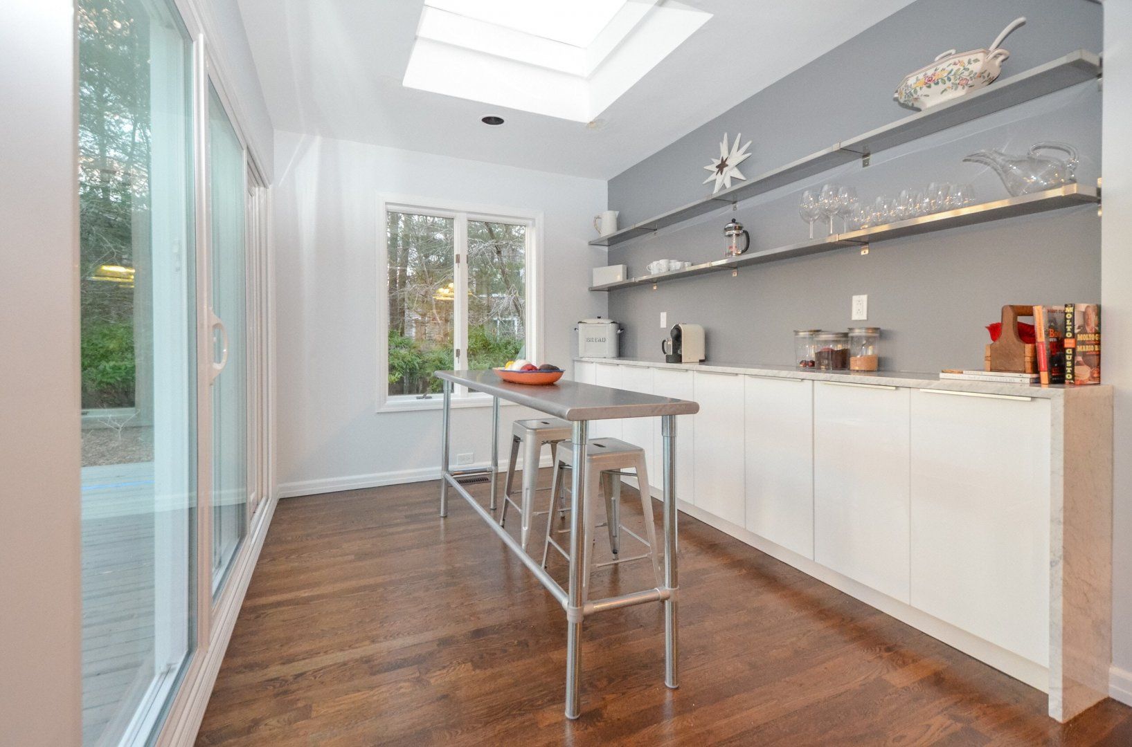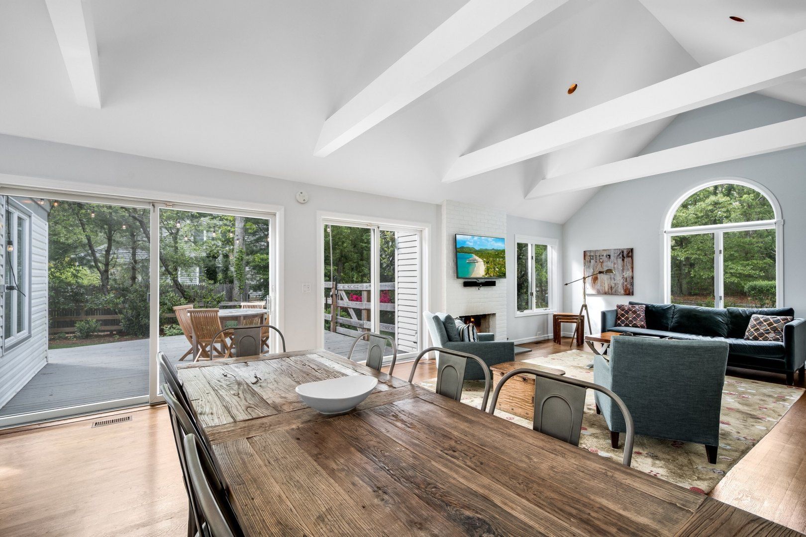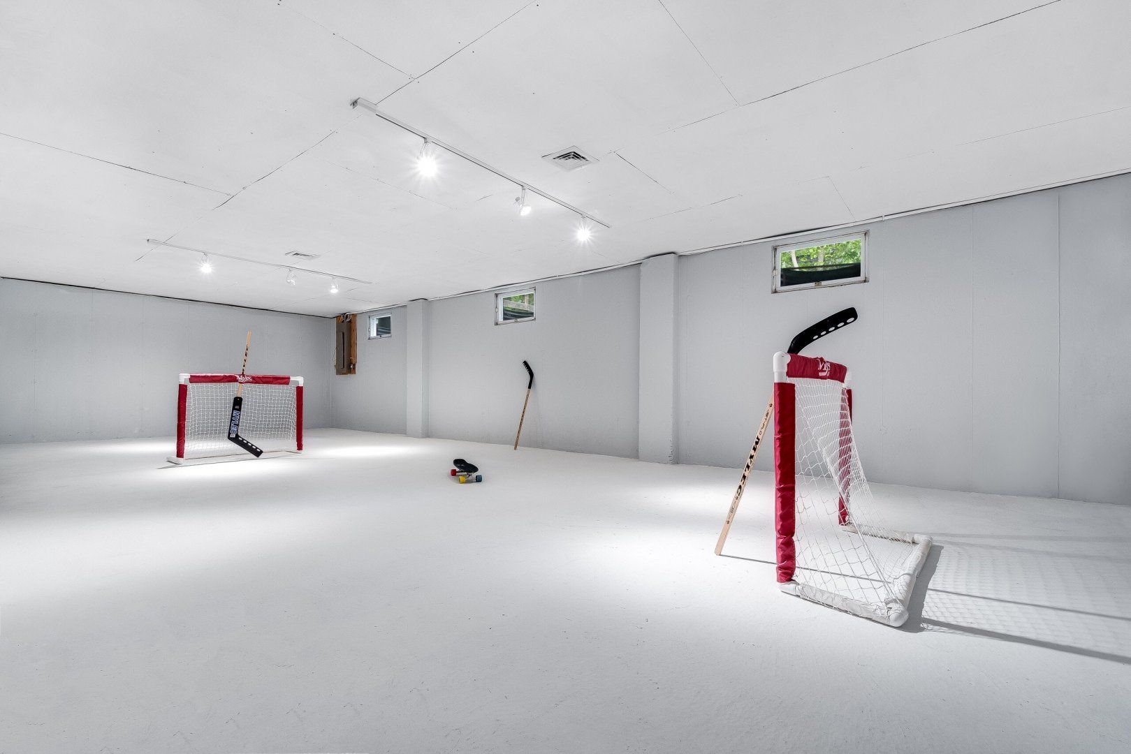 With a swimming pool outside and a huge playroom inside, there's no chance of boredom at this Hamptons retreat. Set in luscious forest near Bridgehampton and Sag Harbor, you're a short drive from shops, restaurants, and activities, while being secluded in your own peaceful bubble. A calming medley of greys, blues, and whites flows throughout the interior. Sliding doors in the living room lead to the outside, letting in plenty of light and a refreshing forest breeze. Choose from a variety of places to relax; around the swimming pool, by the barbecue area, or in the basement where a large space for indoor hockey matches, skateboarding or soccer is separated by glass.