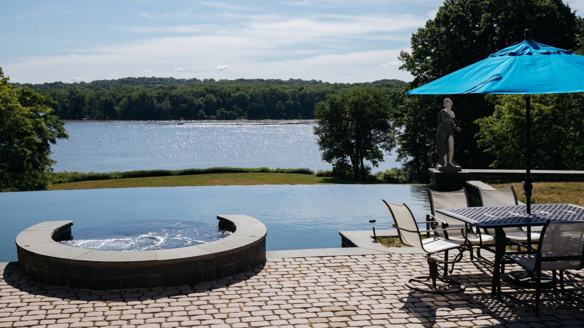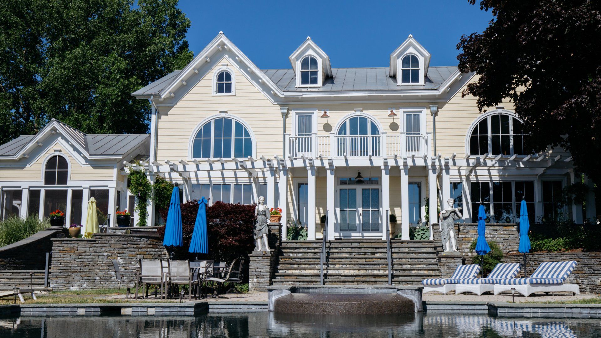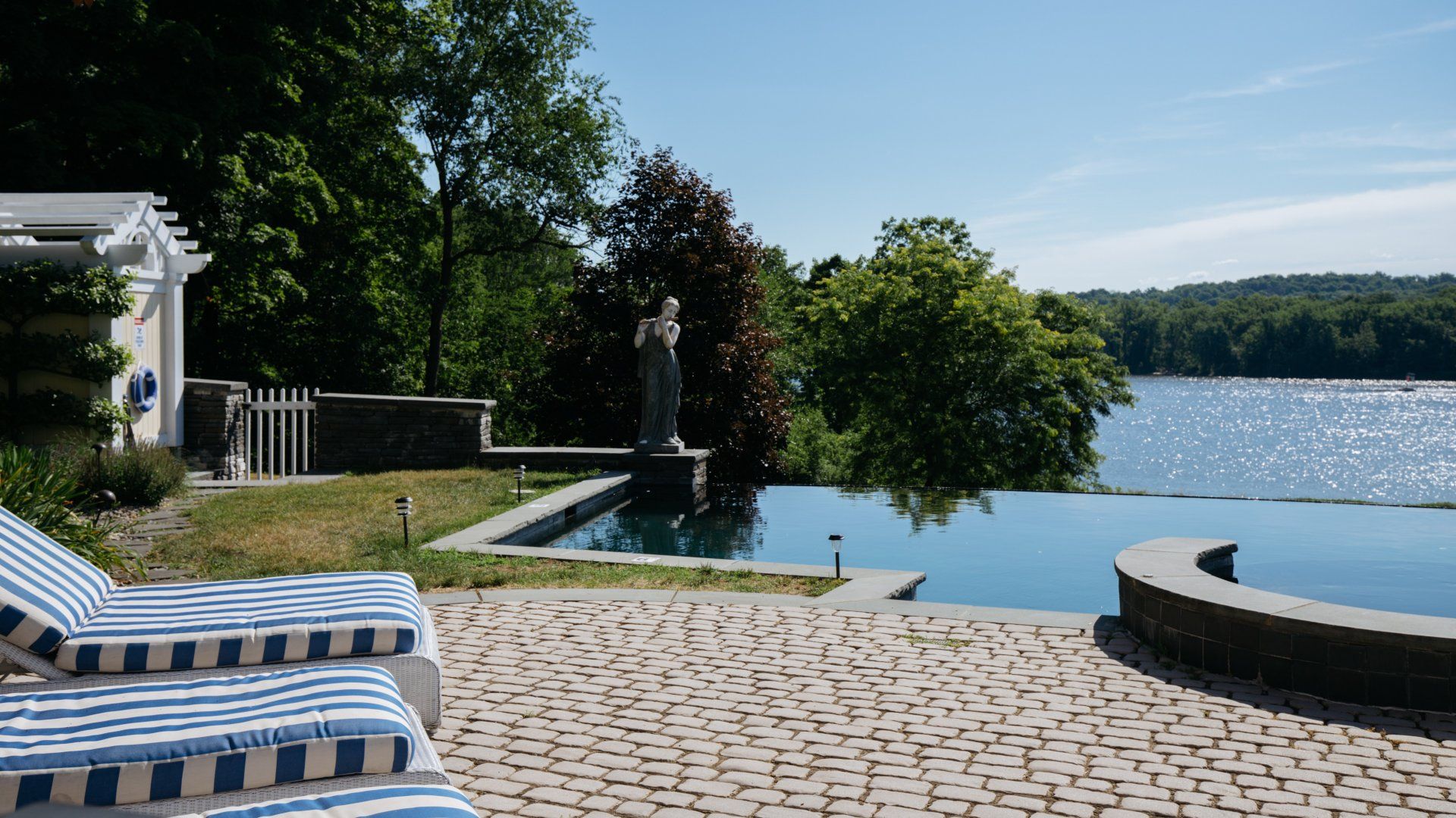 This riverfront home is the kind of getaway we dream of every day. The infinity pool and views of the Hudson River are magnificent – just imagine how calming it is to wake up to views of this calibre every day. Inside, it feels incredibly warm and welcoming, making it perfect for family gatherings and spending time with your loved ones. The screened porch was extremely inviting, it’s the kind of place that inspires you to slow down. While there’s a lot to love about this home, we couldn’t get enough of the garden – manicured and green, it also boasts an infinity pool.