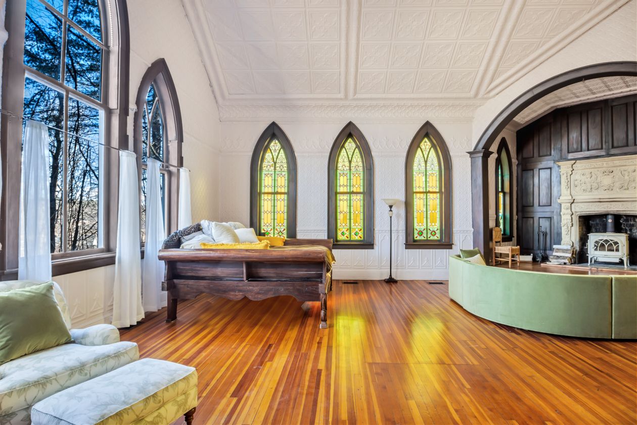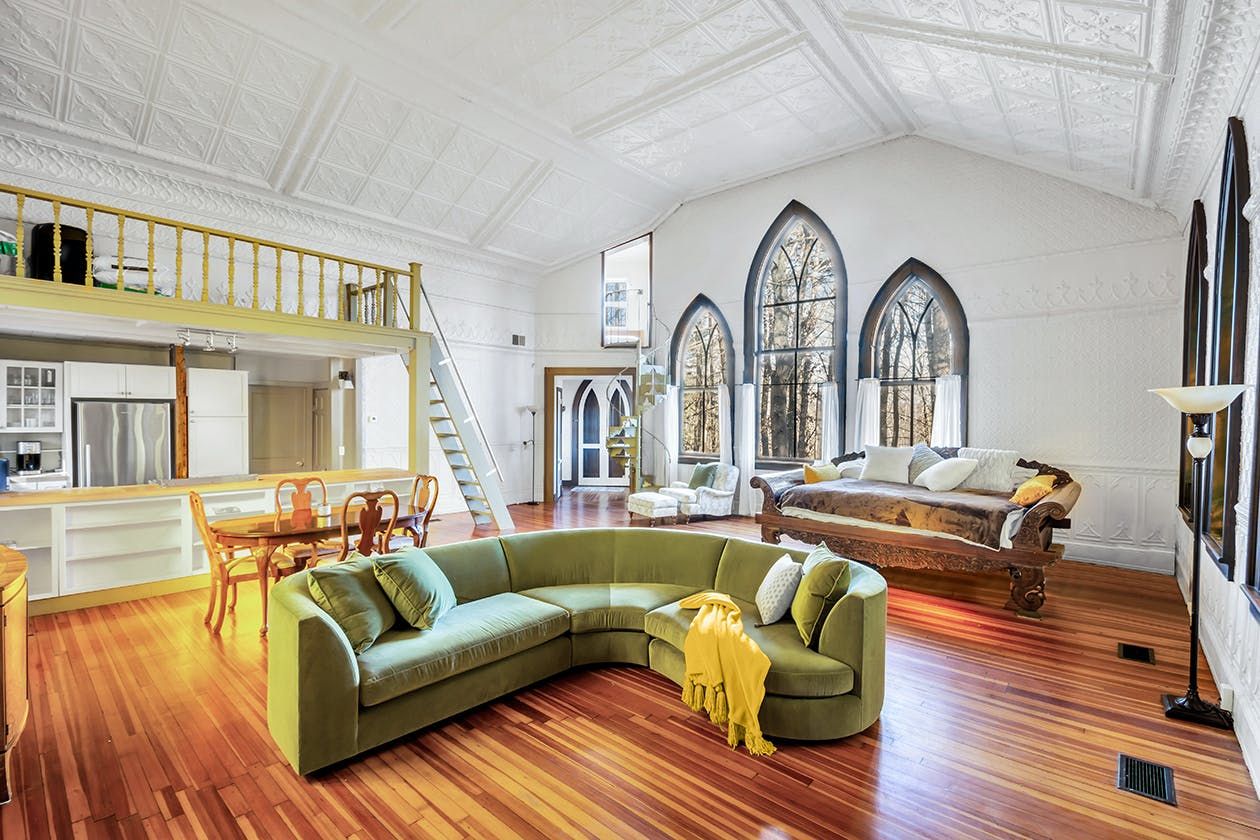 This beautiful old clapboard church has been turned into a woodland retreat like no other, where deer regularly stroll among the trees. Just outside Woodstock, there are craft beer breweries, farm shops and mom and pop coffee shops a short drive away, and trails into the Catskills are all around. From the outside, this home still looks like it holds Sunday Service, tucked in 1.5 acres of forest.