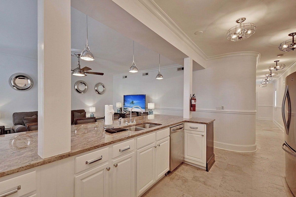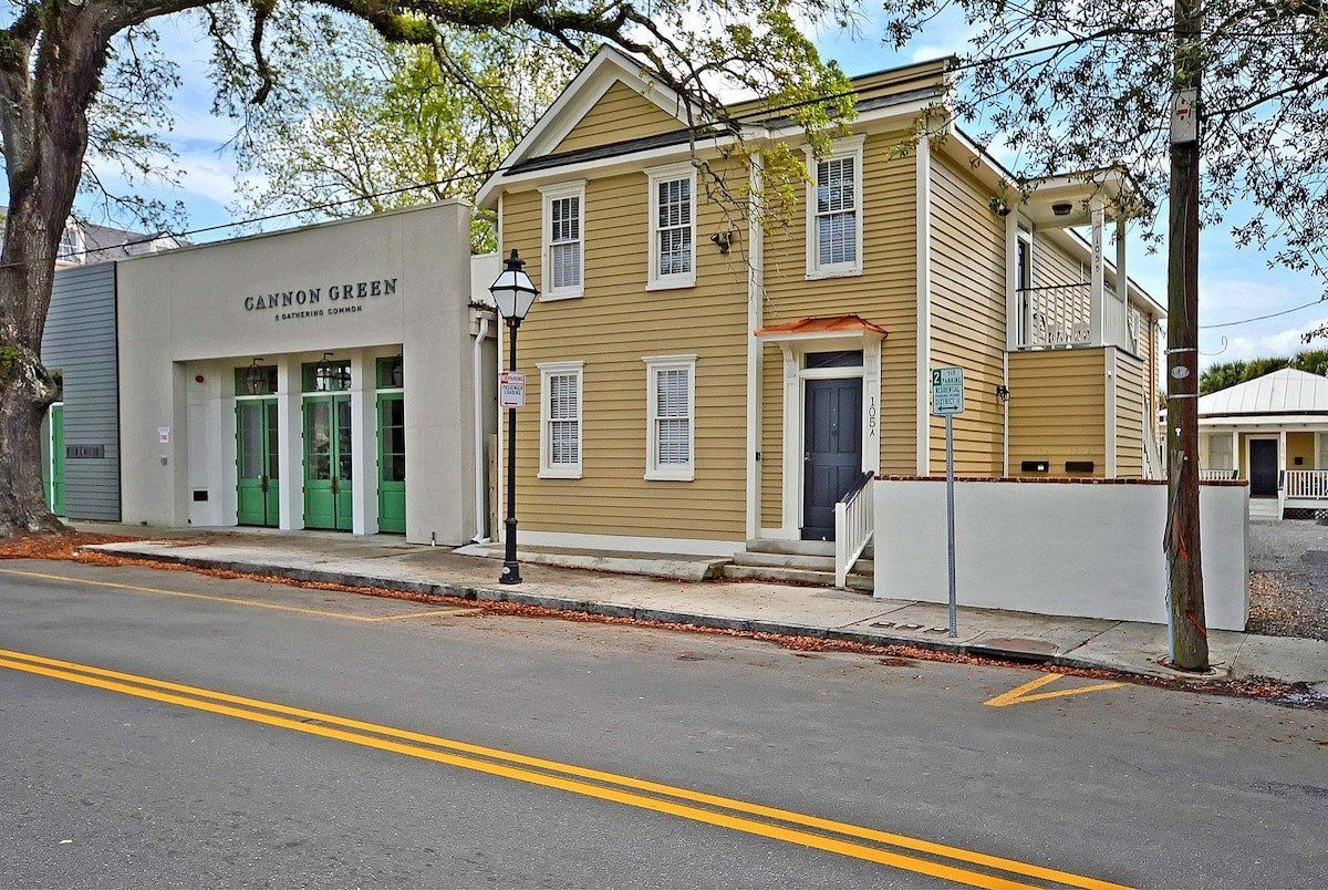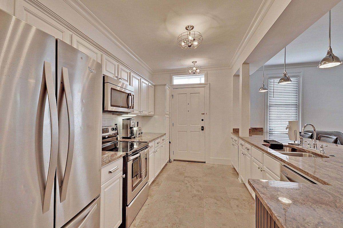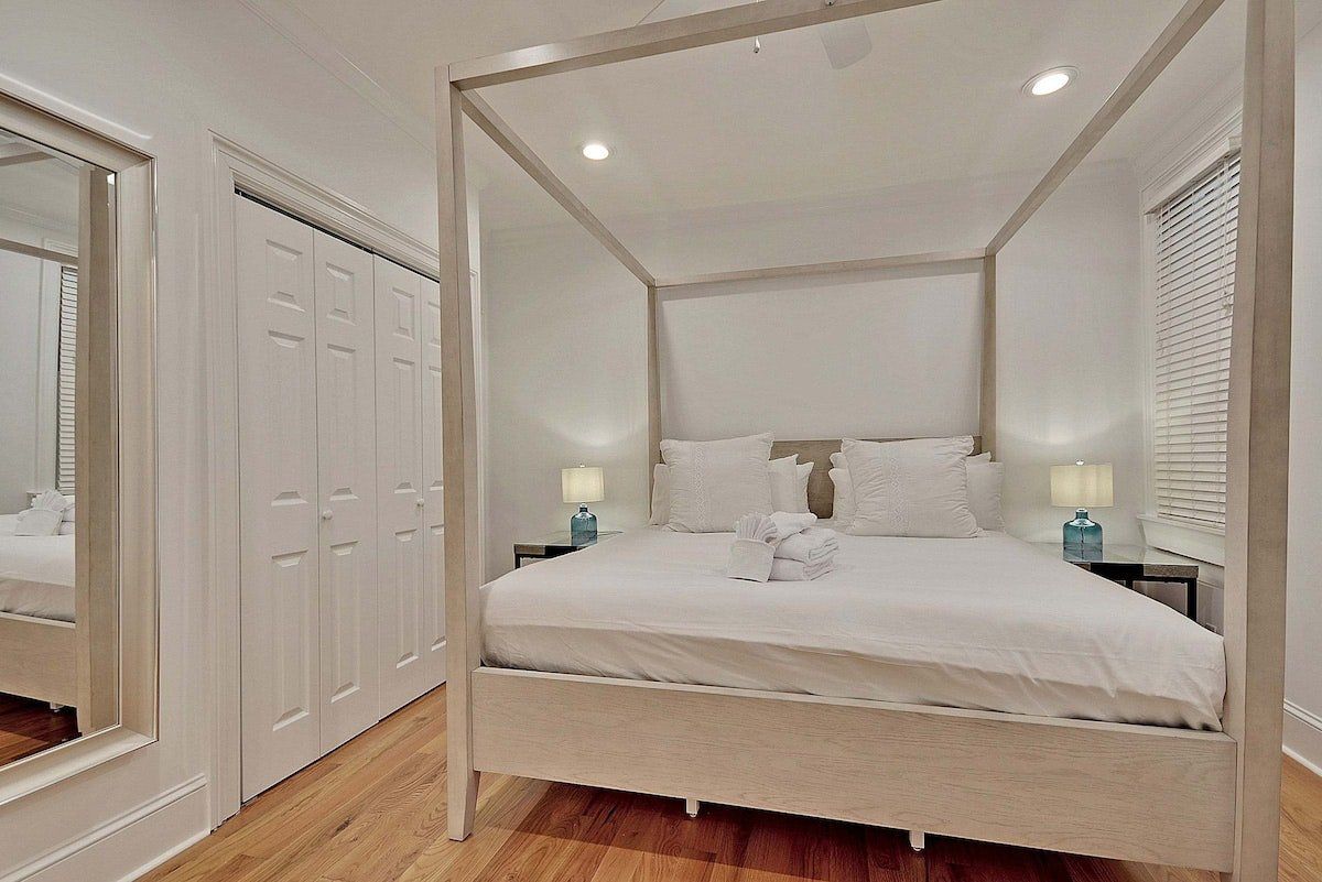 Welcome to small but charming Charleston, once again topping Condé Nast Traveler's Readers' Choice Awards. Whether you’re here to explore its colonial architecture, tuck into excellent Creole and BBQ food or savour the blossoming cocktail scene, you’re going to need somewhere to stay smack bang in the heart of the buzz. This home offers this plus elegantly designed spaces, a fully equipped kitchen and – best of all – en-suite shower rooms in al four bedrooms. The open-plan living and dining area is on the cosy side and ideal for a group of four to six guests, with plush grey sofas, velvet bar stools and a humming vintage-style ceiling fan for that quintessential Southern vibe.