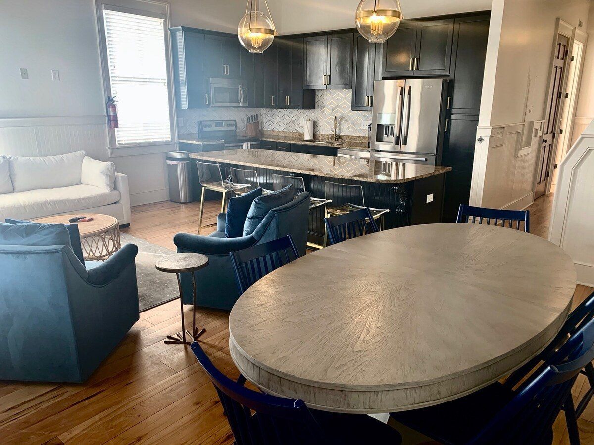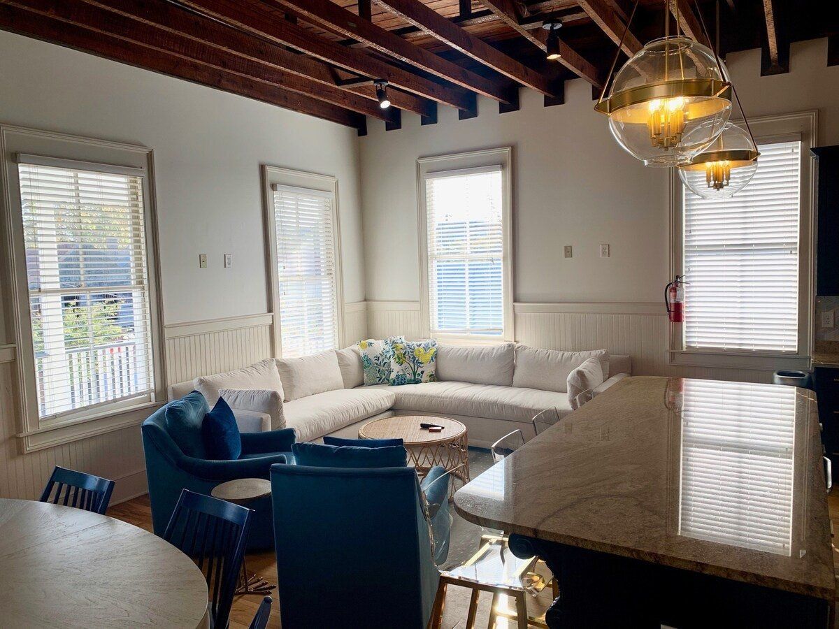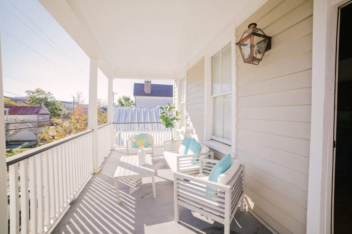 On a picturesque street of swaying palm trees sits this traditional Victorian home. Built in 1885, it has a square, symmetrical exterior, covered porches, high ceilings and exposed beams. Inside, however, the home has been brought bang up to date. A modern kitchen with moody cabinets set the tone for this family home, which casually blends past and present design styles. The living area is just big enough to comfortably seat its eight guests andthere's a wonderful outdoor porch. Upper King Street, with its wide selection of restaurants, bars and shops, is just one block away. Historic downtown Charleston is a little farther away but is no less accessible. Hop in a taxi to be there in moments or make the short twenty-minute walk to admire the city’s rich history.