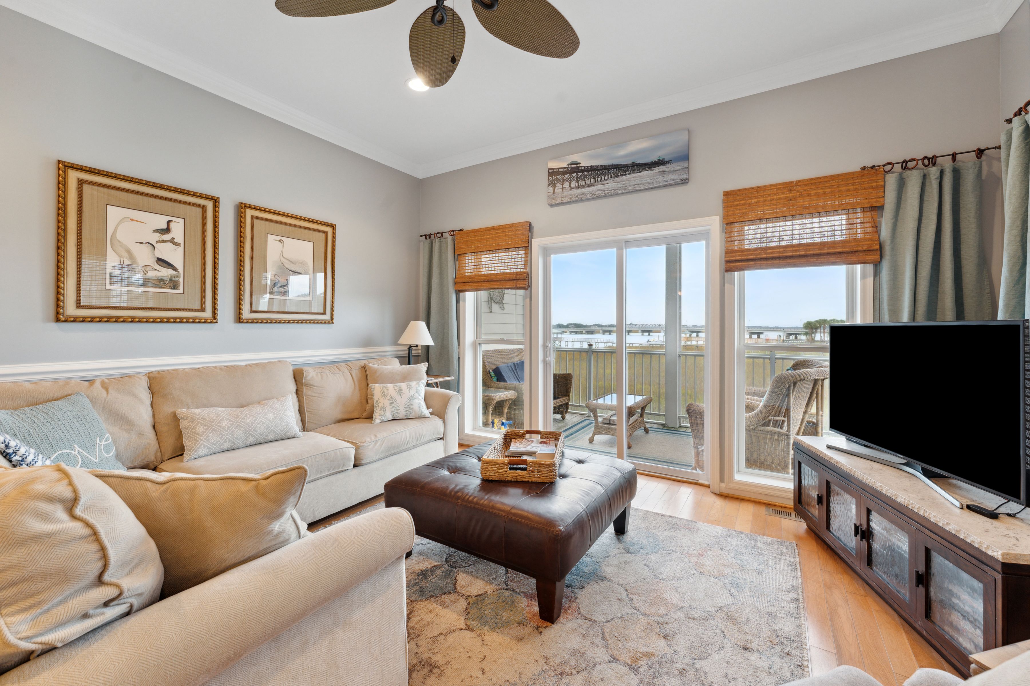 This waterfront retreat is in a beloved location on Folly Beach, facing Ashley River. Admire sunrises, sunsets, and beautiful water views – see if you can spot dolphins – from the sun porch and gazebo. When you’re not admiring the view, you can explore the area on foot or by bike – your host generously provides bikes as well as kayaks and a paddleboard. You can also fish and crab from the dock. The house is perfect for a family, with a cosy living space, a fully equipped kitchen, and three beautiful bedrooms. Historic Charleston is just a twenty-minute drive away.