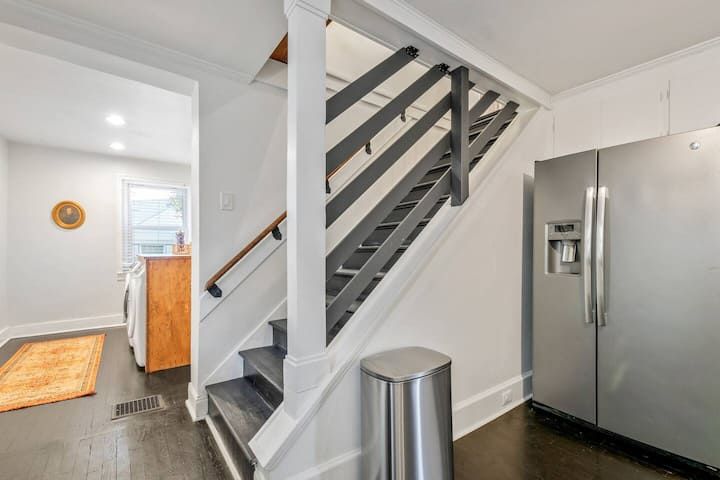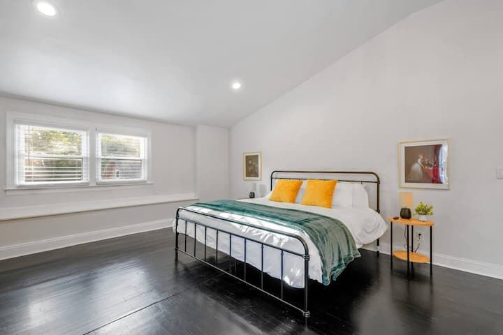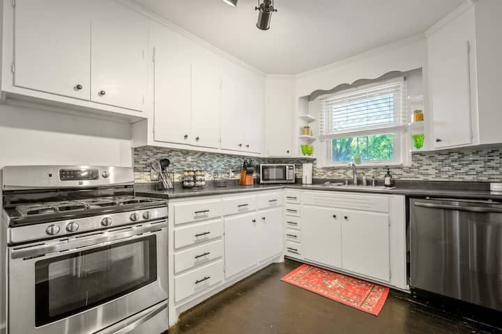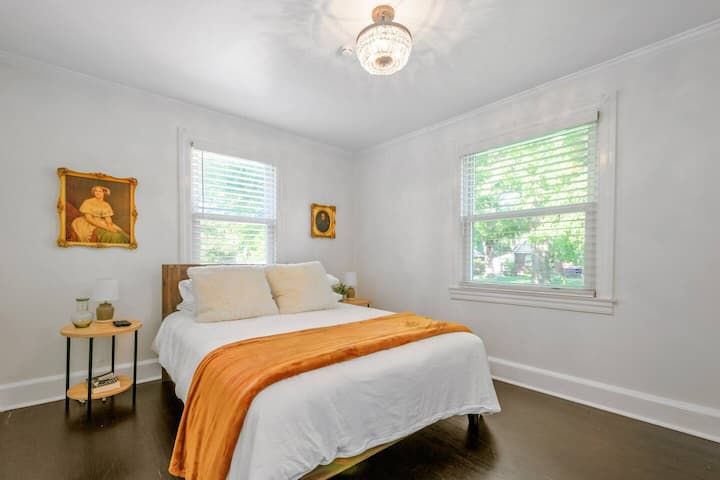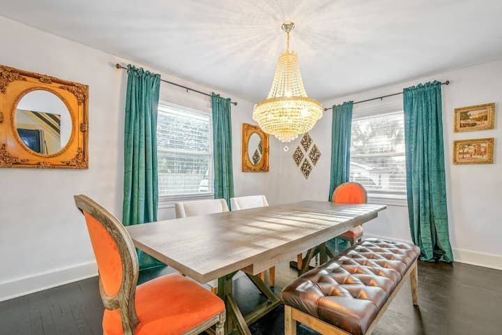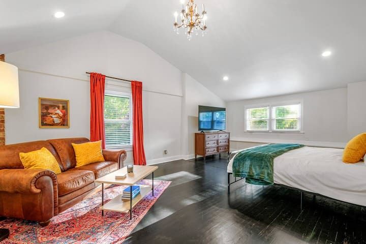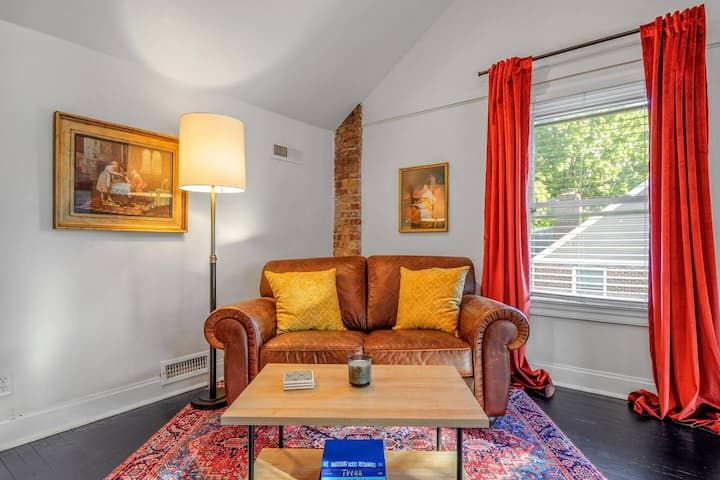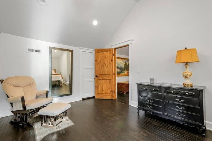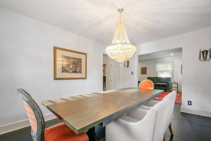 In the southern suburbs of Nashville, this charming home dates back to the 1940s and retains the feel of an early 20th-century mansion. You’re a twelve-minute drive from the sights and sounds of Broadway and can return to a quiet spot after a night in honky tonk music venues.