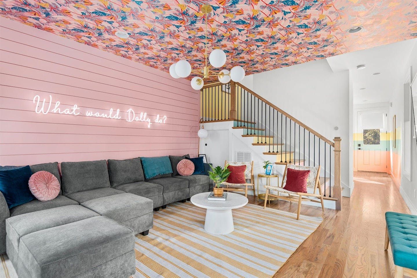 “What would Dolly do?” reads the neon writing in this homage to the Queen of Country. Well, she’d probably start with a glass of something bubbly on the rooftop champagne bar before heading into the heart of Nashville’s music and bar scene – Broadway – a ten-minute walk away. Just like Dolly herself, this home is brimming with character and charm. The living room in candyfloss pink has a huge sectional sofa for the group to gather on and the bright motif continues into the rainbow-walled kitchen. Bedrooms have been designed with groups of close friends in mind, with luxurious bunkbeds sitting alongside sprawling doubles. The Dolly Suite is a riot of mid-century chic touches and even the books in the bunkbed room have been arranged into a rainbow. The media room at the top of the home is the perfect spot for an evening screening of 9 to 5, and it leads out to the rooftop “champagne bar” – the terrace overlooking the neighbourhood roofs, furnished with a wine fridge and full wet bar. Sorry Dolly, it looks like you were wrong, turns out you don’t have to put up with the rain to get the rainbow.