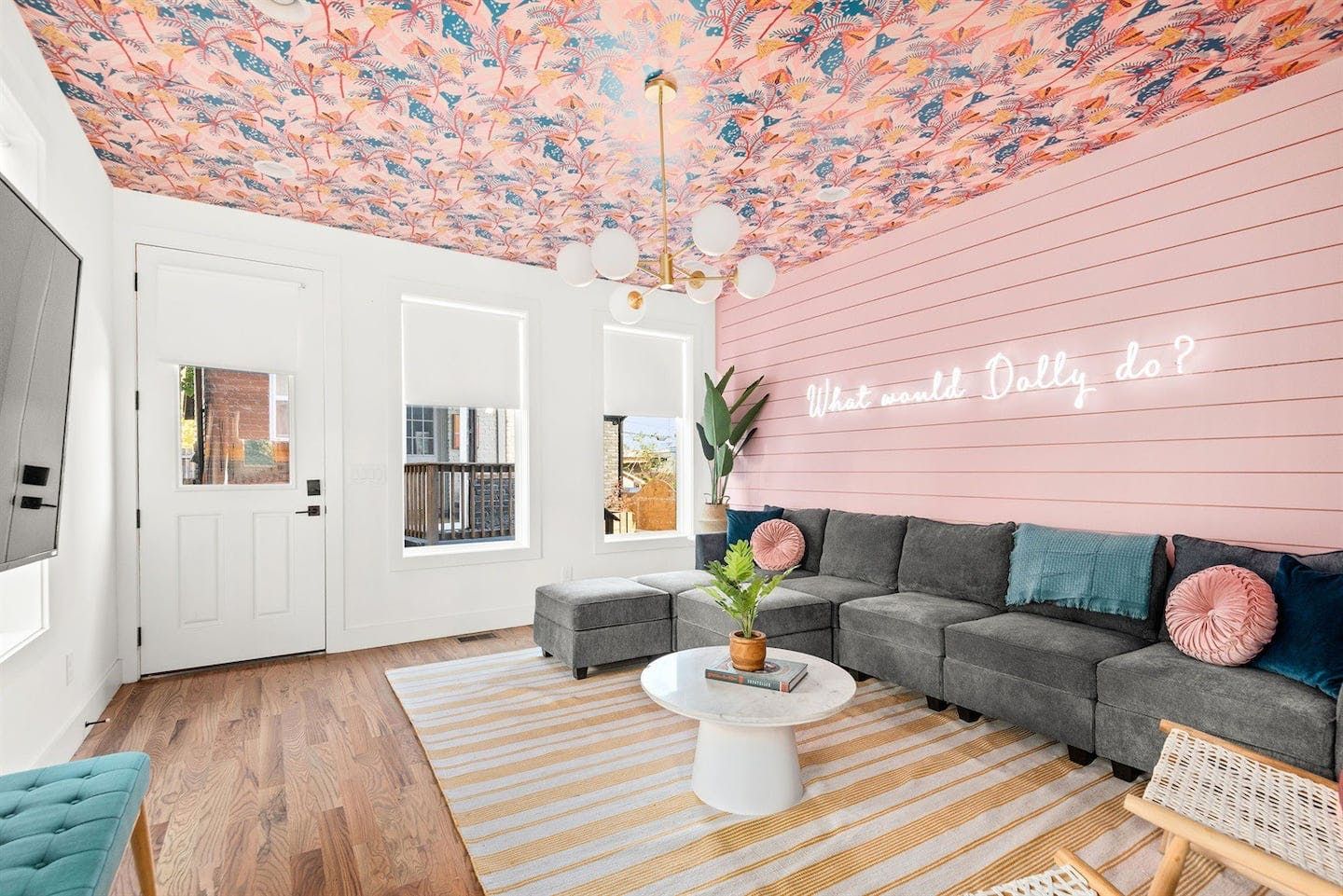 “What would Dolly do?” reads the neon writing in this homage to the Queen of Country. Well, she’d probably start with a glass of something bubbly on the rooftop champagne bar before heading into the heart of Nashville’s music and bar scene – Broadway – a ten-minute walk away. Just like Dolly herself, this home is brimming with character and charm. The living room in candyfloss pink has a huge sectional sofa for the group to gather on and the bright motif continues into the rainbow-walled kitchen. Bedrooms have been designed with groups of close friends in mind, with luxurious bunkbeds sitting alongside sprawling doubles. The Dolly Suite is a riot of mid-century chic touches and even the books in the bunkbed room have been arranged into a rainbow. The media room at the top of the home is the perfect spot for an evening screening of 9 to 5, and it leads out to the rooftop “champagne bar” – the terrace overlooking the neighbourhood roofs, furnished with a wine fridge and full wet bar. Sorry Dolly, it looks like you were wrong, turns out you don’t have to put up with the rain to get the rainbow.