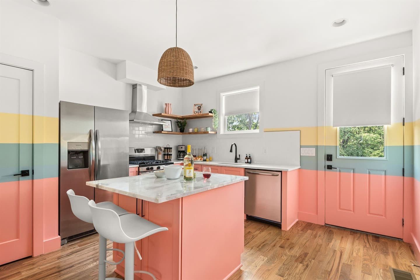 “What would Dolly do?” reads the neon writing in this homage to the Queen of Country. Well, she’d probably start with a glass of something bubbly on the rooftop champagne bar before heading into the heart of Nashville’s music and bar scene – Broadway – a ten-minute walk away. Just like Dolly herself, this home is brimming with character and charm. The living room in candyfloss pink has a huge sectional sofa for the group to gather on and the bright motif continues into the rainbow-walled kitchen. Bedrooms have been designed with groups of close friends in mind, with luxurious bunkbeds sitting alongside sprawling doubles. The Dolly Suite is a riot of mid-century chic touches and even the books in the bunkbed room have been arranged into a rainbow. The media room at the top of the home is the perfect spot for an evening screening of 9 to 5, and it leads out to the rooftop “champagne bar” – the terrace overlooking the neighbourhood roofs, furnished with a wine fridge and full wet bar. Sorry Dolly, it looks like you were wrong, turns out you don’t have to put up with the rain to get the rainbow.
