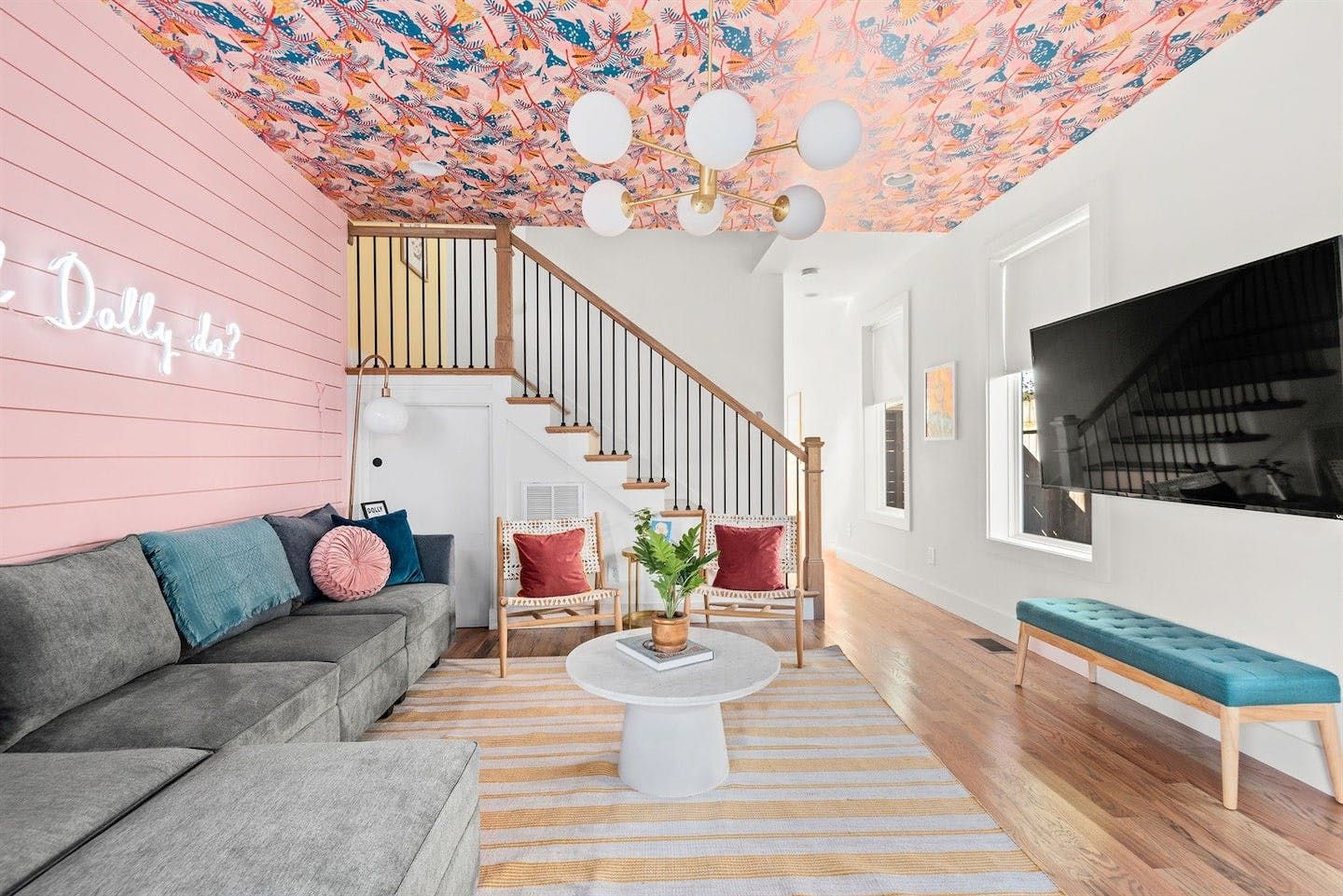 “What would Dolly do?” reads the neon writing in this homage to the Queen of Country. Well, she’d probably start with a glass of something bubbly on the rooftop champagne bar before heading into the heart of Nashville’s music and bar scene – Broadway – a ten-minute walk away. Just like Dolly herself, this home is brimming with character and charm. The living room in candyfloss pink has a huge sectional sofa for the group to gather on and the bright motif continues into the rainbow-walled kitchen. Bedrooms have been designed with groups of close friends in mind, with luxurious bunkbeds sitting alongside sprawling doubles. The Dolly Suite is a riot of mid-century chic touches and even the books in the bunkbed room have been arranged into a rainbow. The media room at the top of the home is the perfect spot for an evening screening of 9 to 5, and it leads out to the rooftop “champagne bar” – the terrace overlooking the neighbourhood roofs, furnished with a wine fridge and full wet bar. Sorry Dolly, it looks like you were wrong, turns out you don’t have to put up with the rain to get the rainbow.