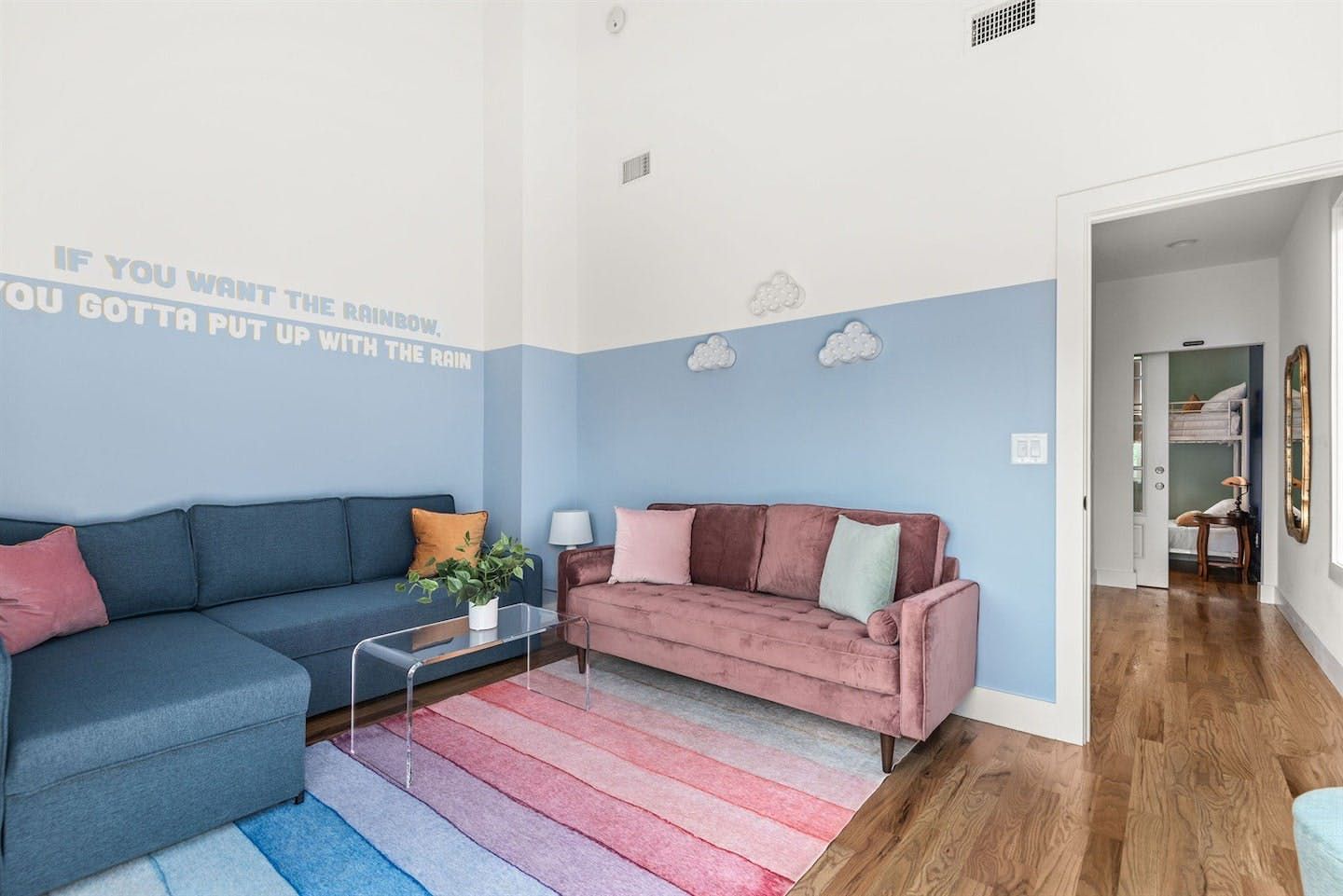 “What would Dolly do?” reads the neon writing in this homage to the Queen of Country. Well, she’d probably start with a glass of something bubbly on the rooftop champagne bar before heading into the heart of Nashville’s music and bar scene – Broadway – a ten-minute walk away. Just like Dolly herself, this home is brimming with character and charm. The living room in candyfloss pink has a huge sectional sofa for the group to gather on and the bright motif continues into the rainbow-walled kitchen. Bedrooms have been designed with groups of close friends in mind, with luxurious bunkbeds sitting alongside sprawling doubles. The Dolly Suite is a riot of mid-century chic touches and even the books in the bunkbed room have been arranged into a rainbow. The media room at the top of the home is the perfect spot for an evening screening of 9 to 5, and it leads out to the rooftop “champagne bar” – the terrace overlooking the neighbourhood roofs, furnished with a wine fridge and full wet bar. Sorry Dolly, it looks like you were wrong, turns out you don’t have to put up with the rain to get the rainbow.