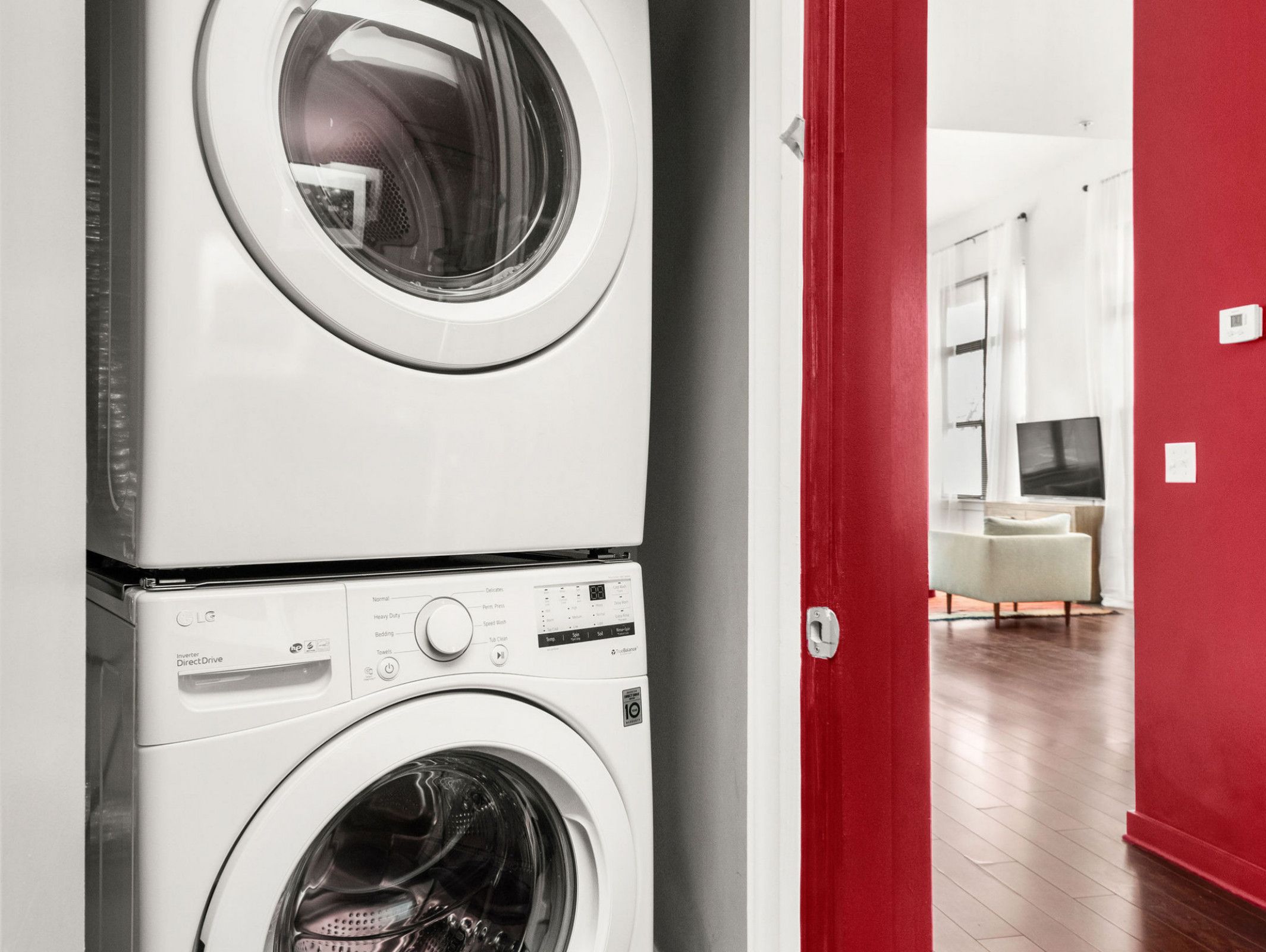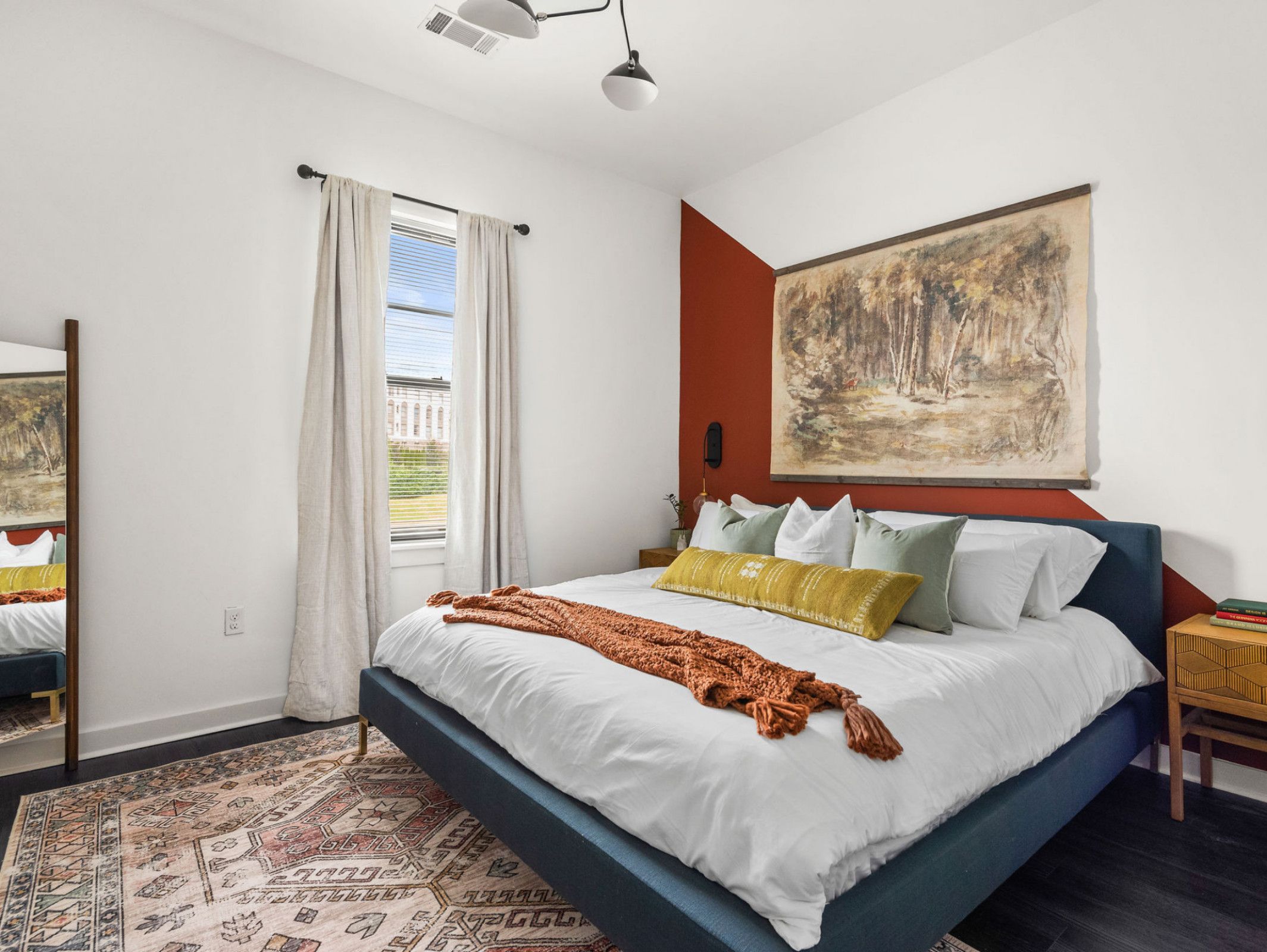 This unique home adds a splash of colour with the bright red walls throughout the hallway, combined with the sleek white walls and cosy decor within the living space. Enjoy morning cups of coffee on the patio that overlooks the iconic Music Row, followed by a delicious homecooked breakfast – enjoy it together at the wooden dining table by the windows.