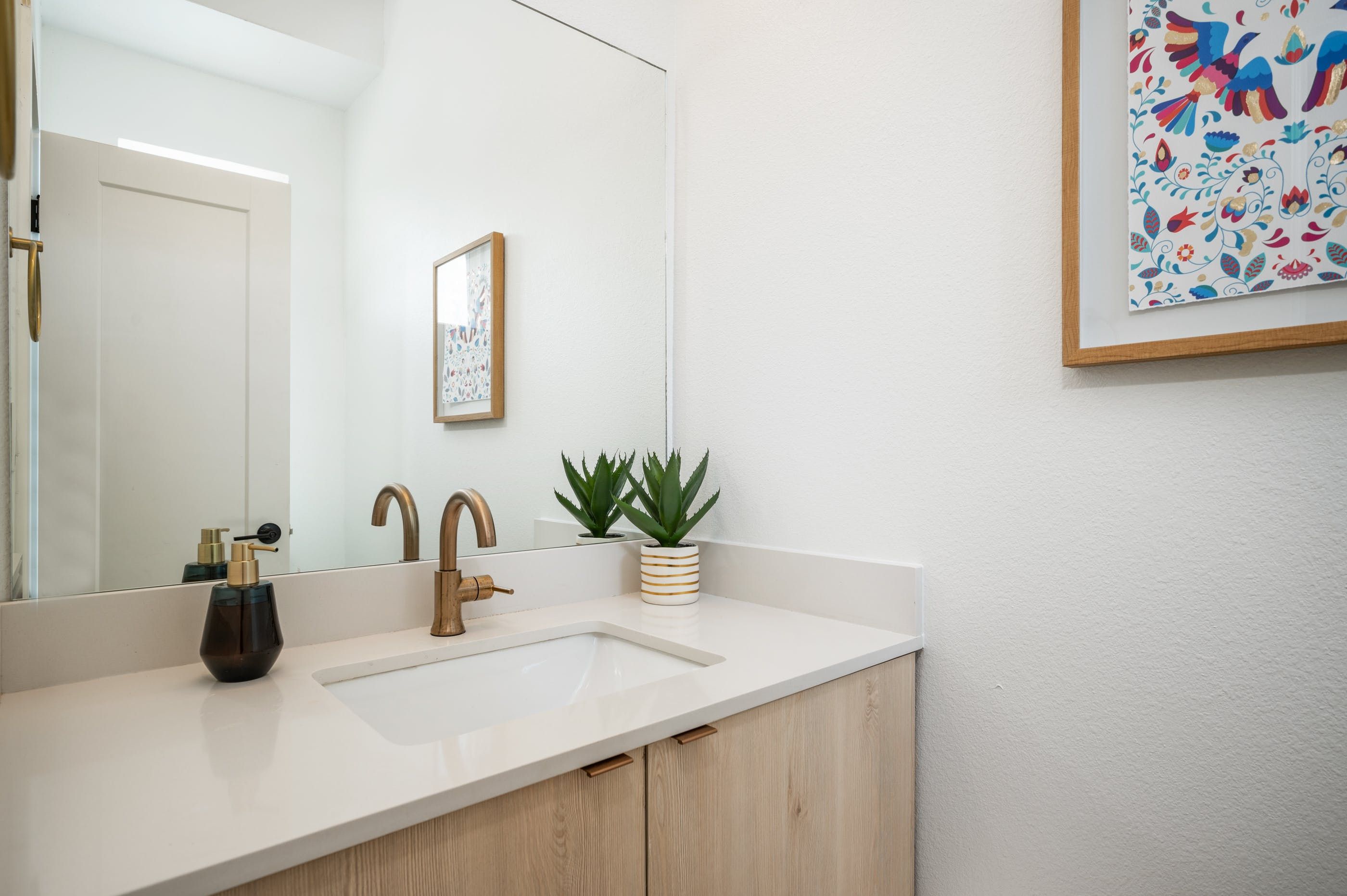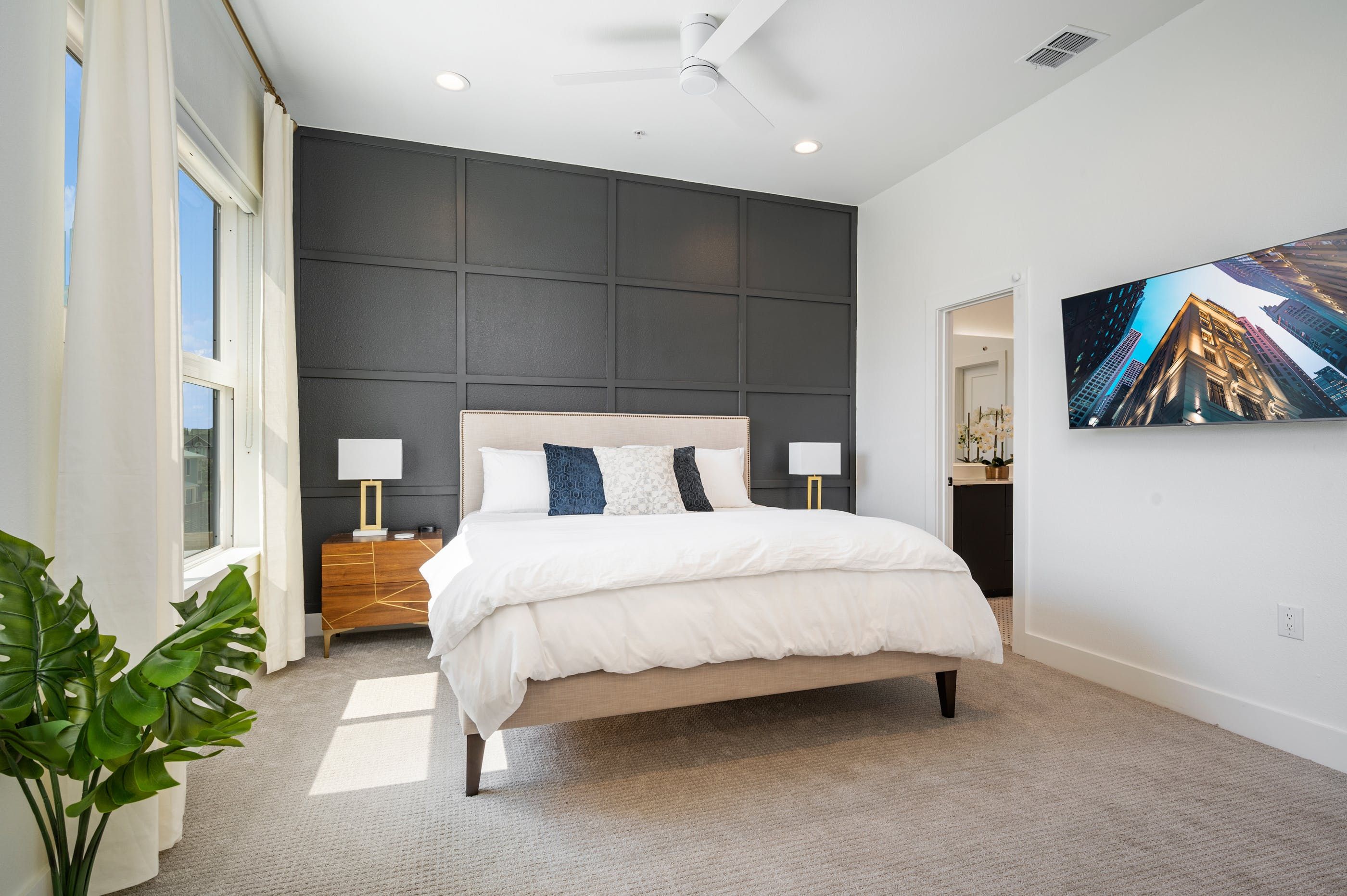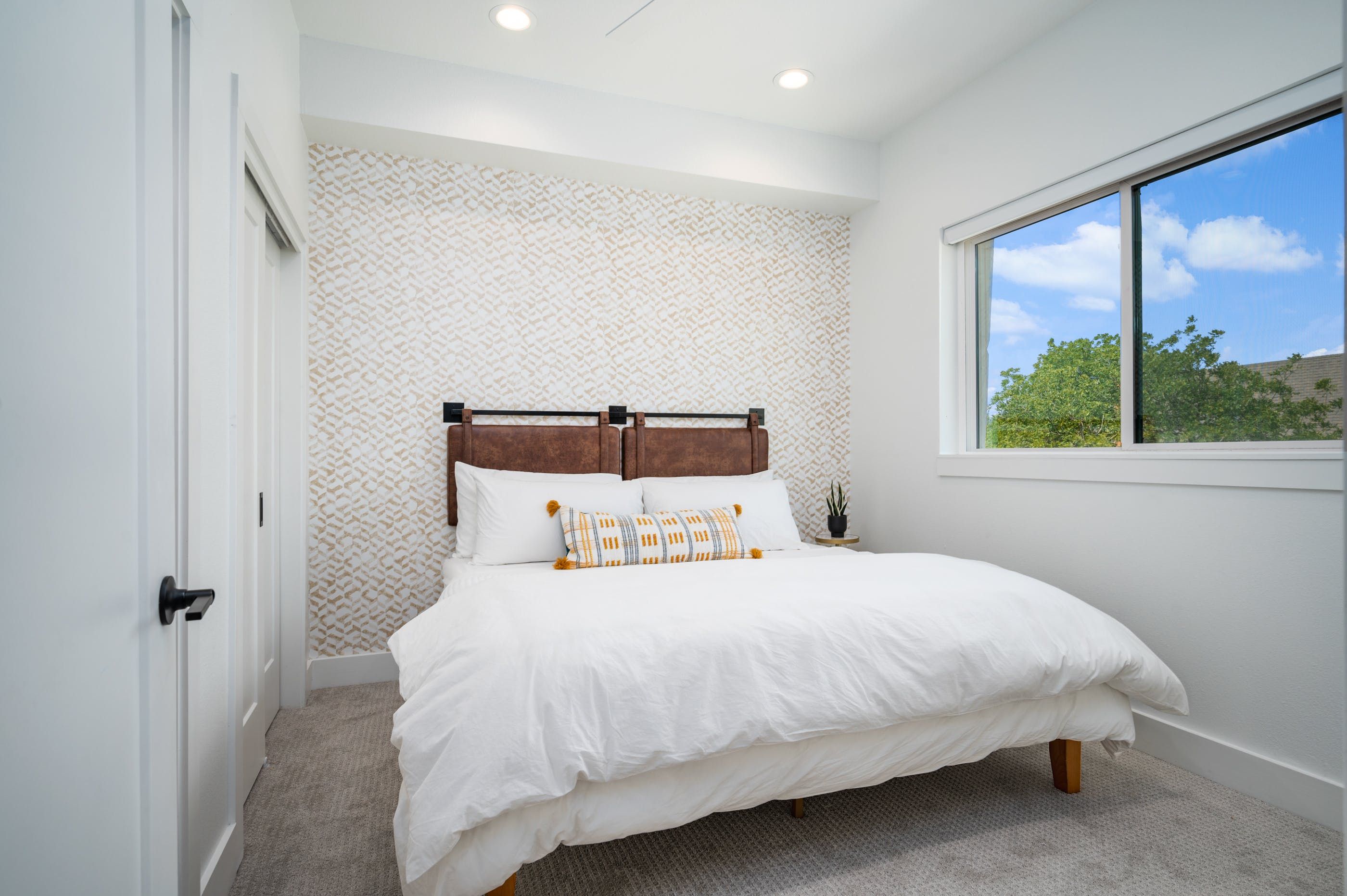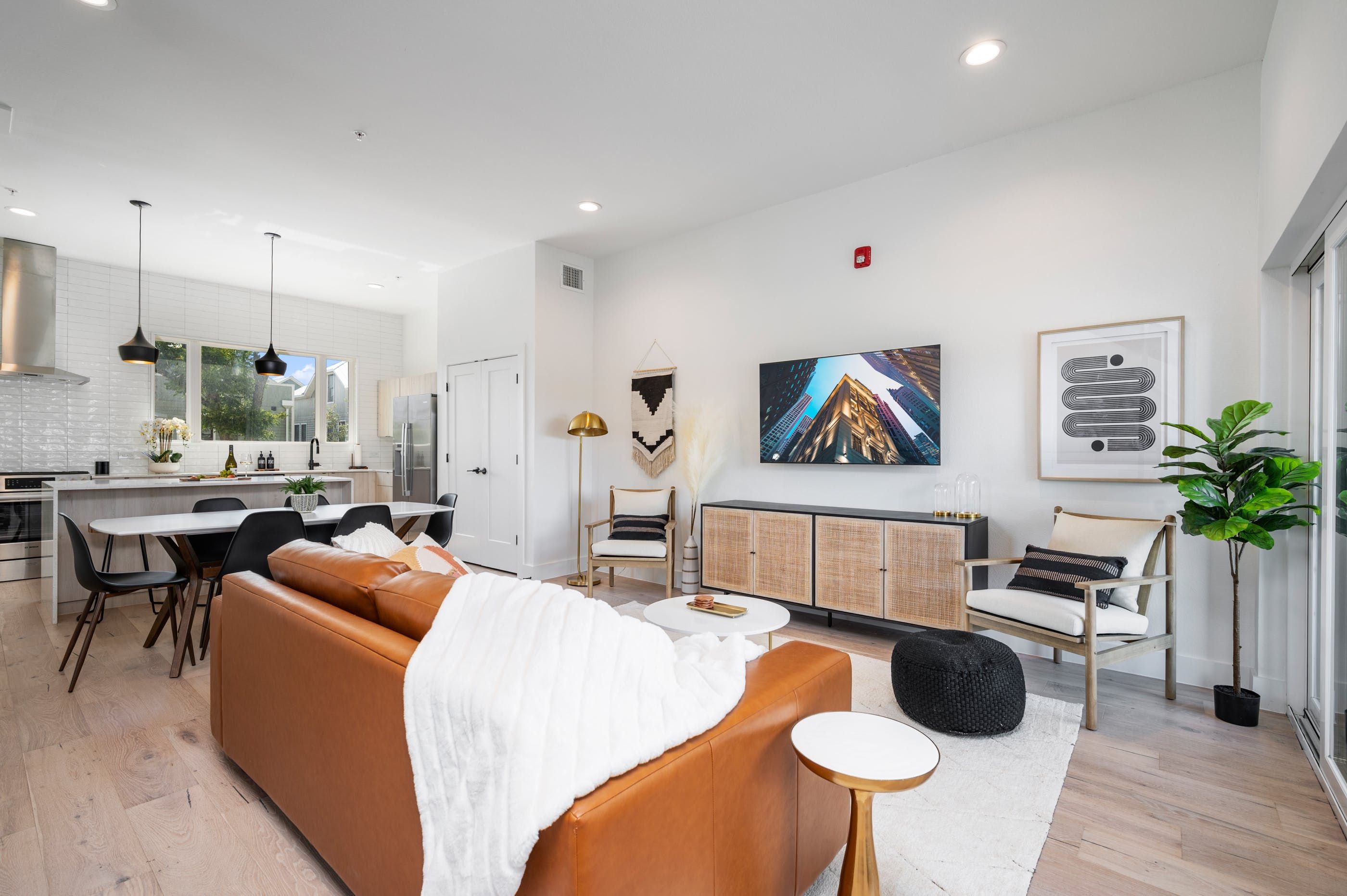 This stylish townhouse shines as the daylight pours in through the windows, lighting up the crisp white walls and contemporary furnishings. Snuggle up on the sofa to watch the latest movie release on Netflix, or binge a brand new series on Hulu. There's a gorgeous seating area, fitted with a verdant feature wall and cosy chairs with a lovely view of the outdoors – the perfect nook for an afternoon of reading.