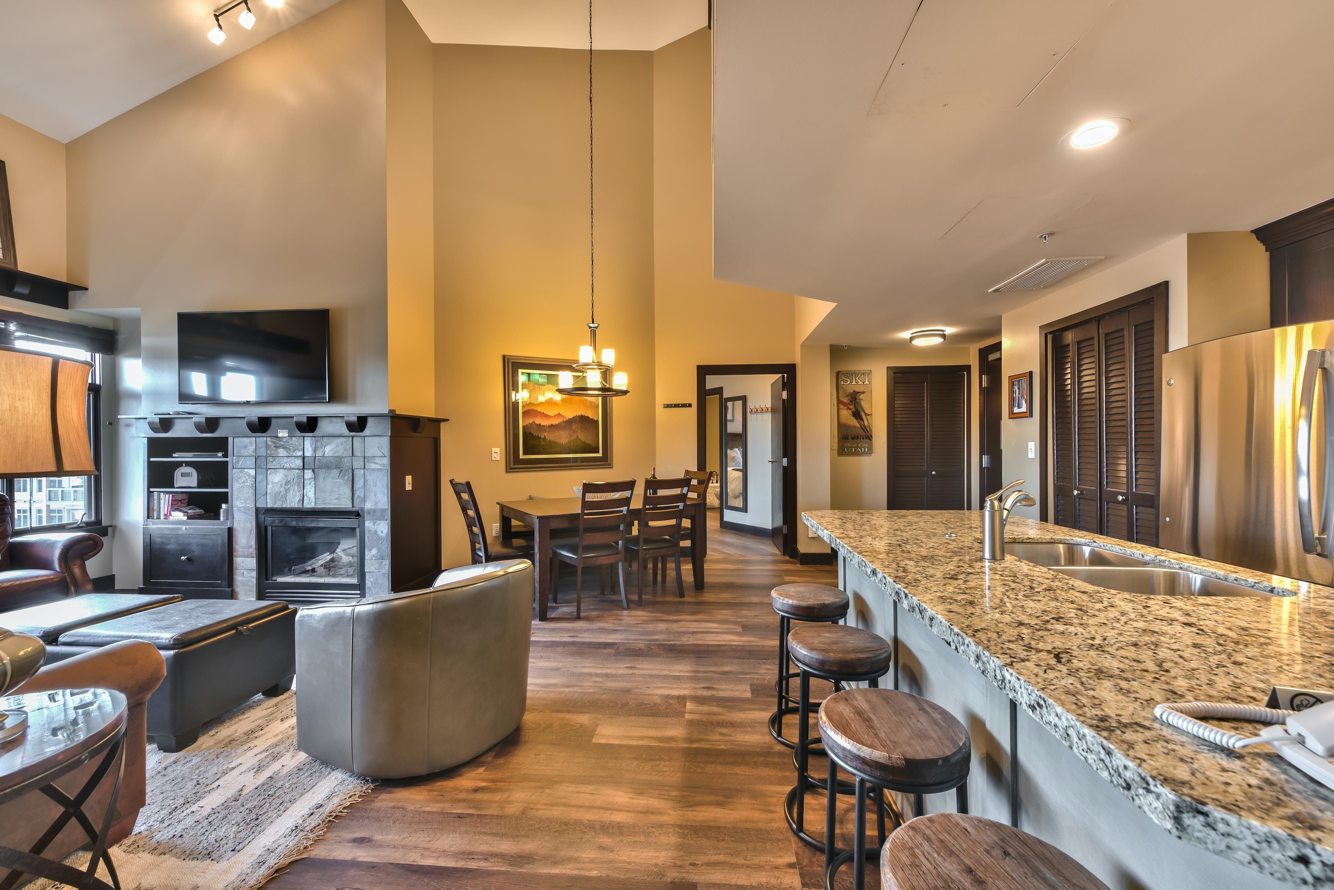 Wake to the sight of snow-dusted peaks and step straight out into the heart of Park City. This sprawling home places you above the buzz of the resort plaza with gondolas, ski school, après-ski bars and summer concerts right outside your door. After days on the mountain, whether skiing, boarding, hiking or biking, retreat to your own private haven. Gather around the fire, sink into deep soaking tubs, or take in the music of the spring and summer concert series from your balcony. With vaulted ceilings, generous living areas and luxury touches throughout, this is ski-in, ski-out living at its most spectacular.
