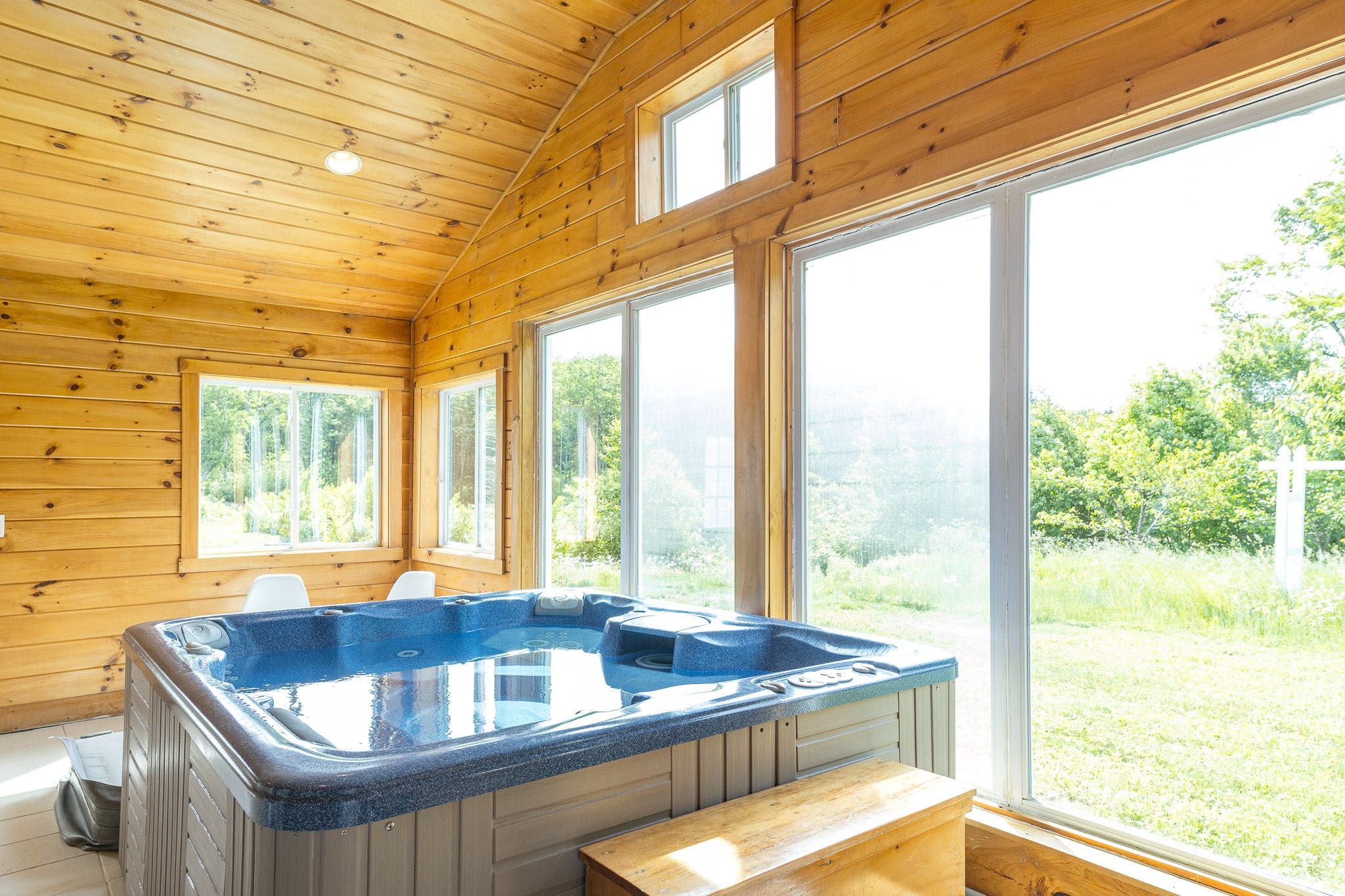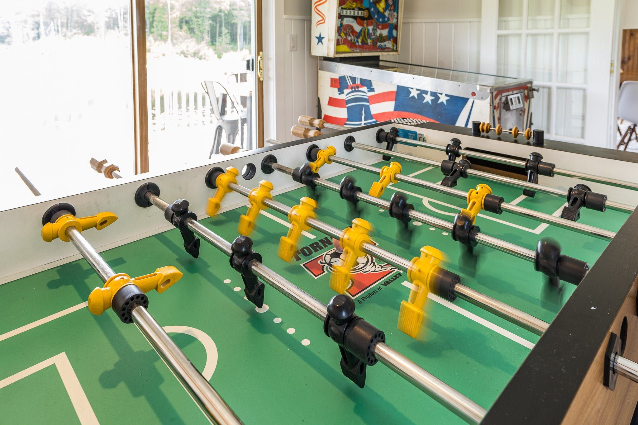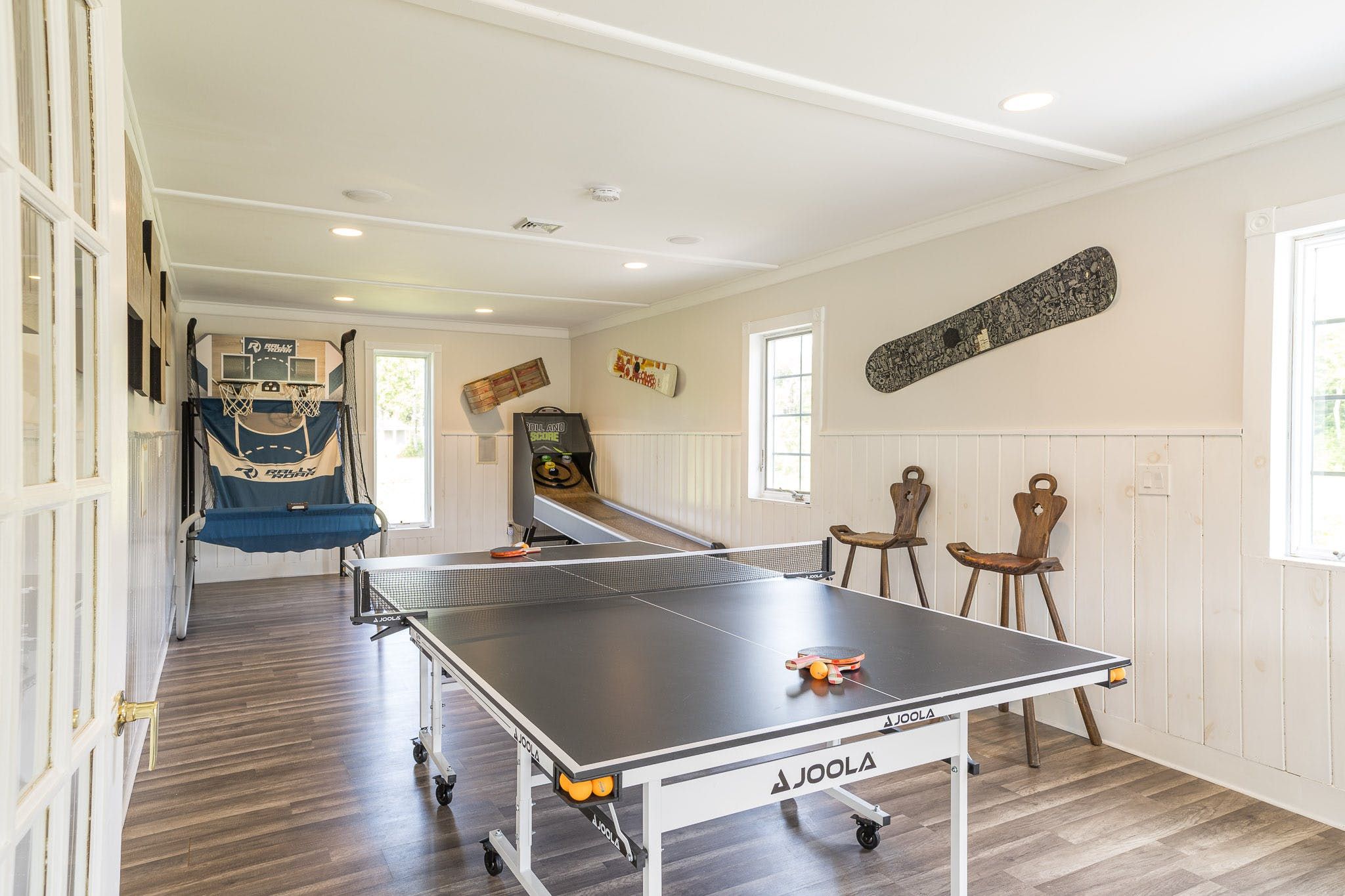 With an indoor hot tub, three covered porches (equipped with rocking chairs, a dining area and a barbecue), and a games room featuring a ping pong table, pop-a-shot, and skeeball – you'll have the recipe for a fun and nature-filled escape when staying here.