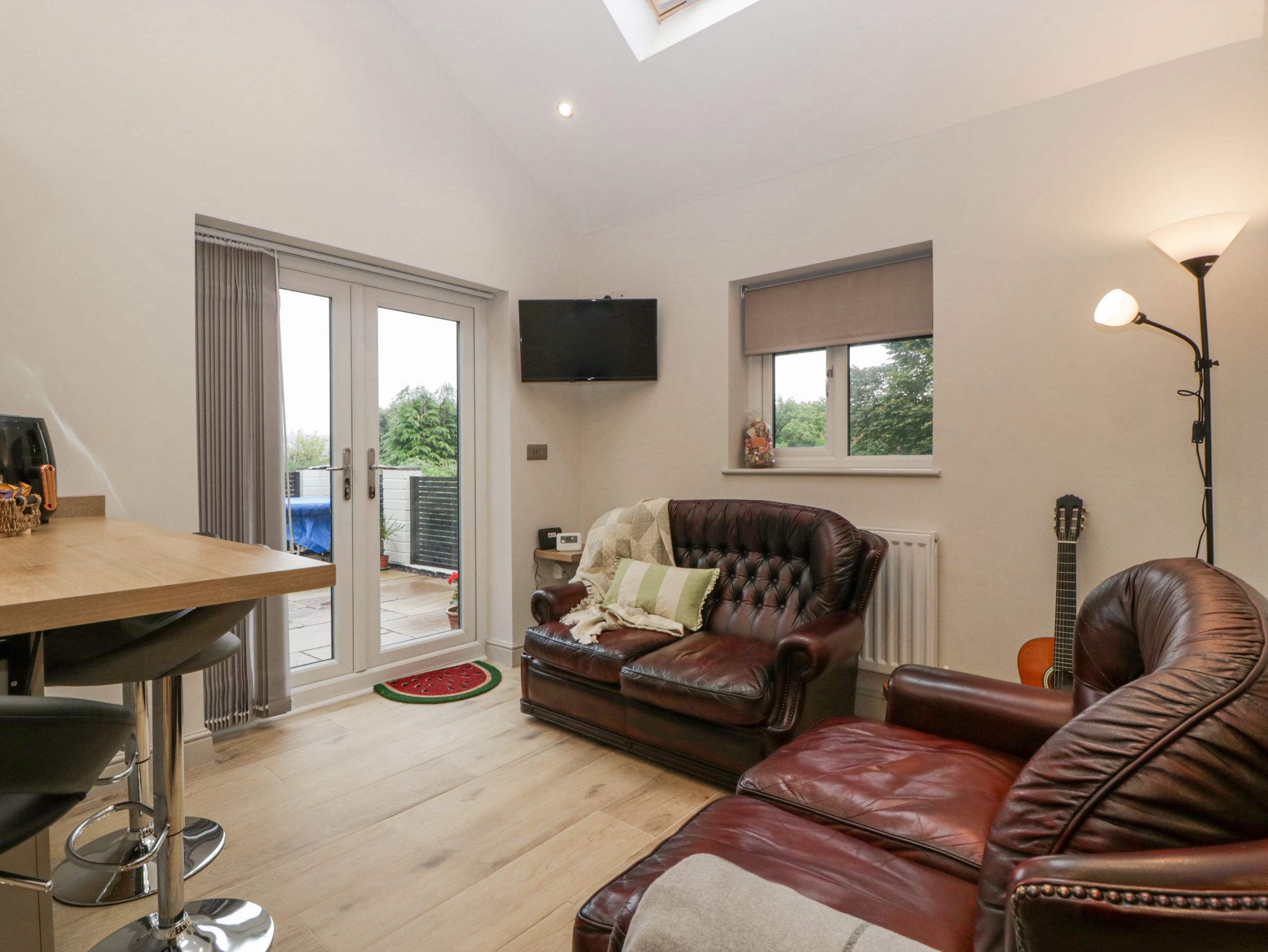 Holiday home Torino Lodge, a single-storey house, consists of an open-plan living space including a kitchen with electric oven and gas hob, microwave, fridge with ice box, and air fryer, a dining area, and a sitting area with TV. The bedrooms consist of two doubles, one with an en-suite walk-in shower. There is a shower room with walk-in shower, basin, and WC. Outside, there is a front patio with furniture, a patio terrace with furniture, plus off-road parking for two cars and one car parking space nearby. Two well-behaved dogs welcome. Sorry, no smoking. Shop and pub 0.2 miles, canal 1.2 miles. WiFi, fuel, power, bed linen and towels are all included in the price. Stay at Torino Lodge for your next picture-perfect holiday. Note: Ramp down to property. Please note: This property has a 3-night minimum stay, until October through til March. Please note: This property has a £20 per pet, per holiday supplementary charge