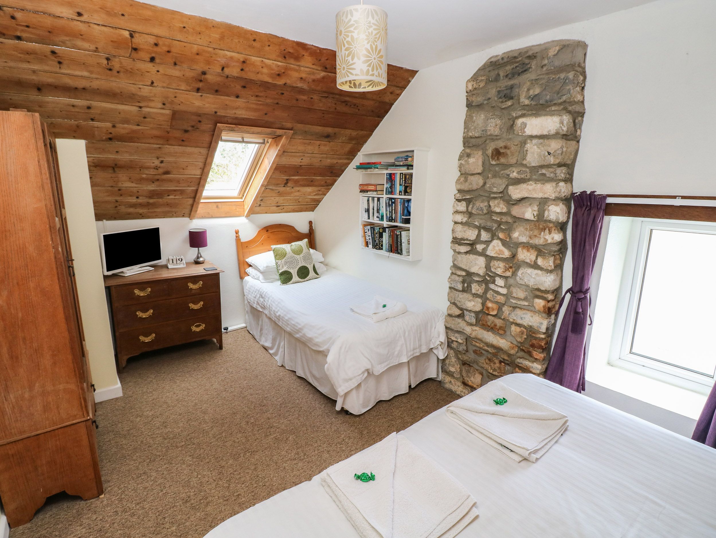 Accomodation Details Three bedrooms: 1 x family room with double (can be twin on request) and single with TV/DVD, 1 x double with TV/DVD, 1 x child's single. Ground-floor bathroom with bath, shower over, basin and WC. Upstairs shower room with walk-in shower, basin and WC. Kitchen/diner with woodburning stove. Games room with woodburning stove