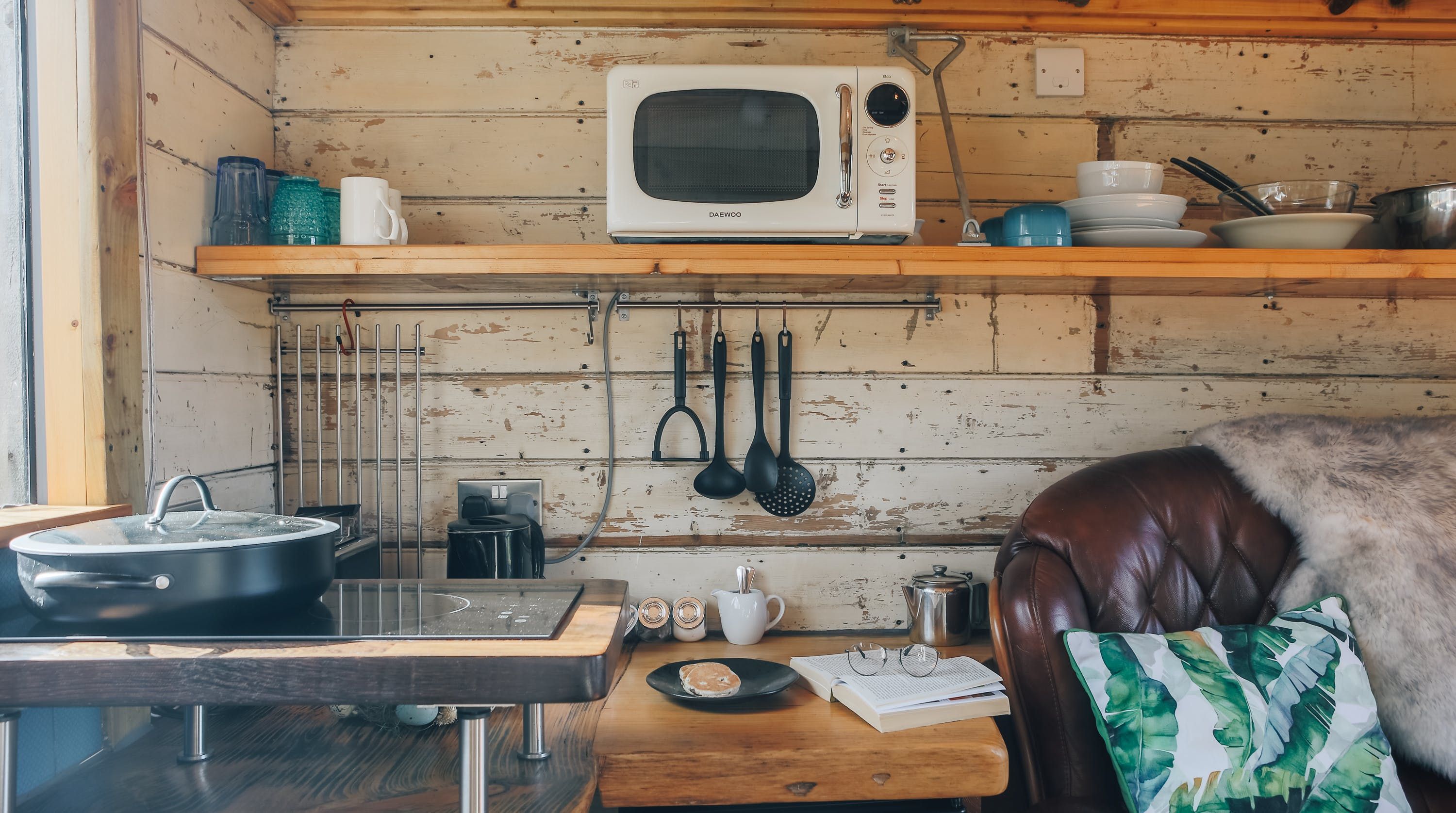 *The laptop-friendly desk doubles as the kitchen table in the cabin which is designed as a writer's retreat