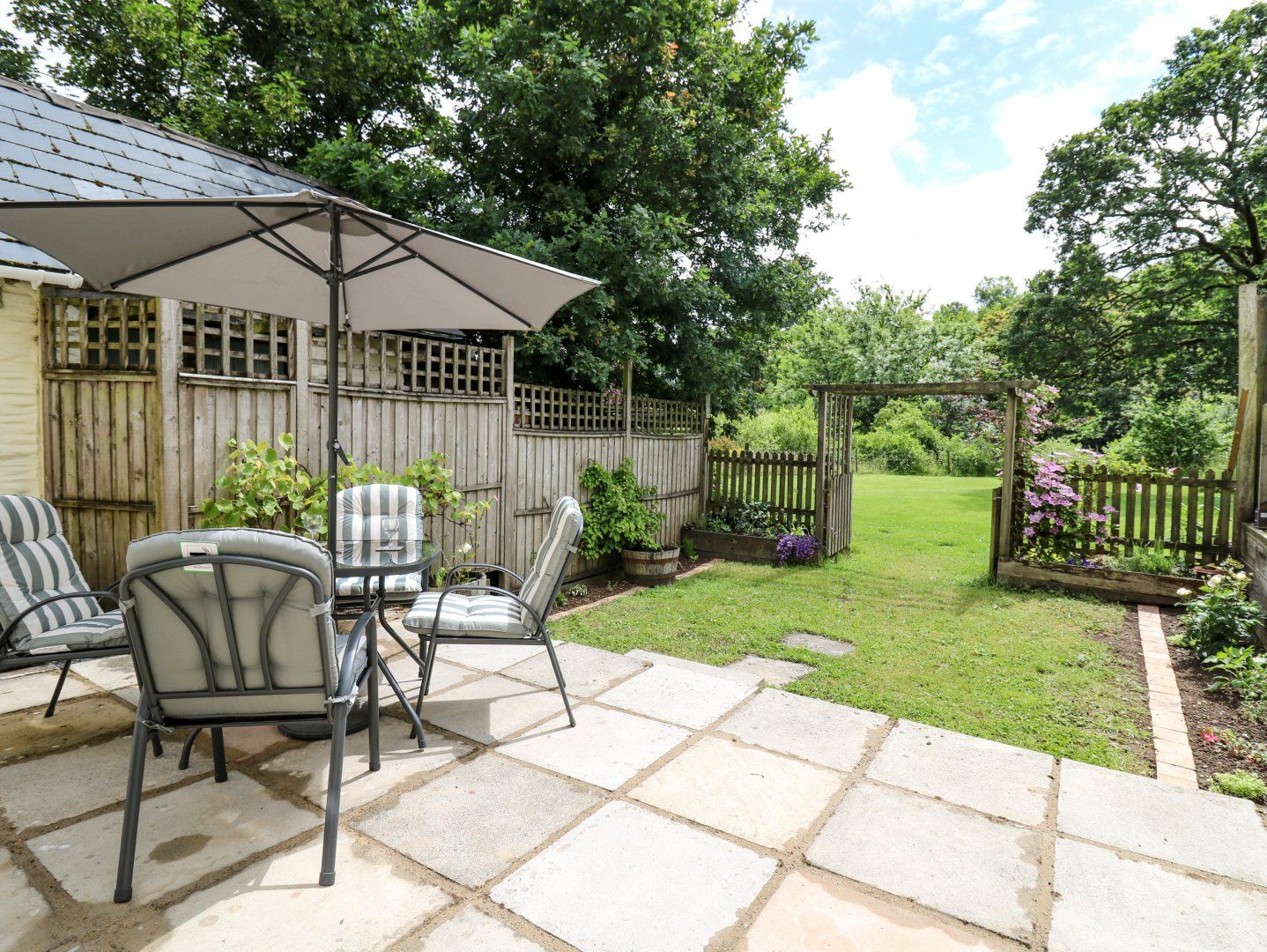 Amenities Gas central heating. Electric oven and gas hob, microwave, fridge/freezer, washing machine and TV with FreeSat. Fuel, power inc. in rent. Bed linen and towels inc. in rent. Off-road parking for 2 cars. Enclosed garden with lawn, patio and furniture. One small to medium (knee height) well-behaved dog welcome. Sorry, no smoking. Shop 0.9 miles, pub 0.8 miles.