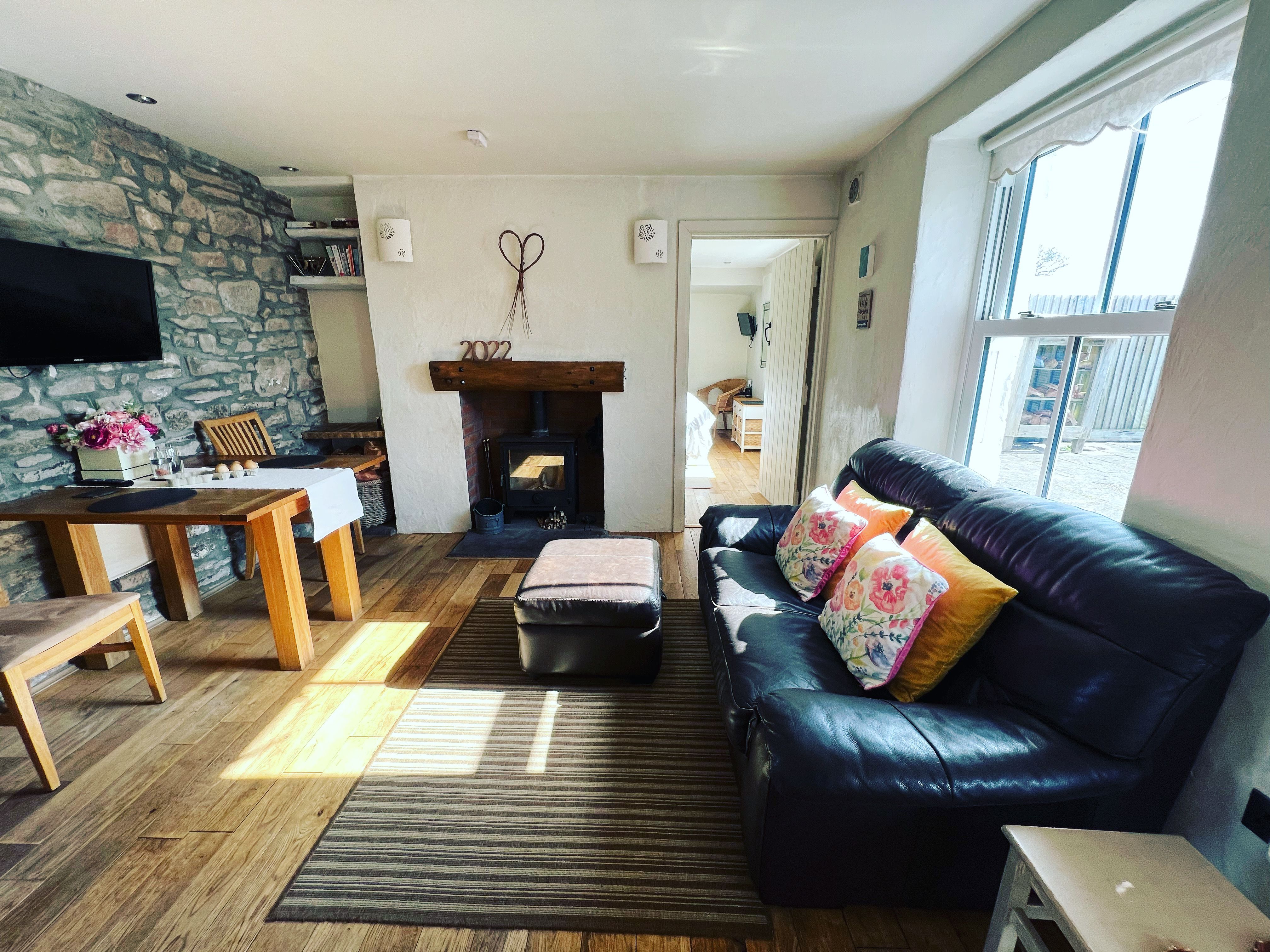Accomodation Details All ground floor. One king-size double bedroom with TV and en-suite WC. Separate shower room and open plan living, dining and sitting area. The fitted kitchen includes an integrated fridge/freezer, double oven, microwave and dishwasher. The dining table and chairs and the sofa are next to the cosy woodburner.