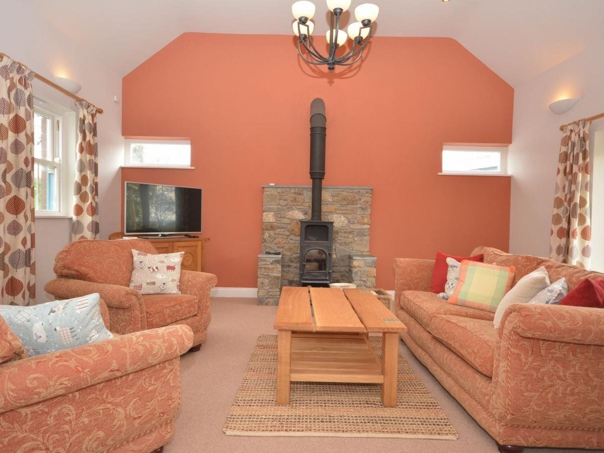 Inside, the cosy lounge is equipped with a wood burner, Smart TV, DVD player, a selection of books and games, and patio doors leading to the garden.