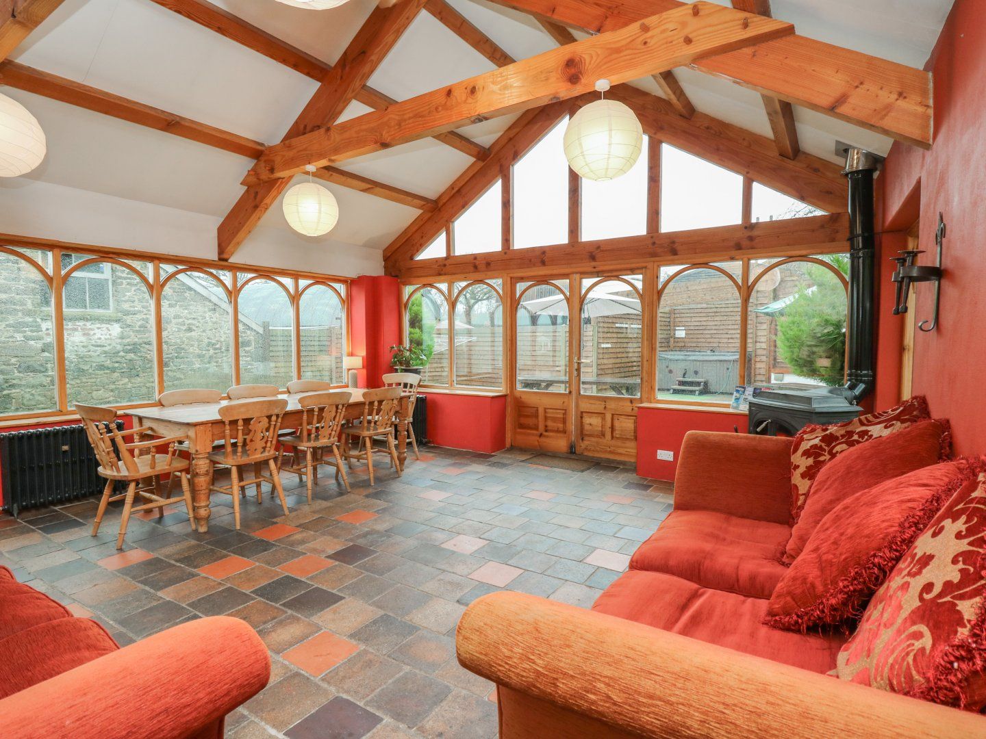 Accomodation Details Six bedrooms: 1 x ground floor king-size double with sofa, 1 x ground floor adult bunks, 1 x king-size double with en-suite whirlpool bath, basin and WC, 1 x double, 1 x single, 1 x family room with 1 double and 1 galleried single. Bathroom with bath, shower over, basin and WC. Ground floor basin and WC. Kitchen with breakfast area (seats 6). Utility. Sitting room with woodburner. Conservatory with sitting area (seats 8), dining area (seats 8) and woodburner. Shared games area with pool table and table tennis.